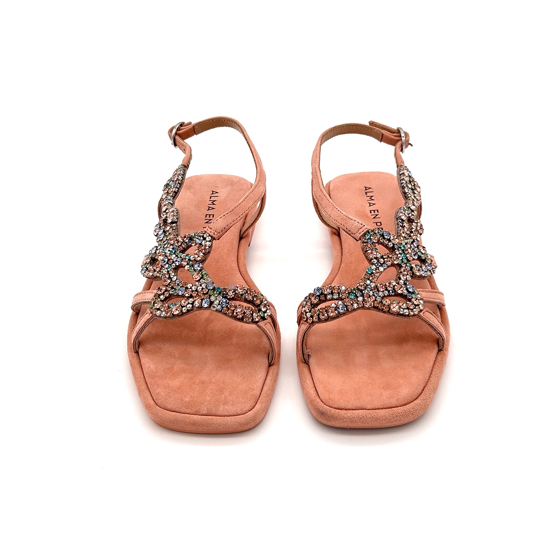 Sandalo basso realizzato in pelle scamosciata di colore rosa tenue. Tomaia disegno floreale con applicazioni gioiello. Cinturino con fibbia argentata. Altezza da terra di 2cm. Sottopiede morbido in pelle leggermente imbottita. Suola in gomma antiacqua e antiscivolo.