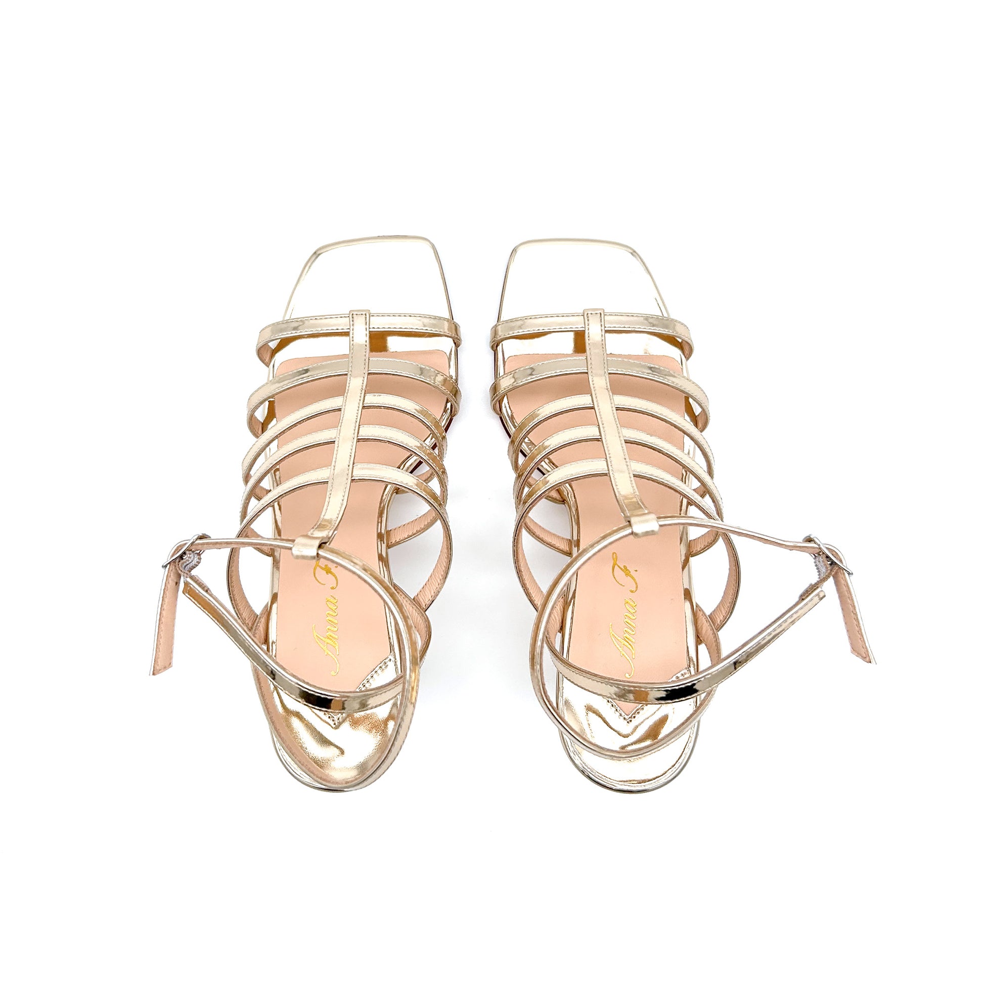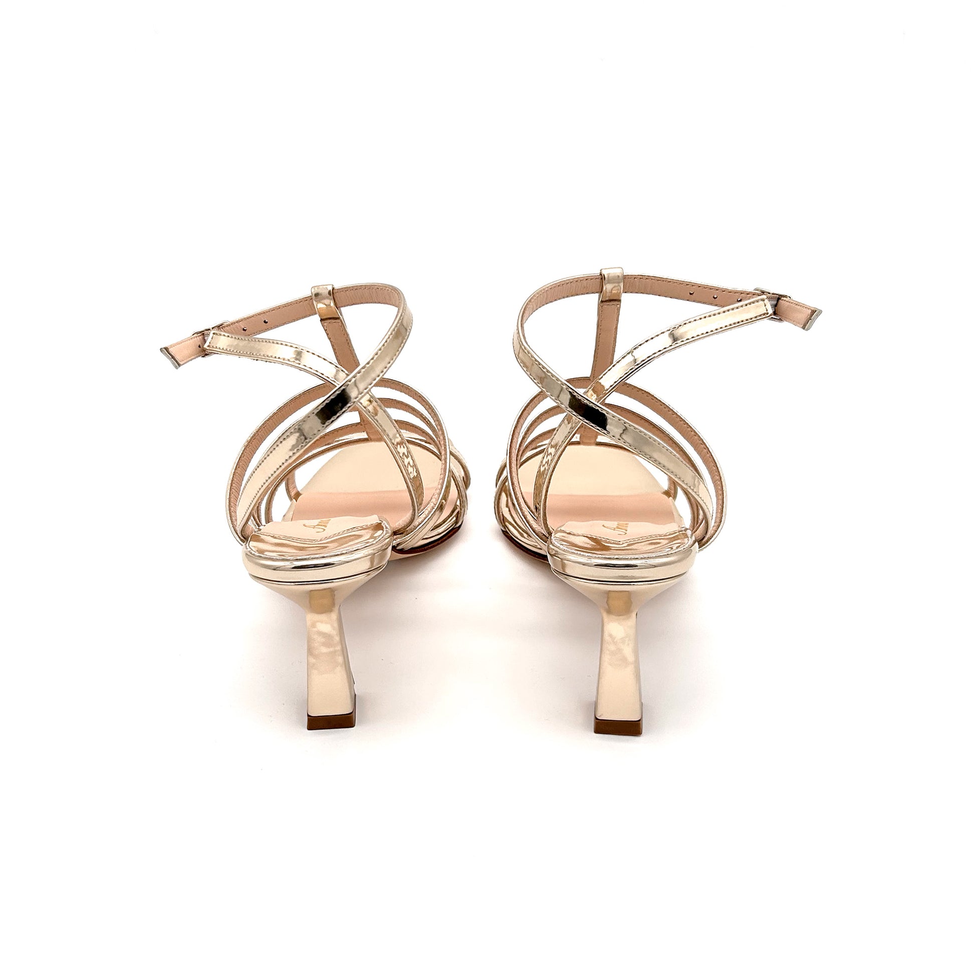 Sandalo con tacco di 9cm, realizzato in vernice colore platino. La forma a "t" e le strisce foderate in pelle raccolgono il piede avvolgendolo al meglio. Cinturino alla caviglia con fibbia argentata. Sottopiede in pelle. Suola in cuoio antiscivolo.