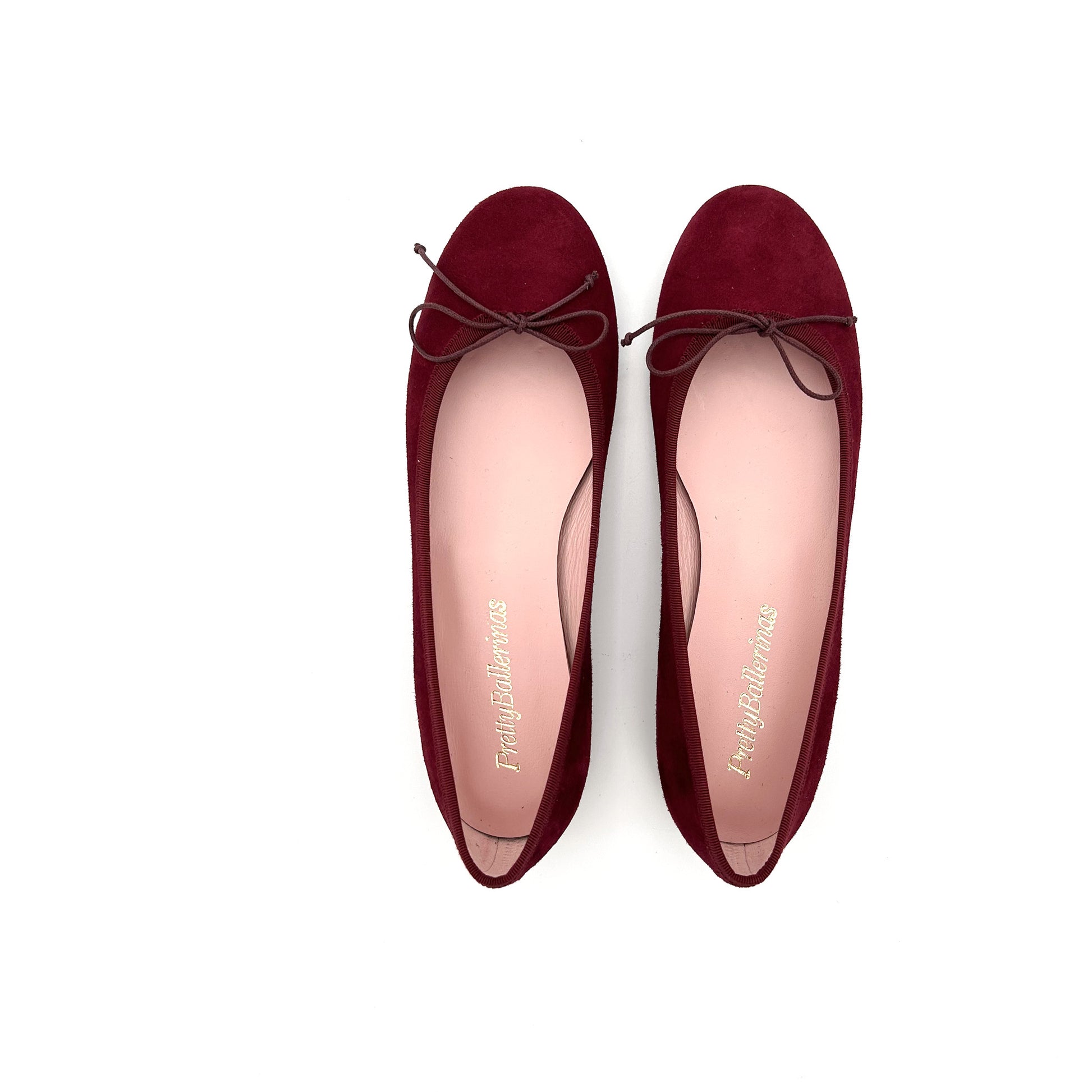 Ballerina flat con tacchetto di 1 centimetro con la classica punta a mandorla realizzata in pelle scamosciata color bordeaux. Ispirata a Marylin Monroe è la forma presente in collezione da più tempo. Bordatura superiore in tessuto tono su tono e fiocchetto in punta. Fondo in gomma e morbido sottopiede in pelle.