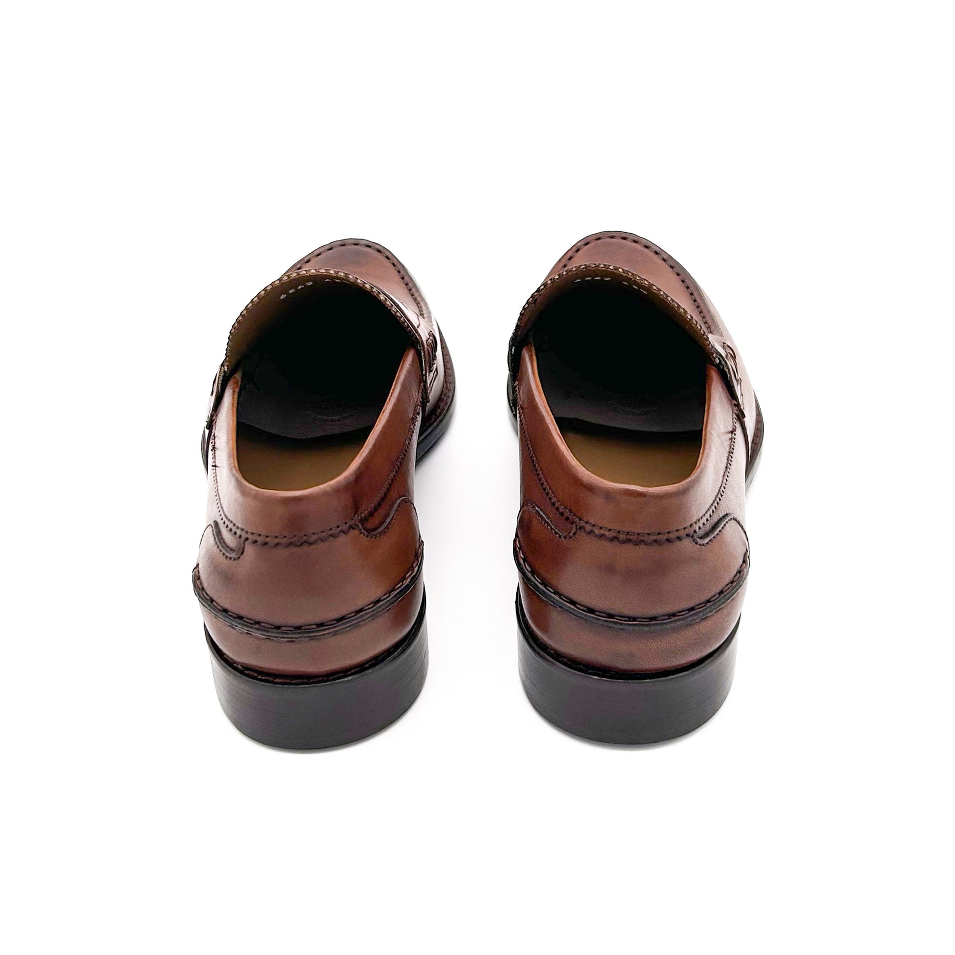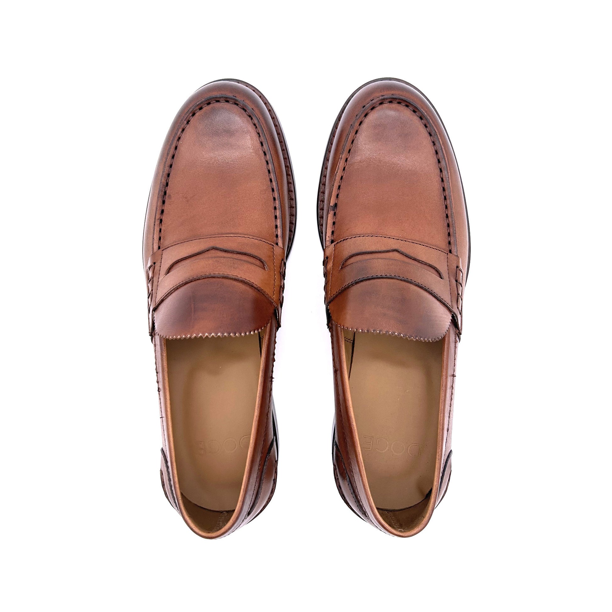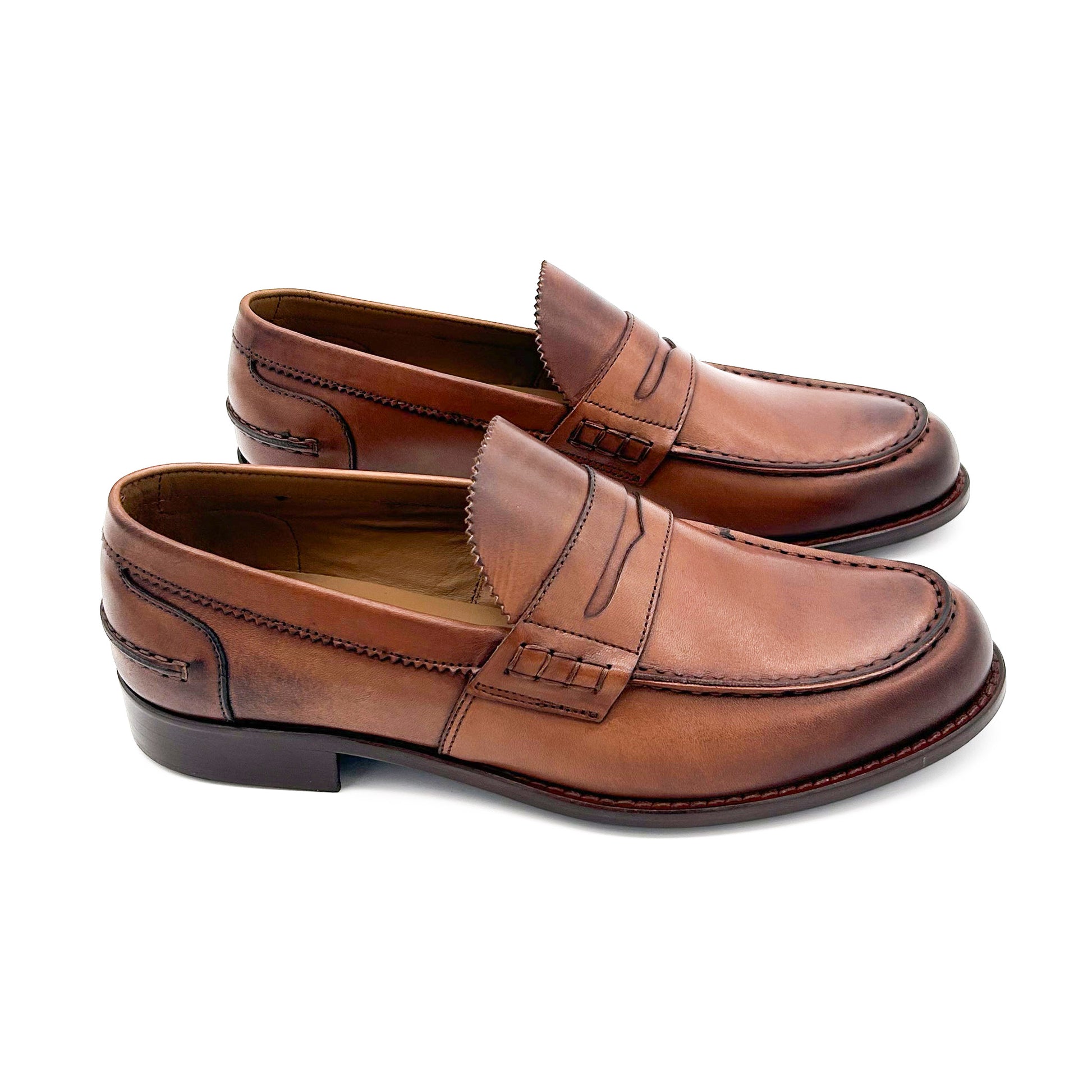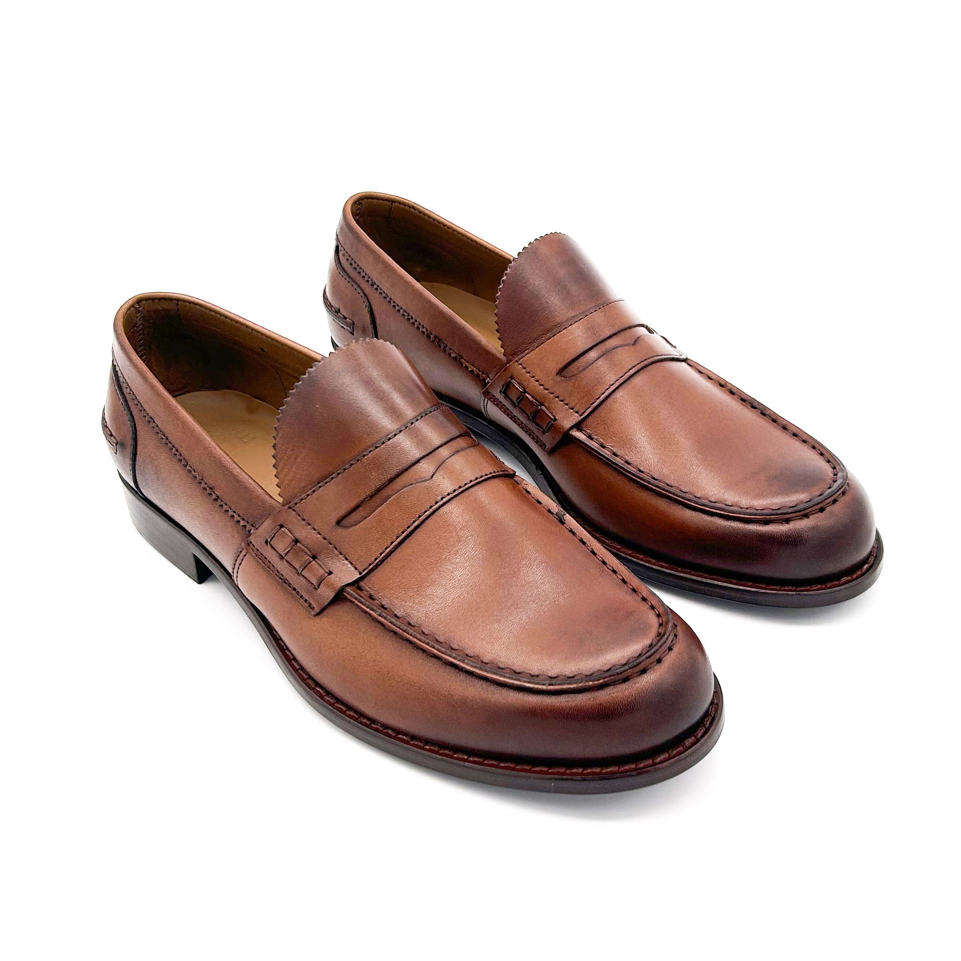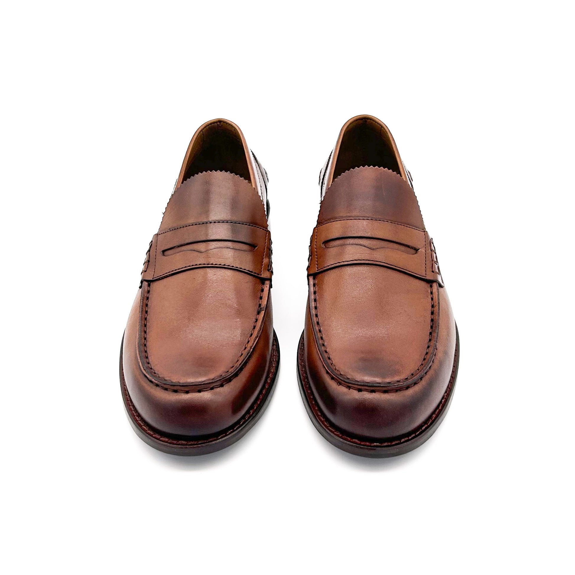 Mocassino college realizzato in pelle di vitello pieno fiore, la parte più esterna e pregiata, di colore volpe. È il college nella sua vera forma, la più classica ed autentica, che contraddistingue un'eleganza disinvolta tipica dello stile made in Italy. Presenta una punta leggermente arrotondata, la mascherina, e la linguetta che termina con un taglio smerlato, a zig-zag: dettaglio che deriva dalla mano degli artigiani, che chiamano sbizzatura. Suola in cuoio cucita a mano.