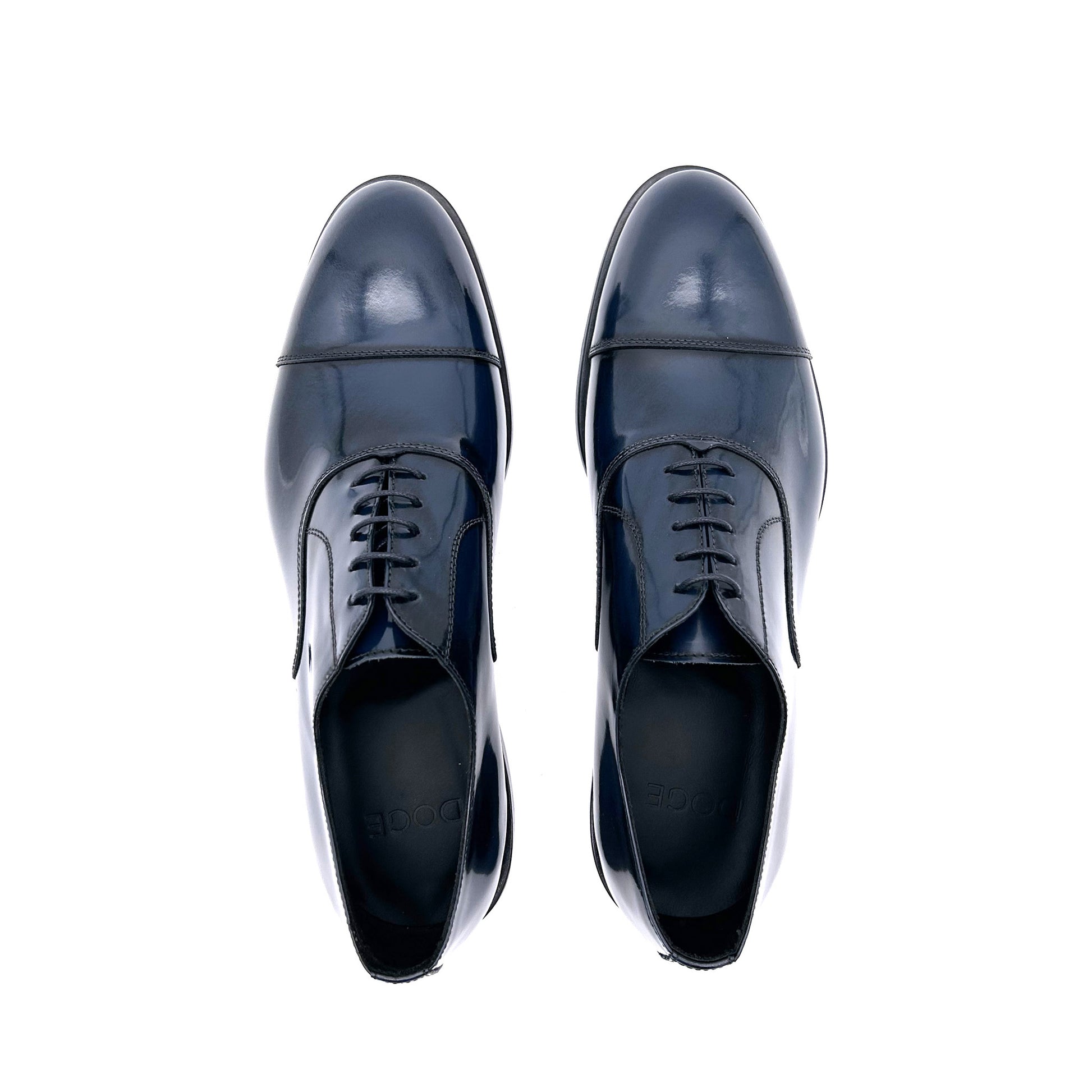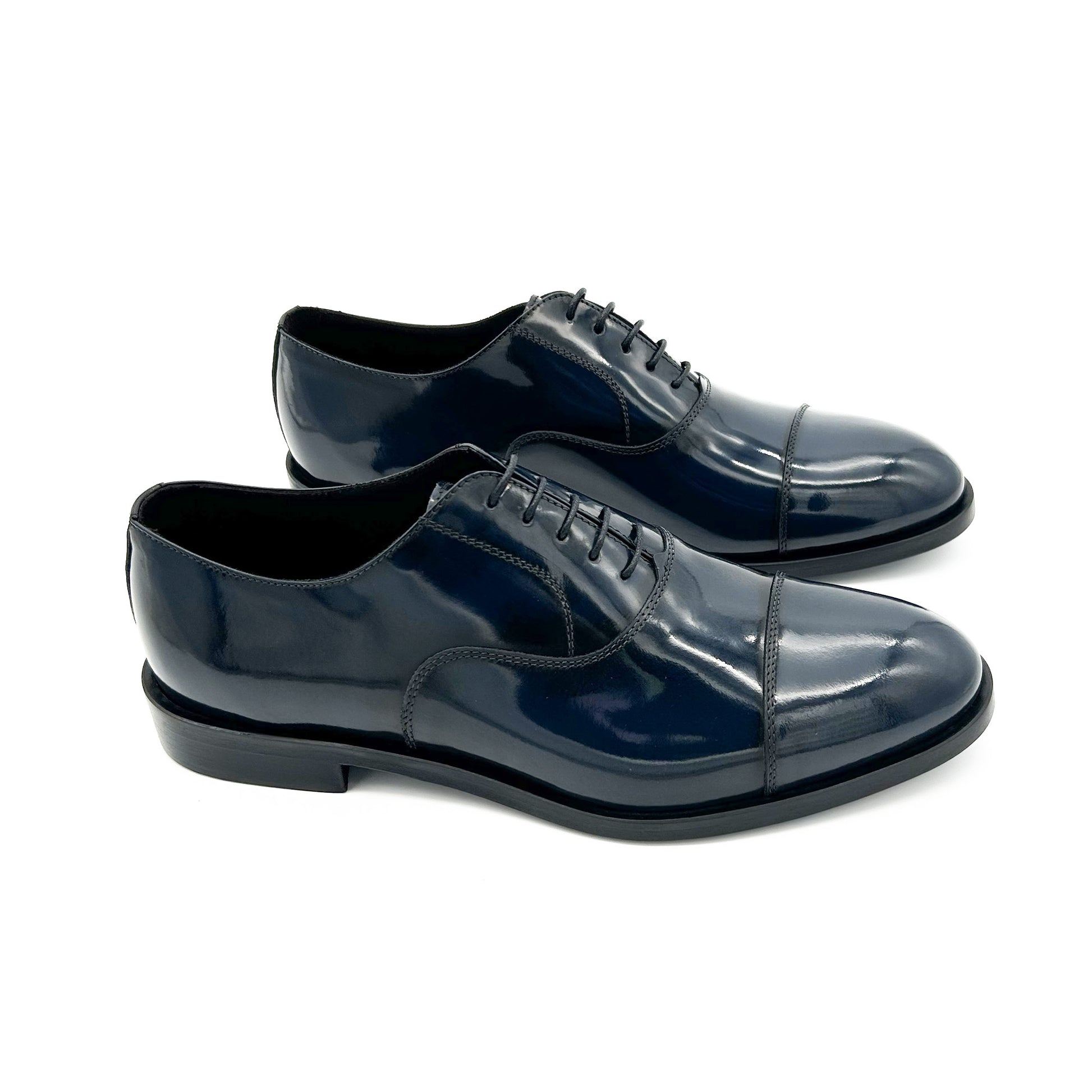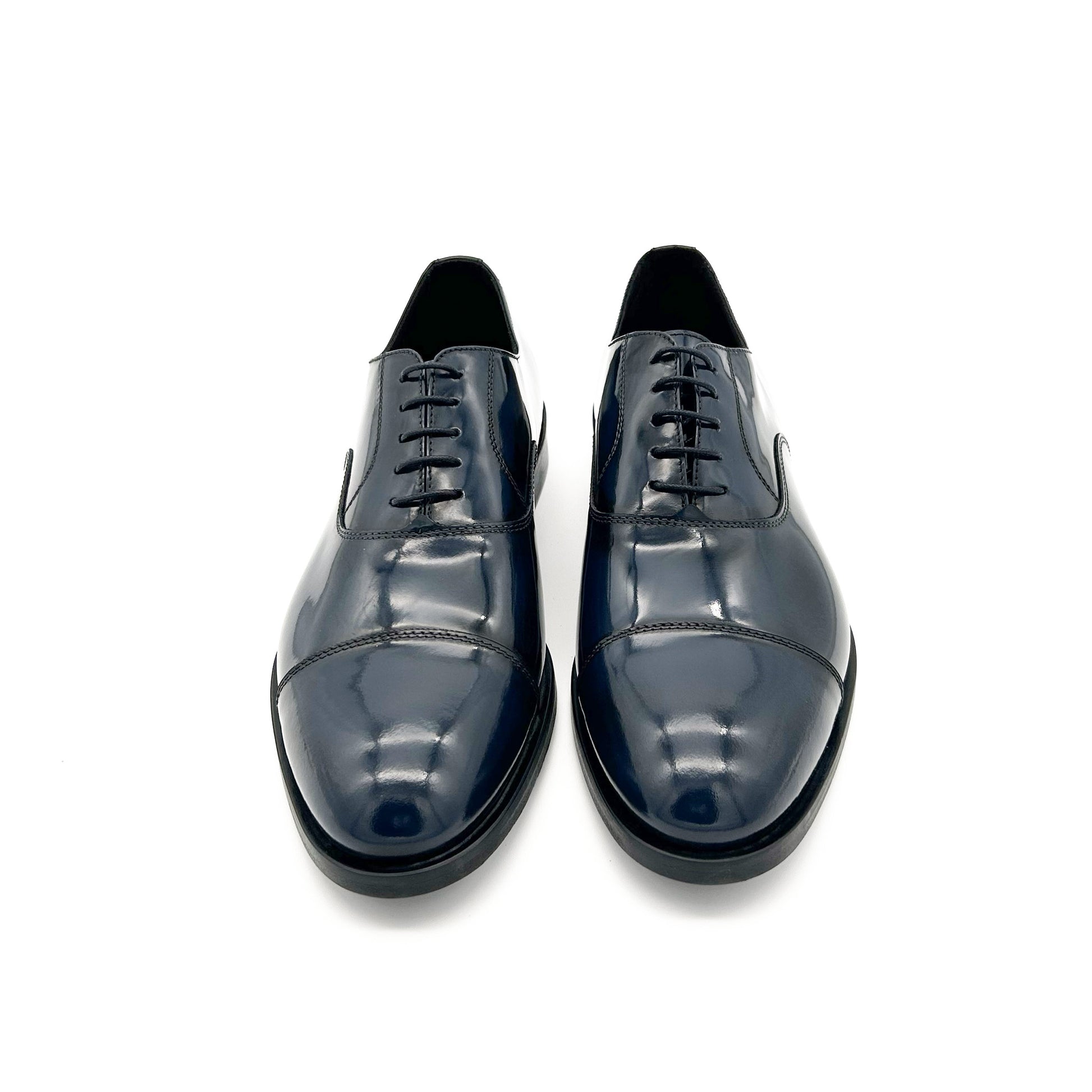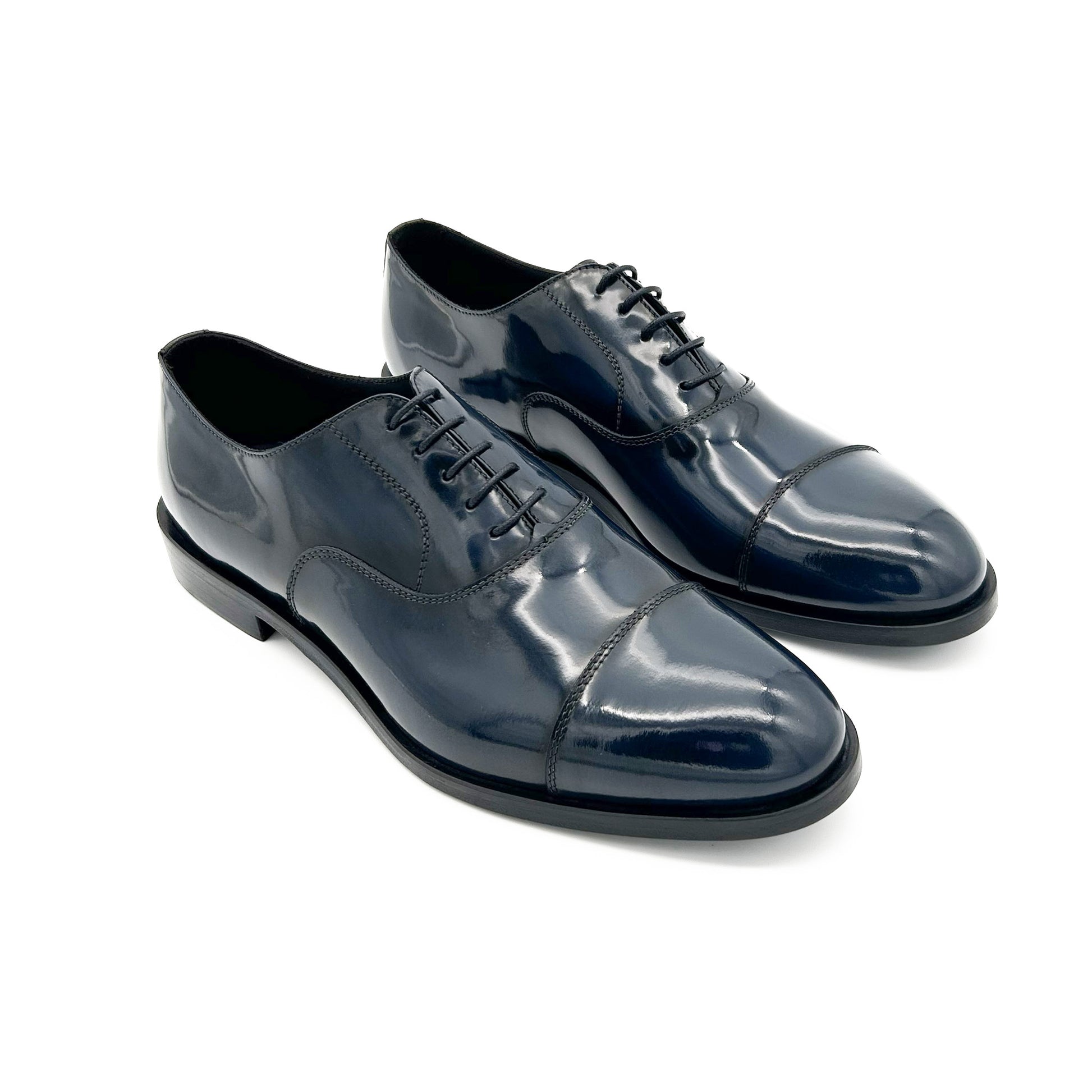 Francesina con puntale realizzata in pelle di vitello spazzolata di colore blu. La pelle spazzolata o abrasivata è liscia e lucente - non è vernice! - venendo prima levigata, poi spennellata con cera abrasiva, infine passata sotto le spazzole per rimuovere la cera in eccesso. È la scarpa perfetta per la cerimonia - ideale per lo sposo - e per i look più eleganti. Suola in cuoio cucita a mano.