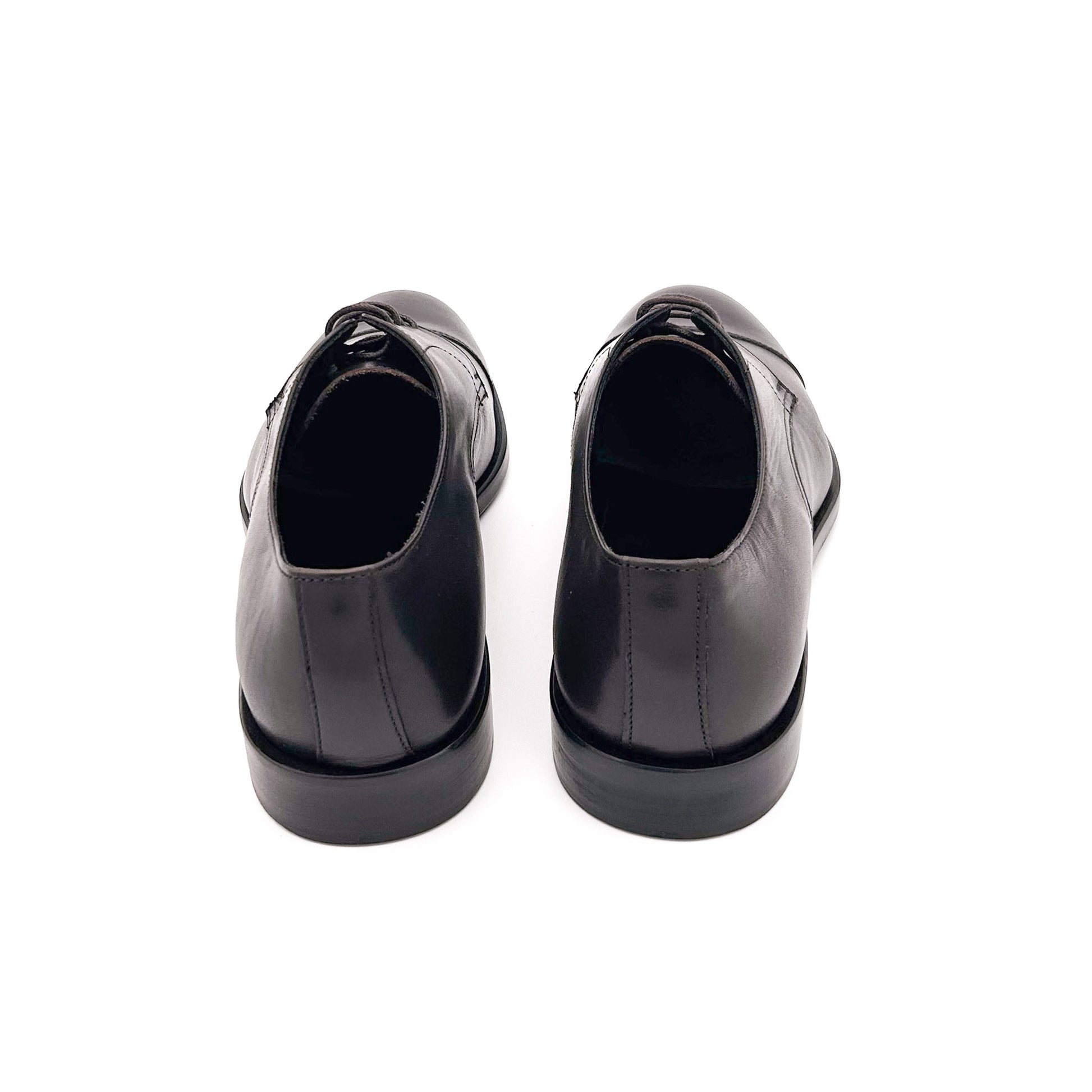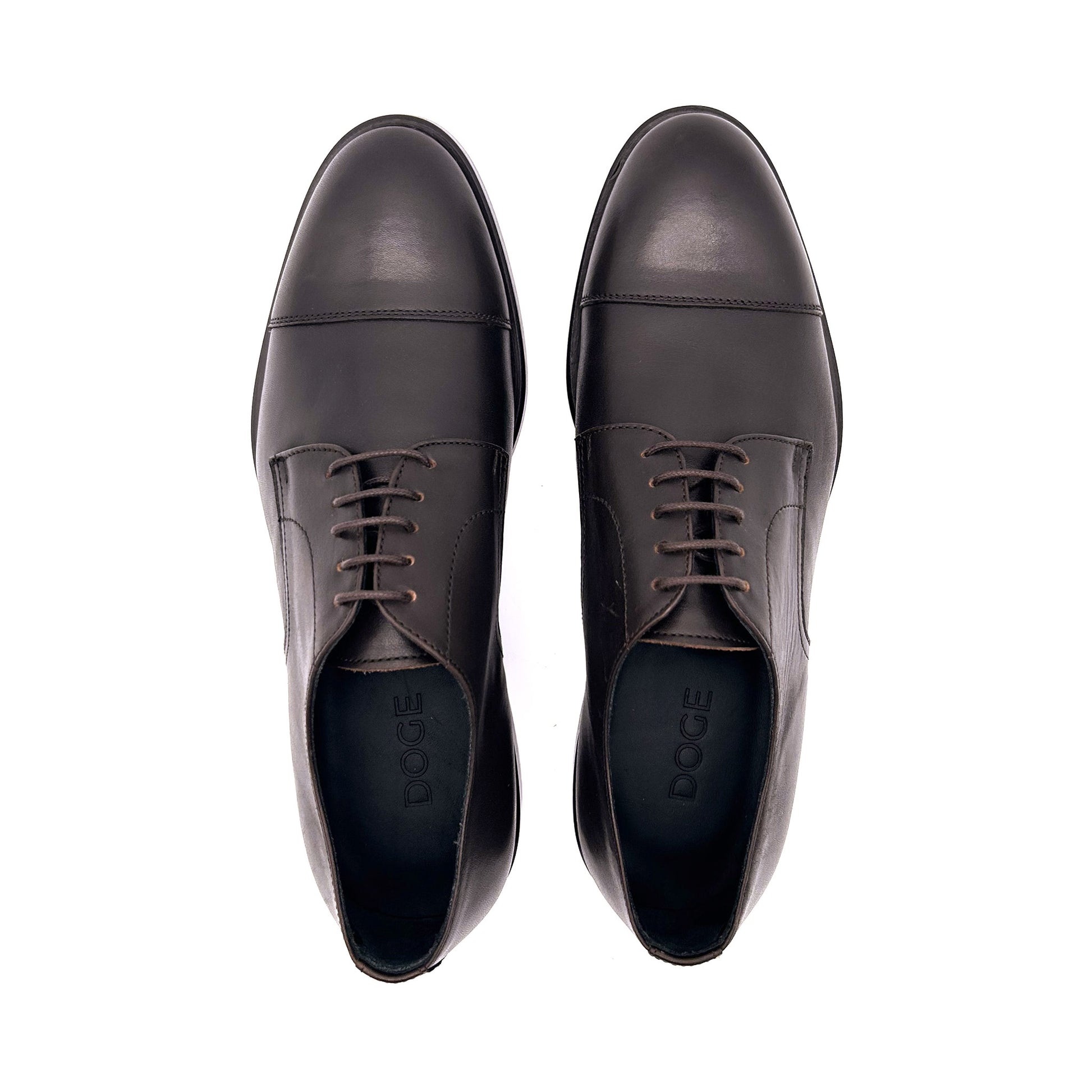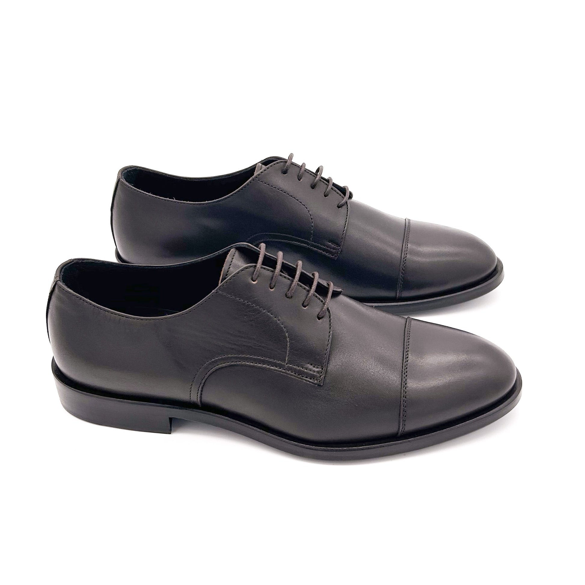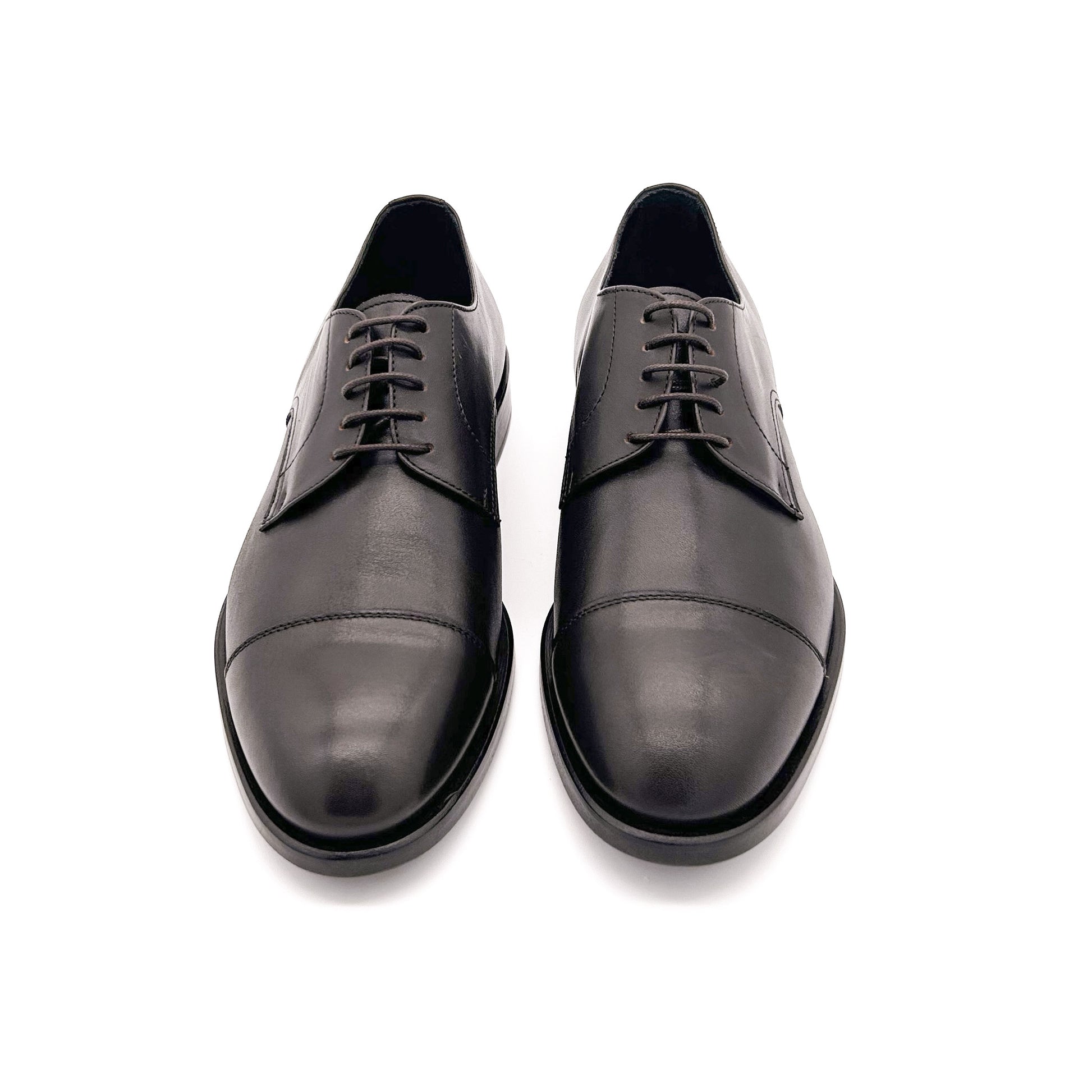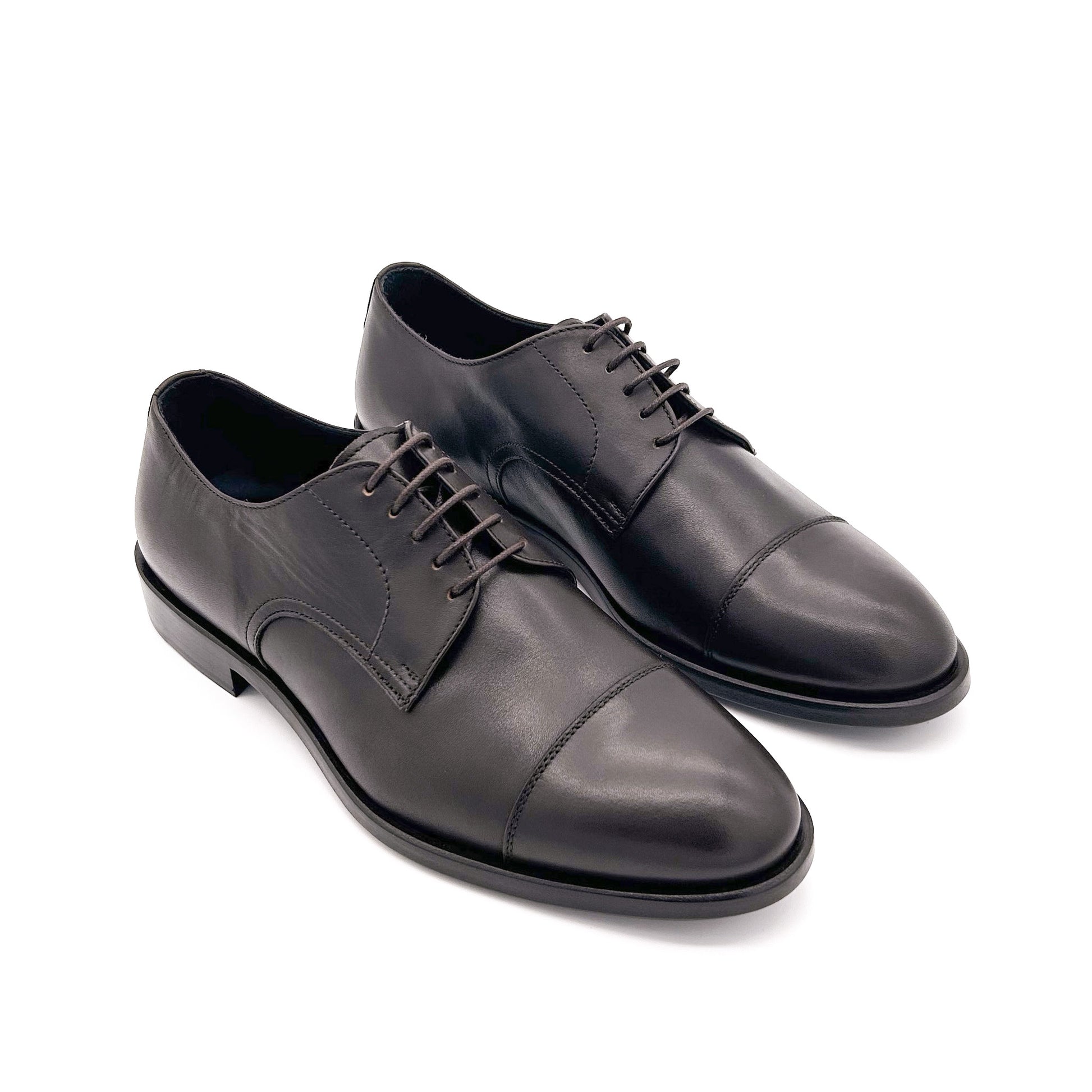 Derby con puntale realizzata in pelle di vitello pieno fiore, la parte più esterna e pregiata, di testa di moro. Caratteristica delle scarpe derby è l'allacciatura che passa su lembi di pelle applicati al di sopra della tomaia, risultando più aperte, adatte ai colli del piede più importanti. Ideale per look semi formali business o look casual, può essere scelta per la sua comodità anche per le cermonie - da invitati -. Suola in cuoio cucita a mano.