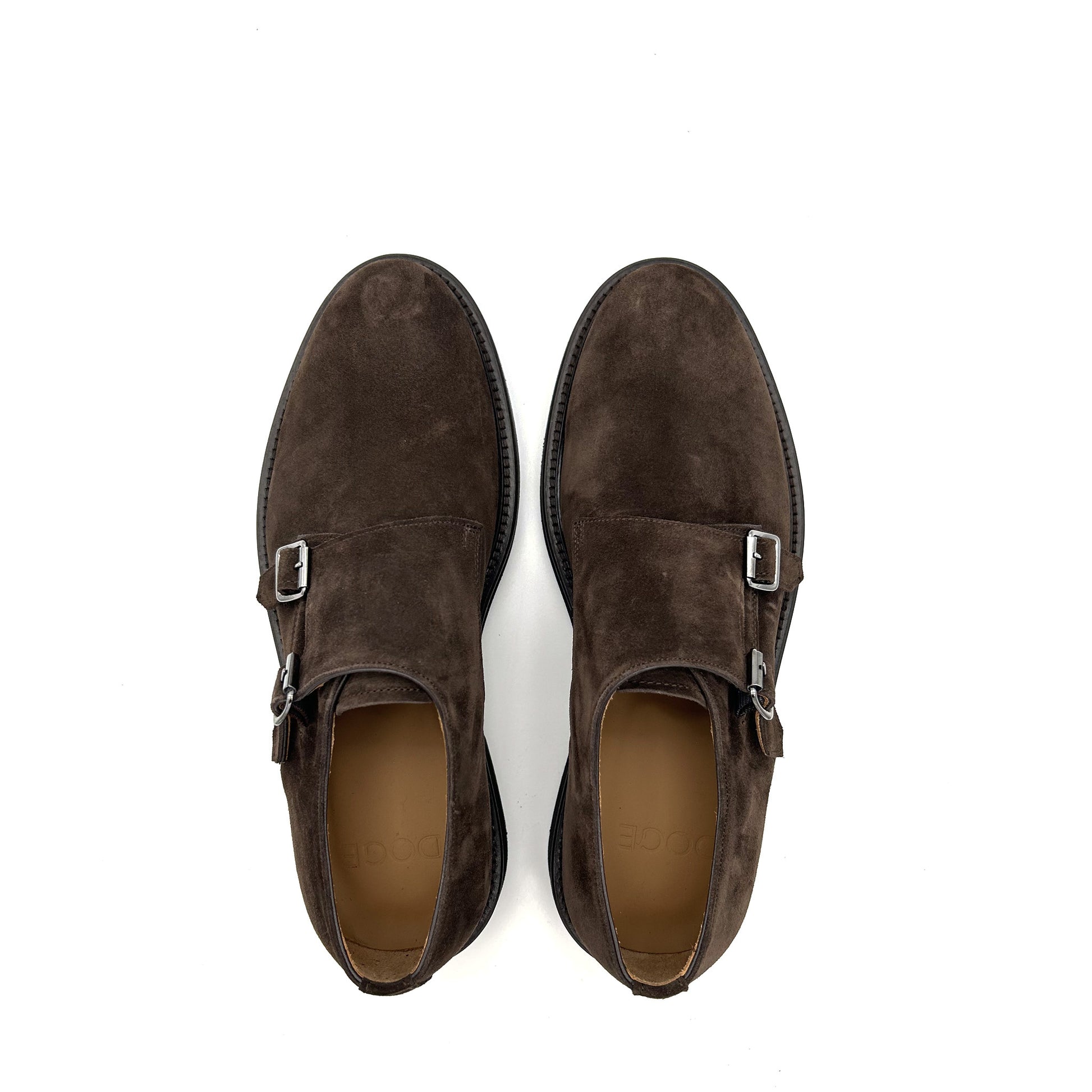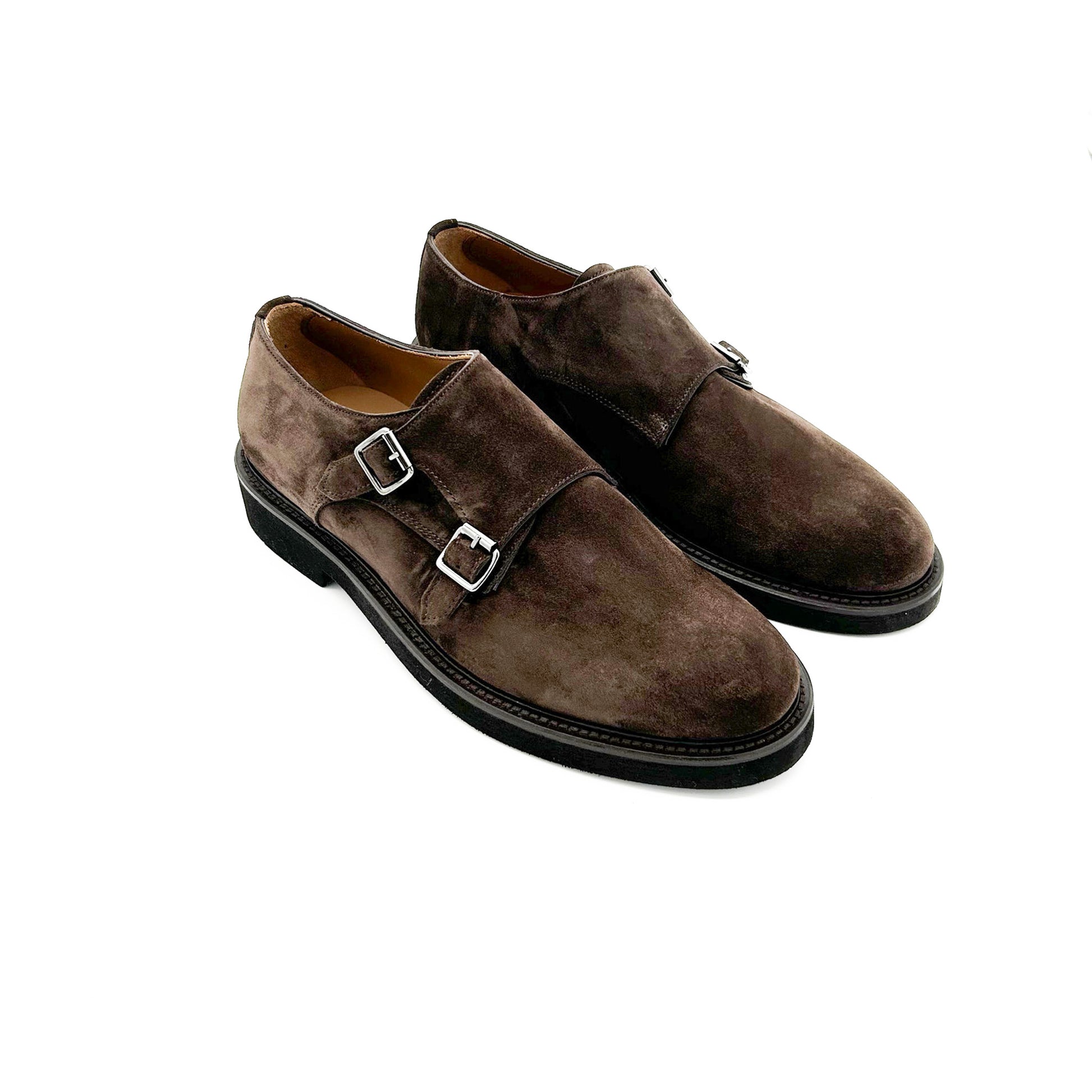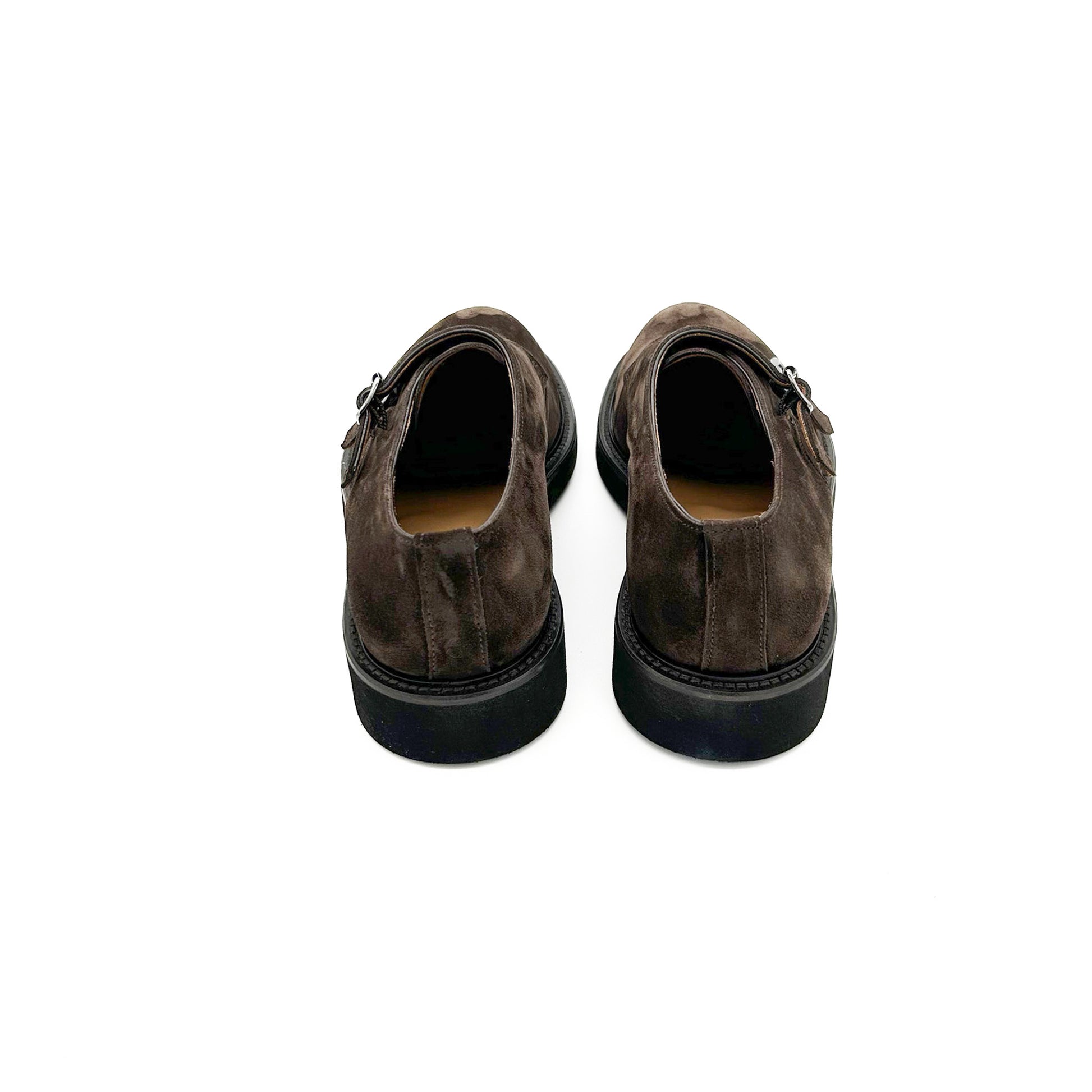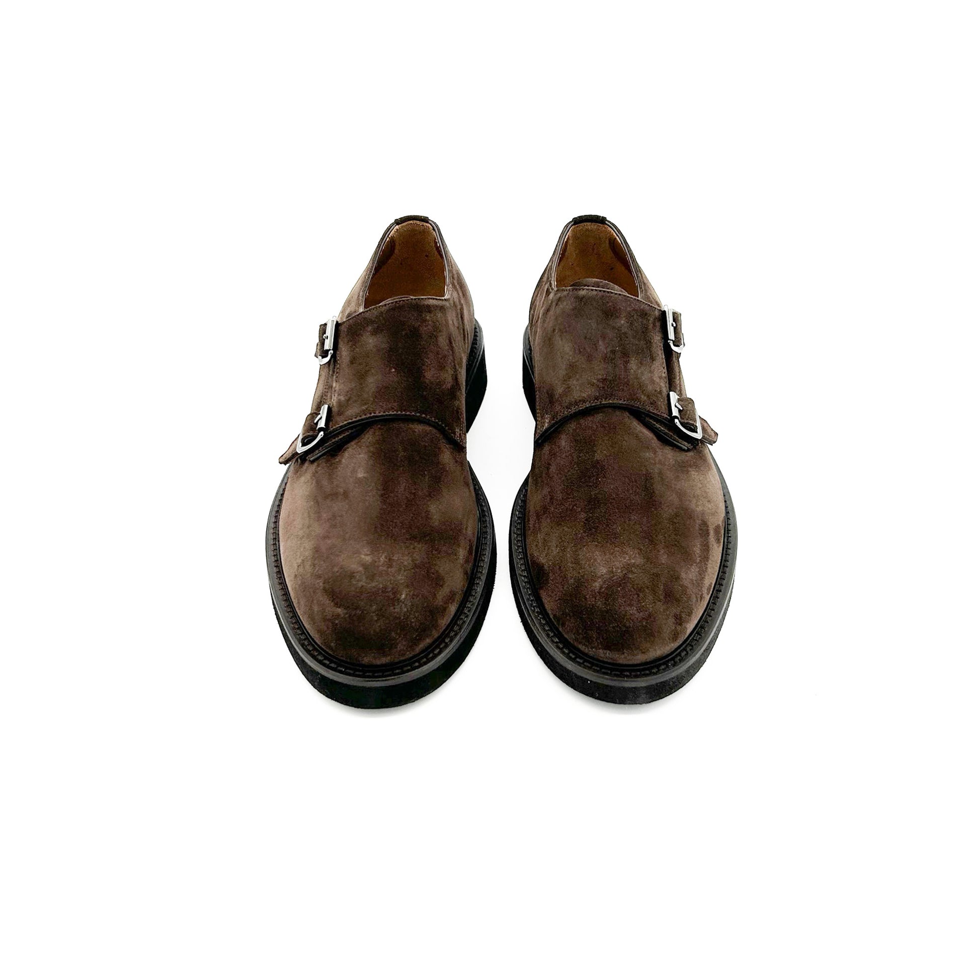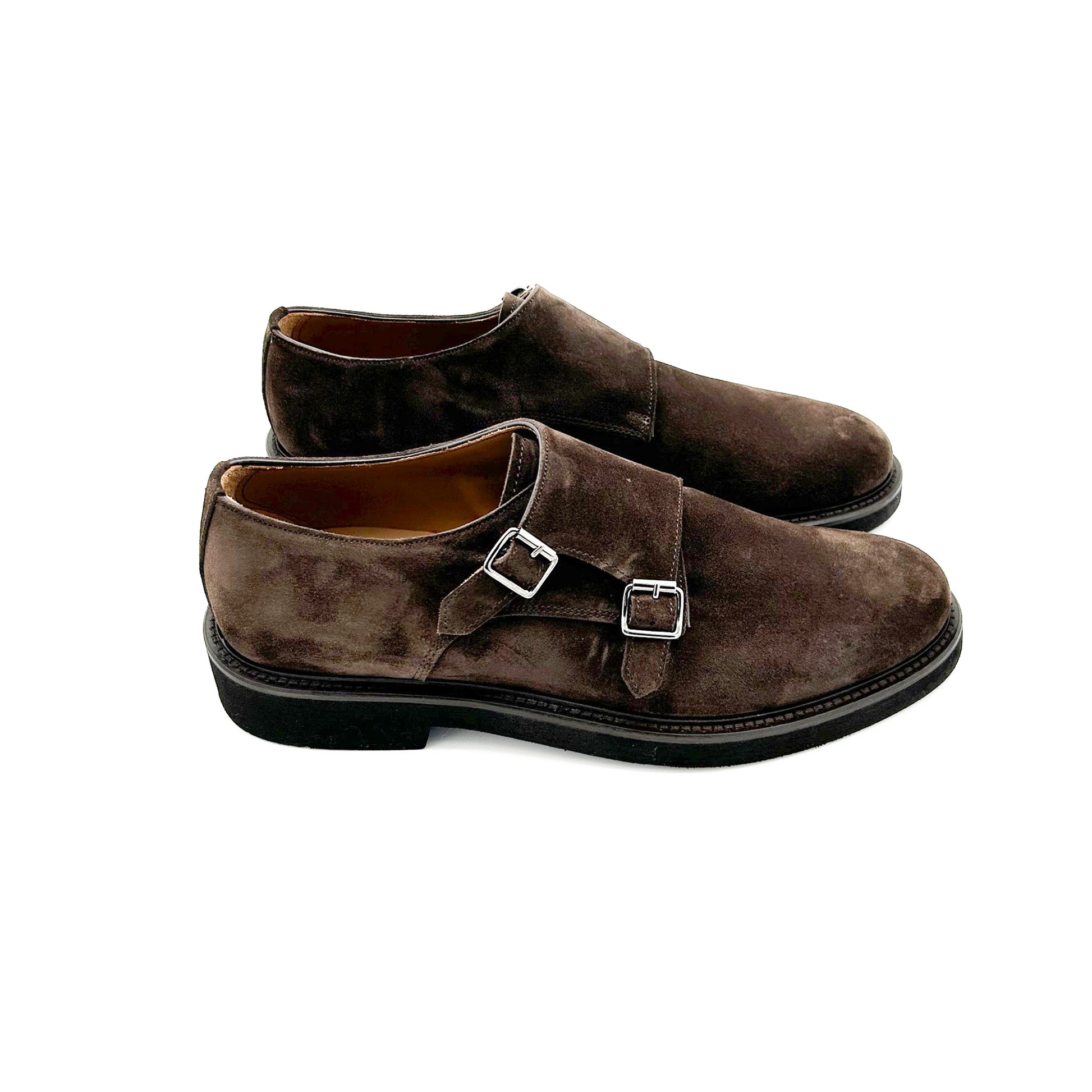 Doppia fibbia realizzata in pelle di vitello scamosciata di colore testa di moro. Due elastici all'altezza delle fibbie agevolano la calzata di questa scarpa. Modello classico ed intramontabile, dalle linee raffinate ed equilibrate. Suola in gomma ultralight cucita a mano.