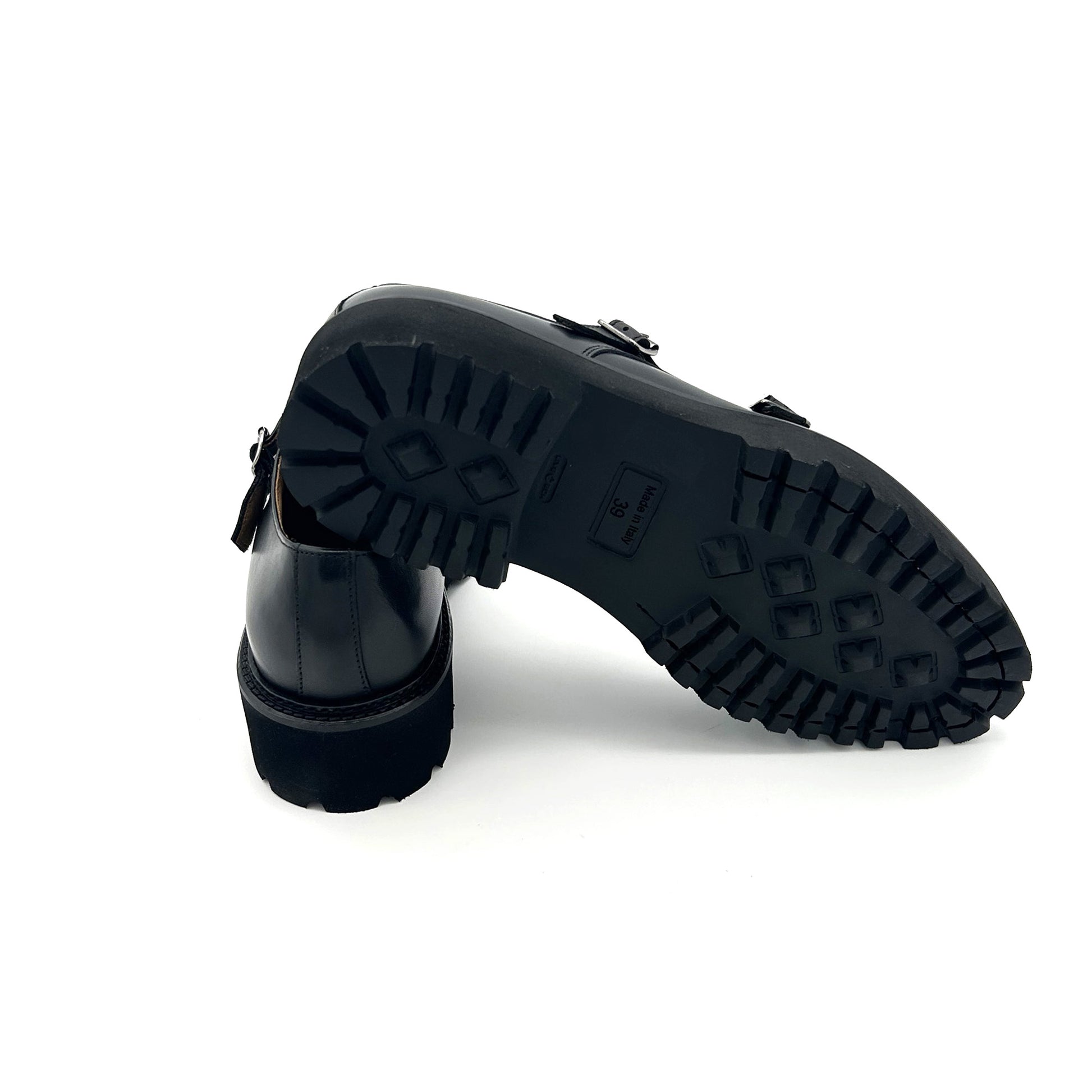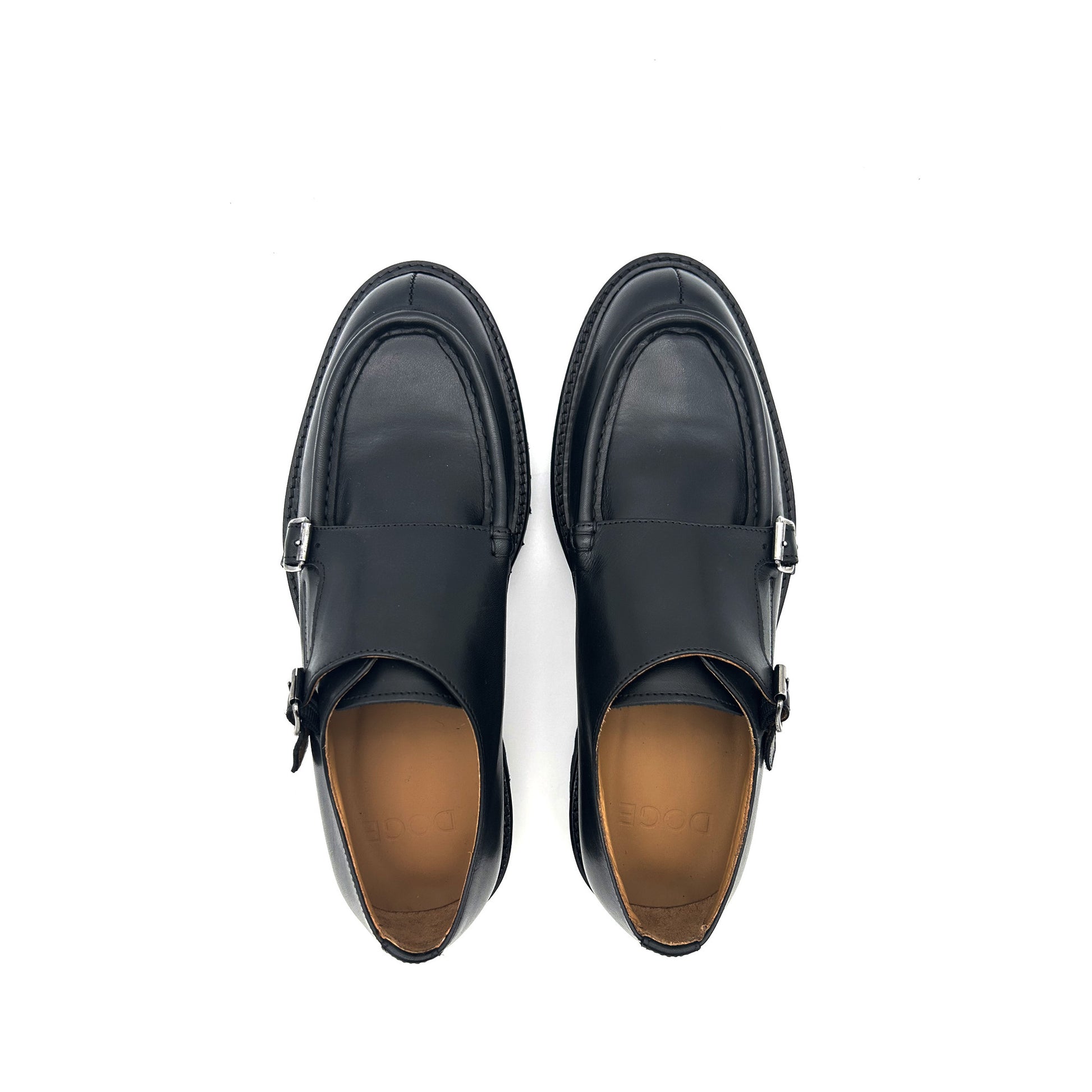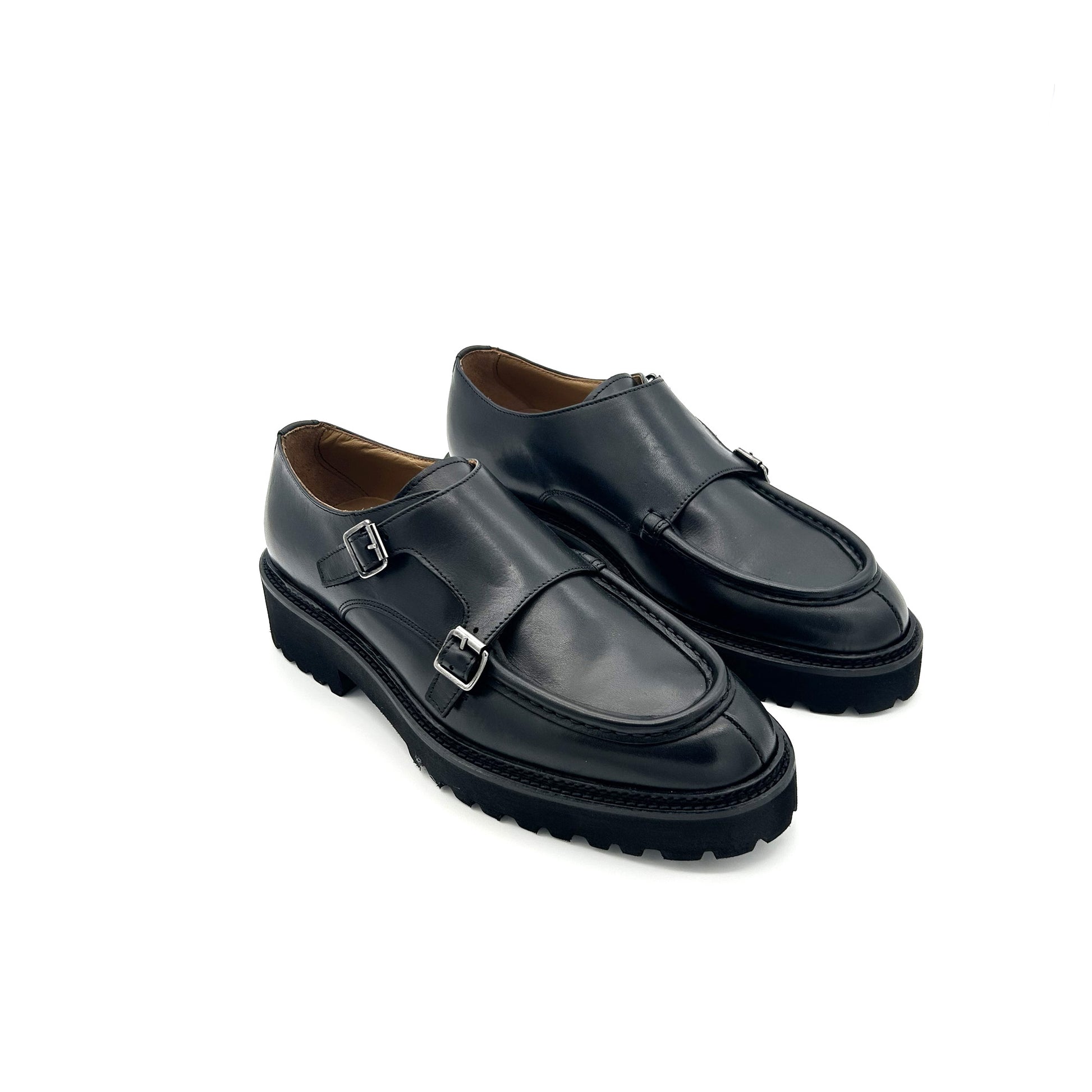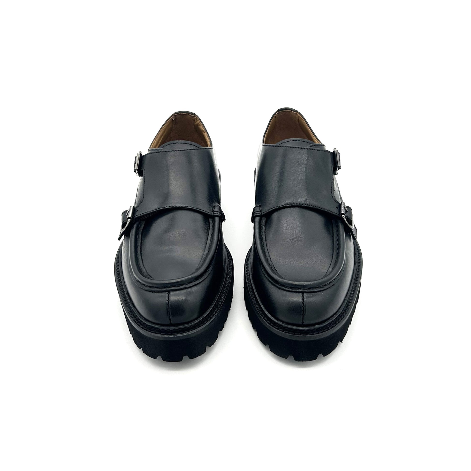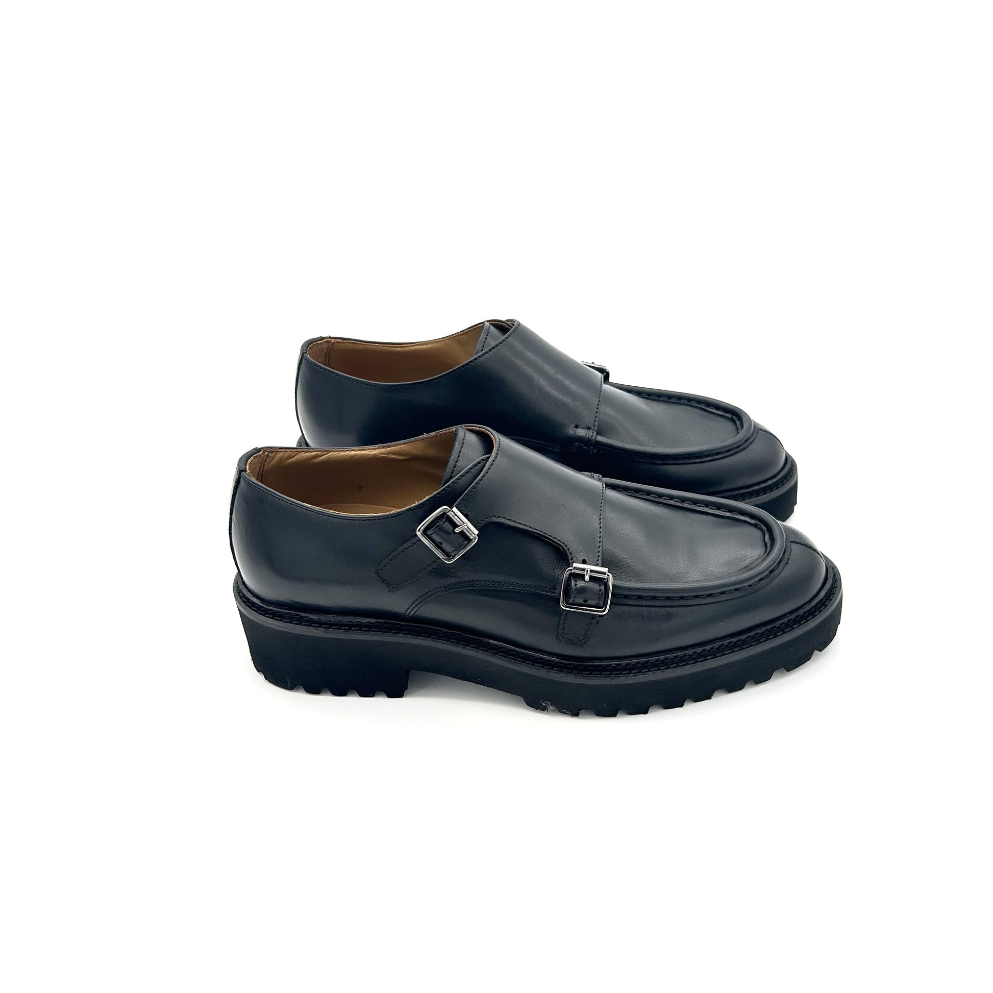 Doppia fibbia realizzata in pelle di vitello pieno fiore, la parte più esterna e pregiata, di colore nero. La forma con la cucitura in rilievo che segue il bordo sulla tomaia e il fondo roccia in gomma gli conferiscono un aspetto più moderno e grintoso.