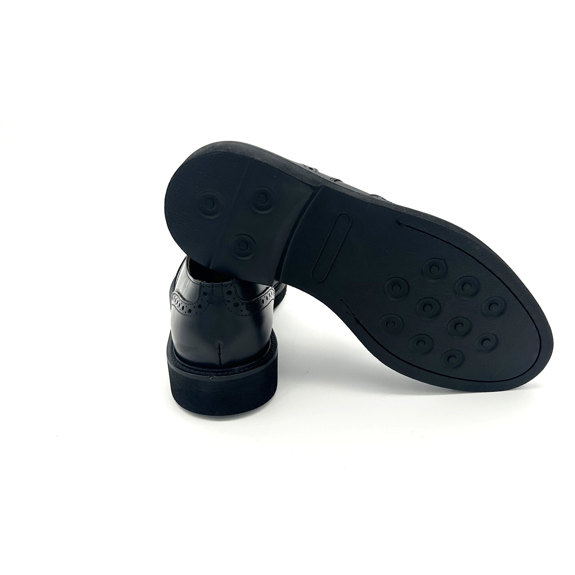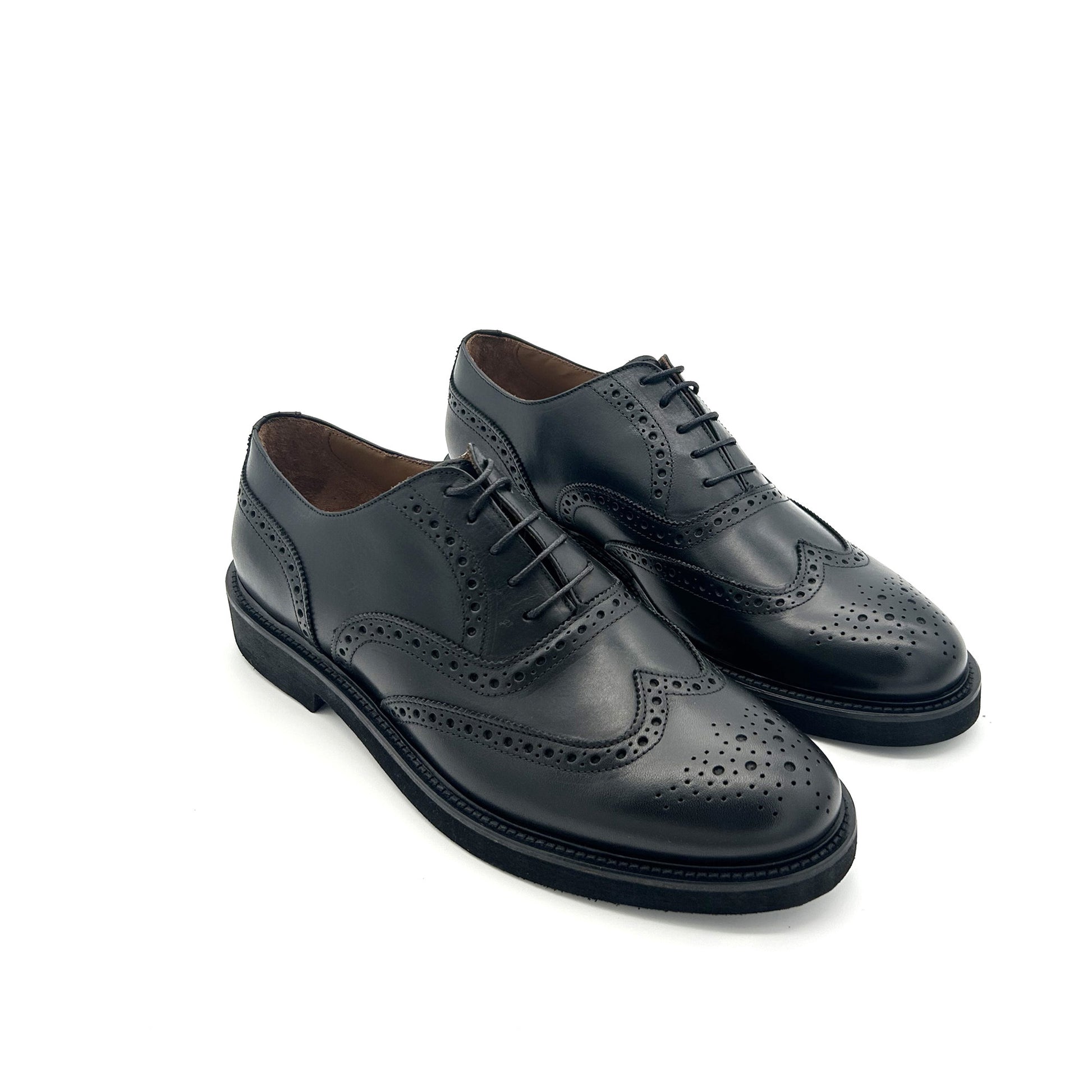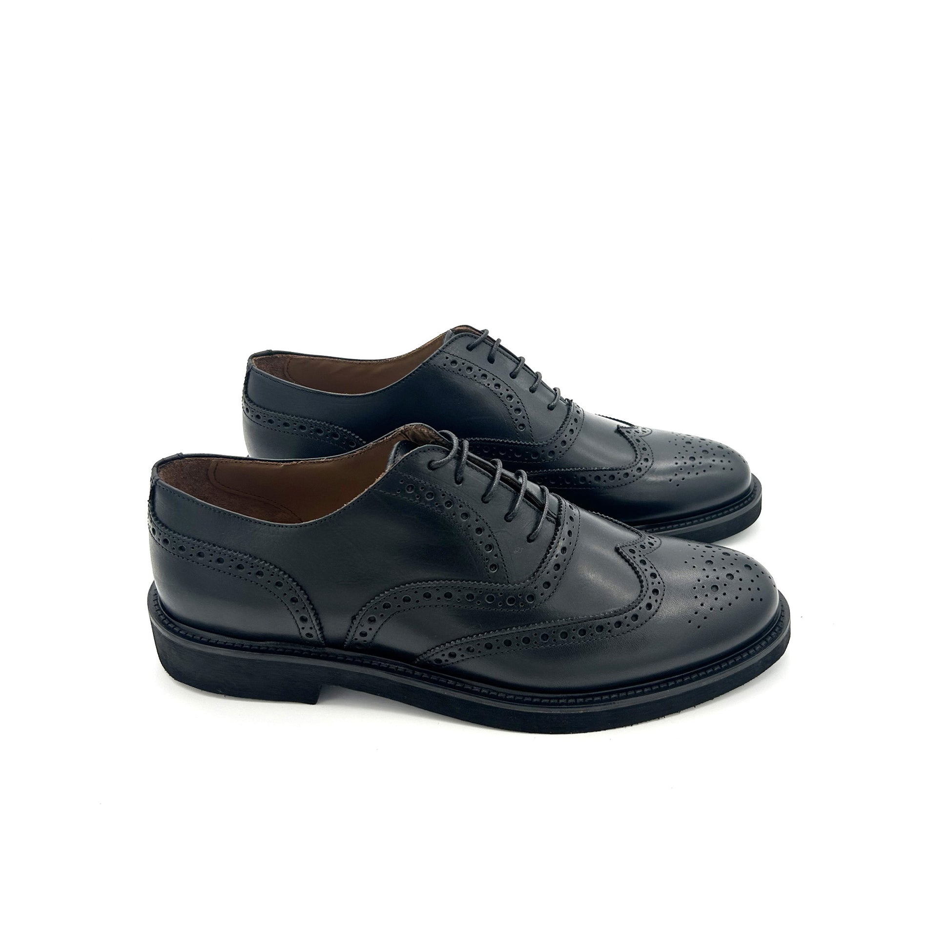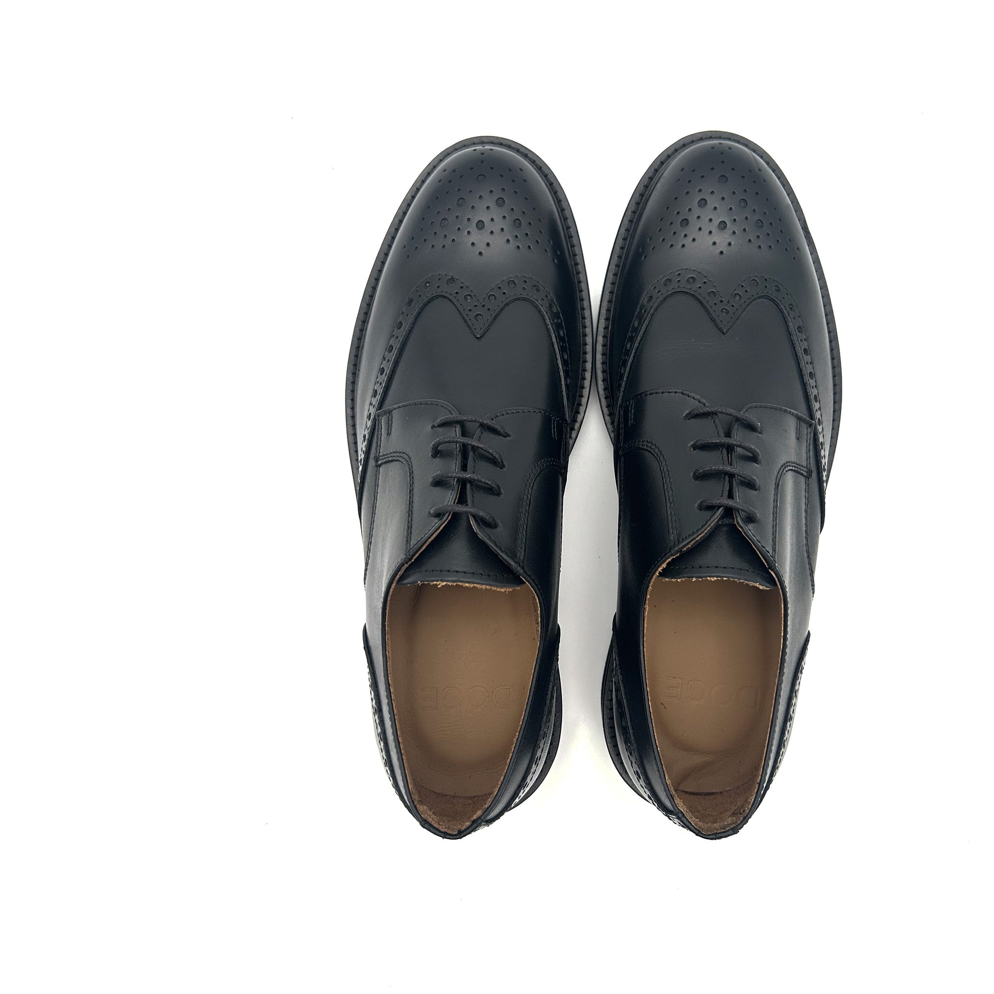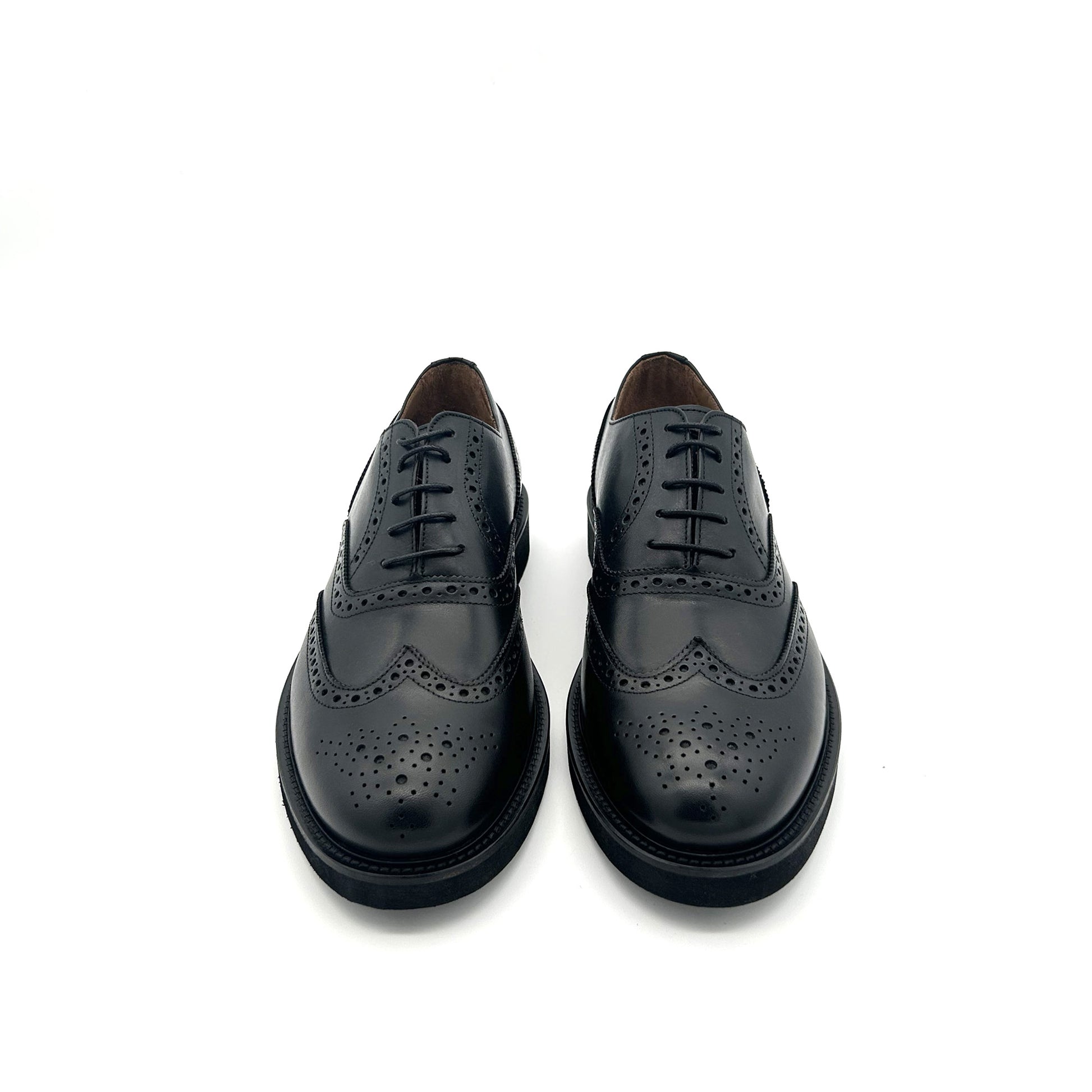Francesina con disegno coda di rondine realizzata in pelle di vitello pieno fiore, la parte più esterna e pregiata, di colore nero. Ideale per look formali, business. Suola in cuoio gomma a mano.