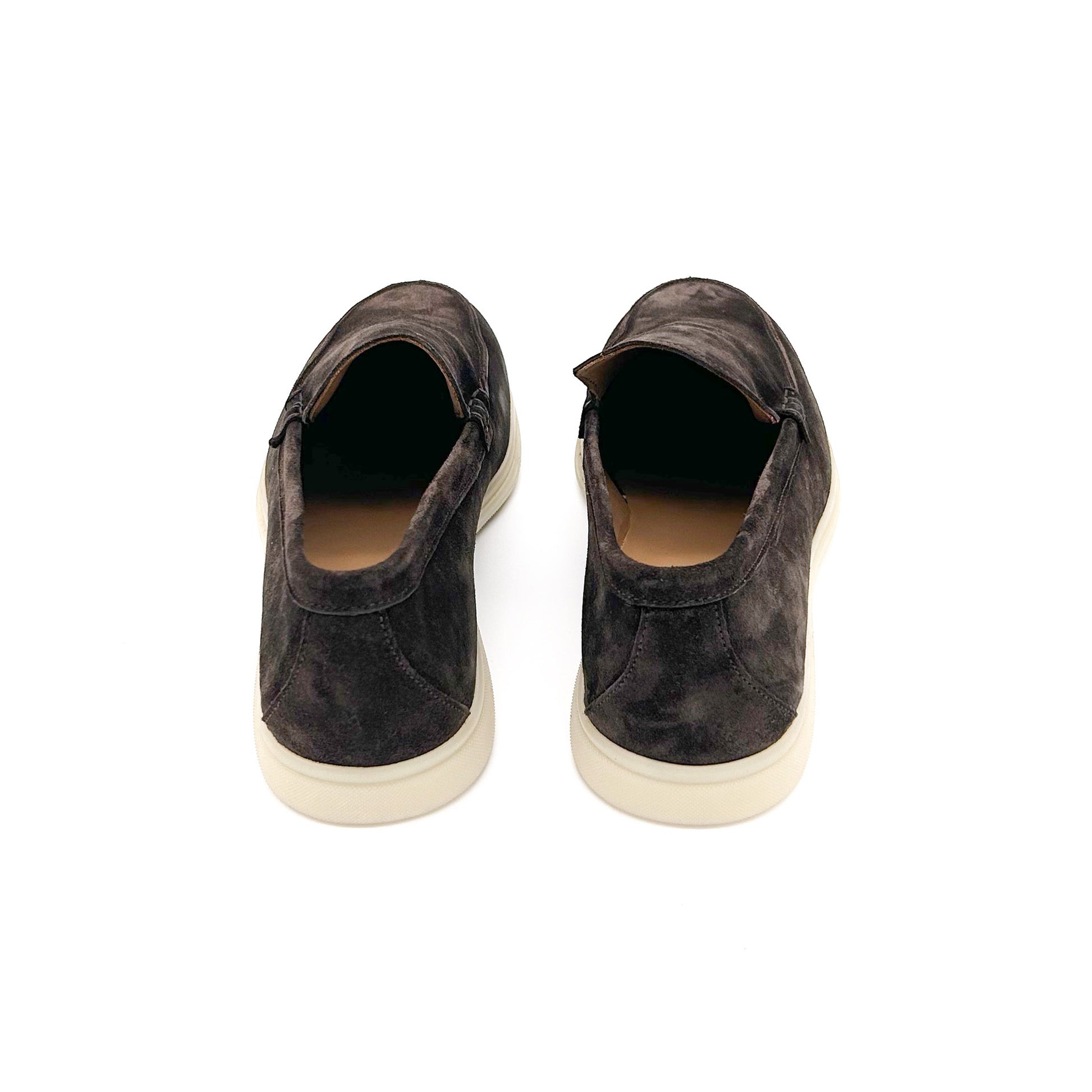 Casual loafer realizzato in pelle scamosciata di colore testa di moro, con suola in gomma color crema. In questo modello il mondo classico incontra il mondo casual e sportivo, dando vita ad una scarpa che è a metà tra un mocassino e una sneaker.