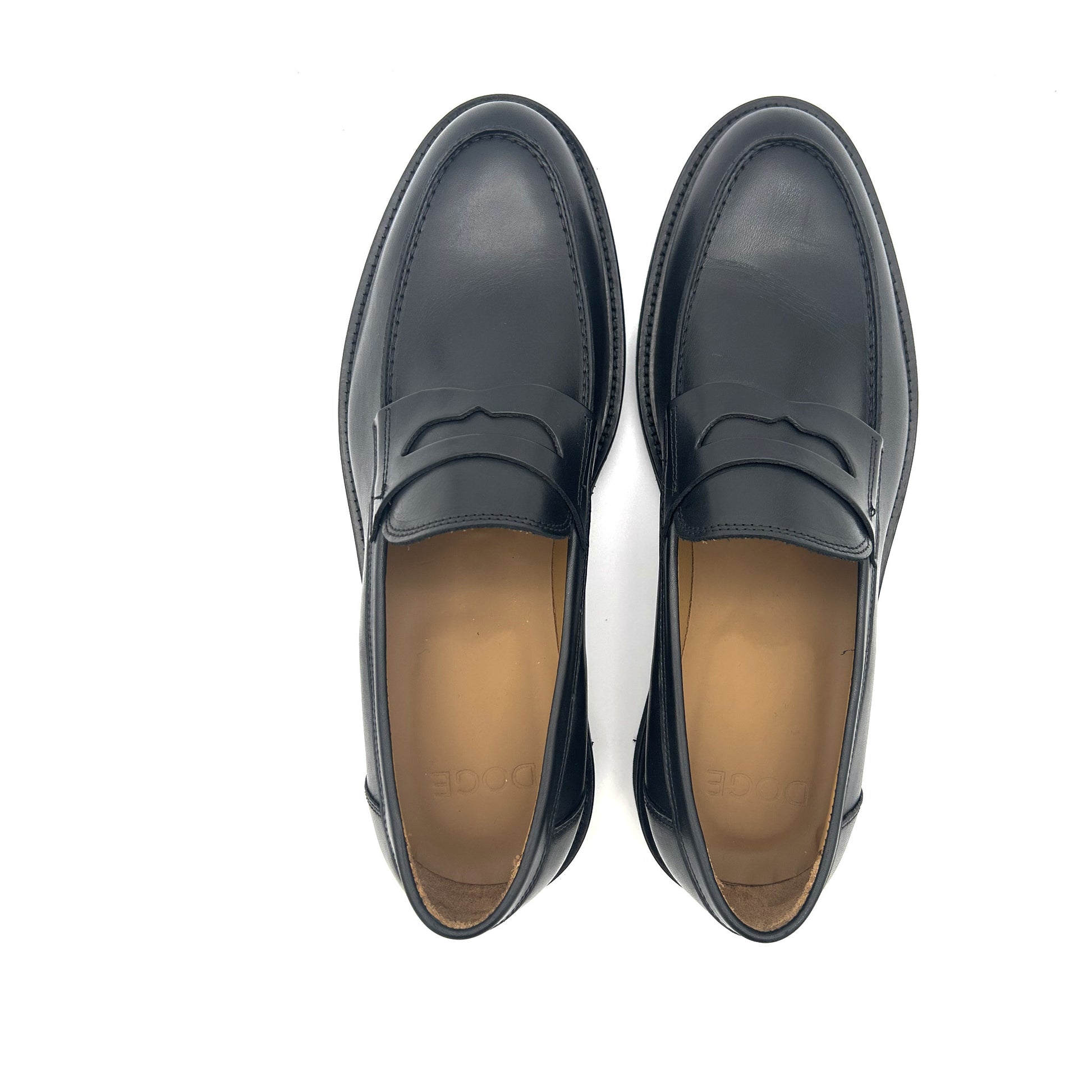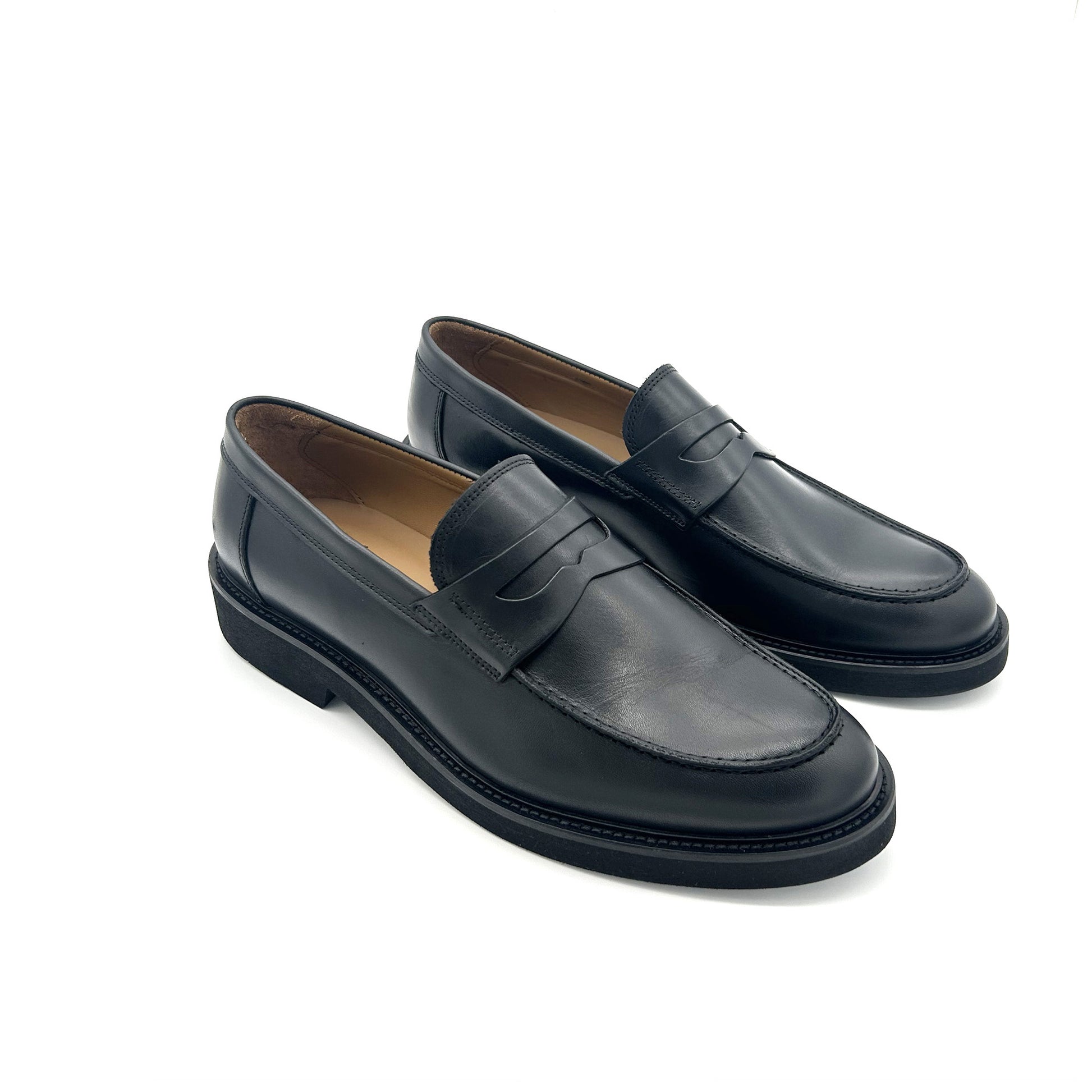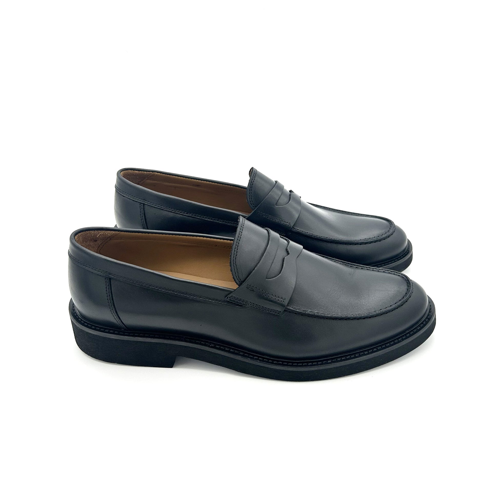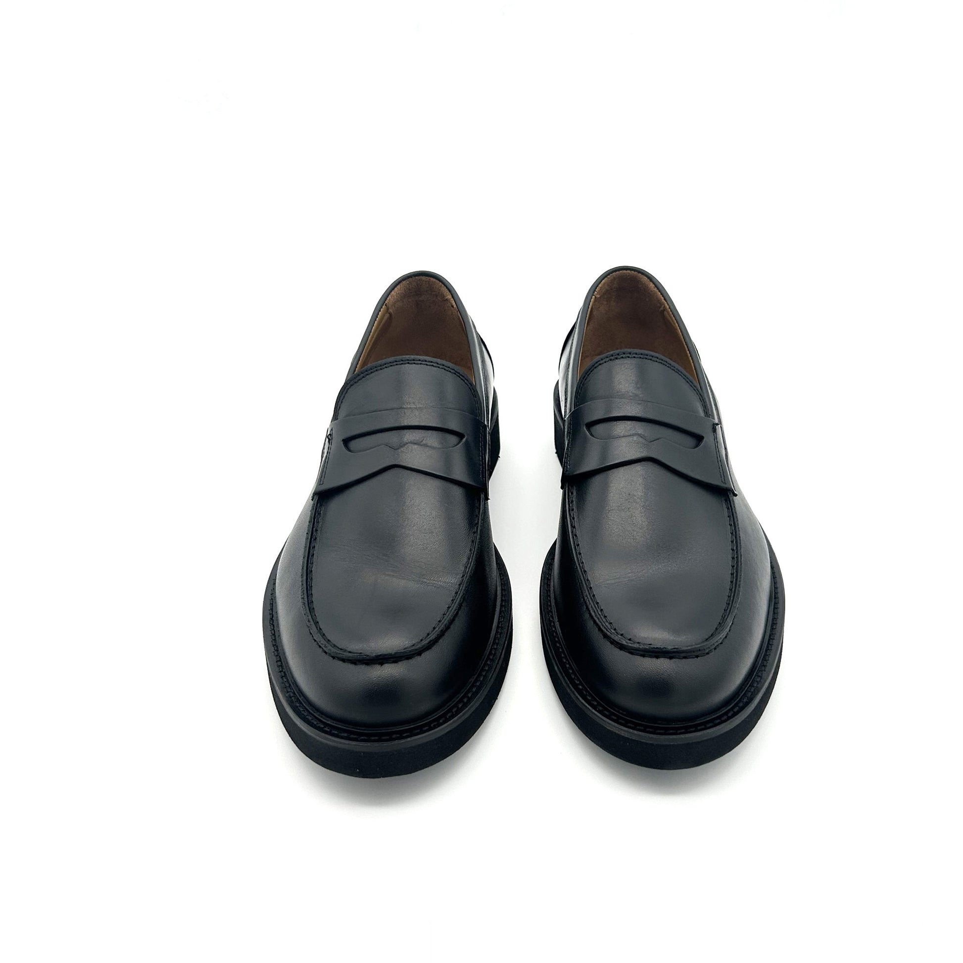 Mocassino realizzato in pelle di vitello pieno fiore, la parte più esterna e pregiata, di colore nero. Presenta la classica mascherina del modello college. Il fondo in gomma lo rende ideale per le giornate autunnali e invernali.