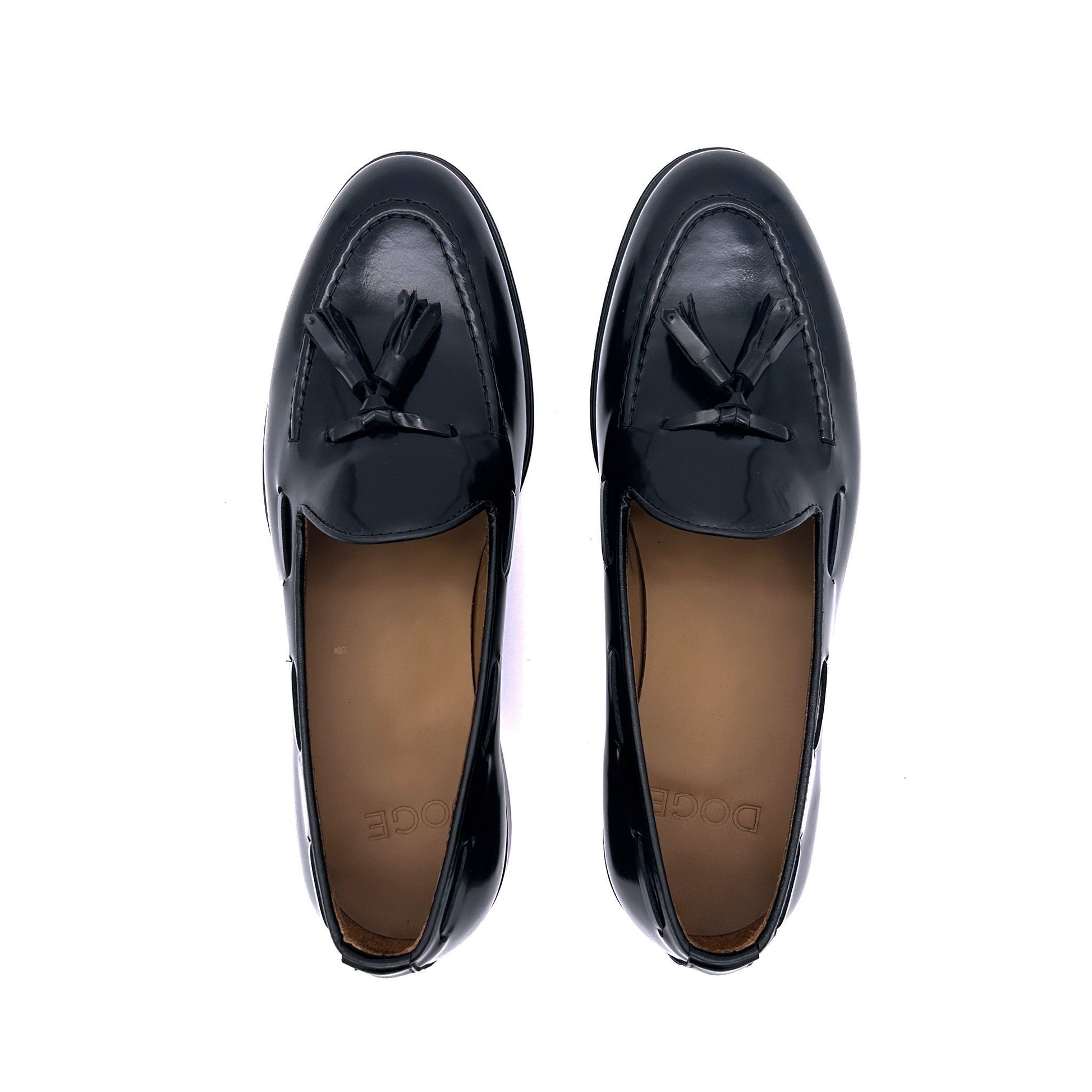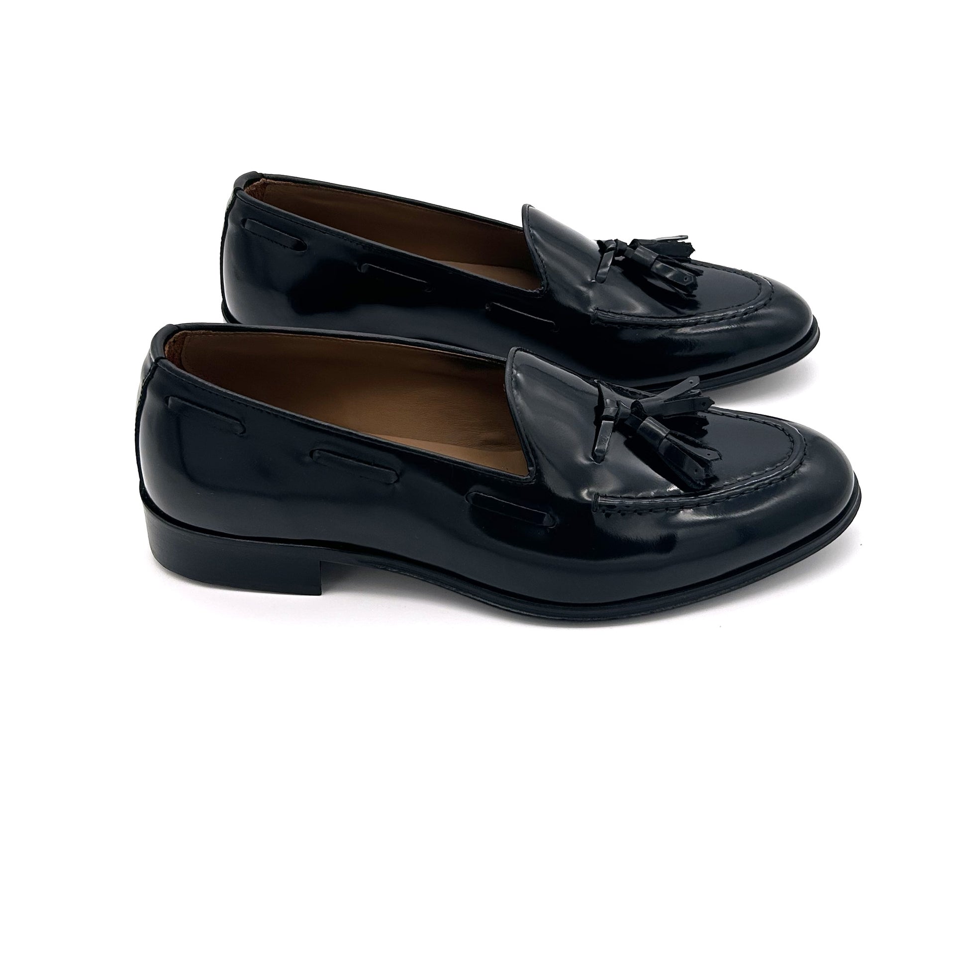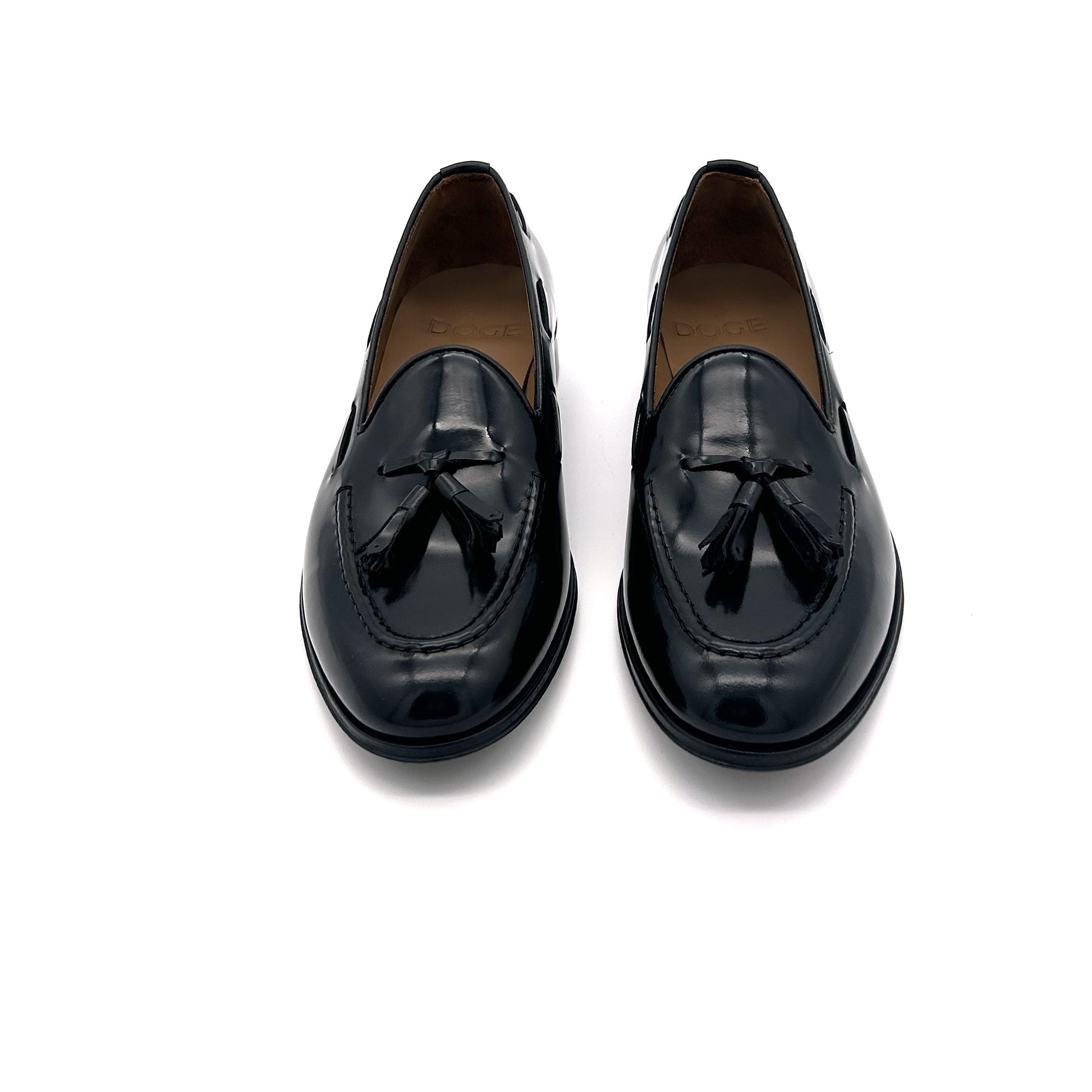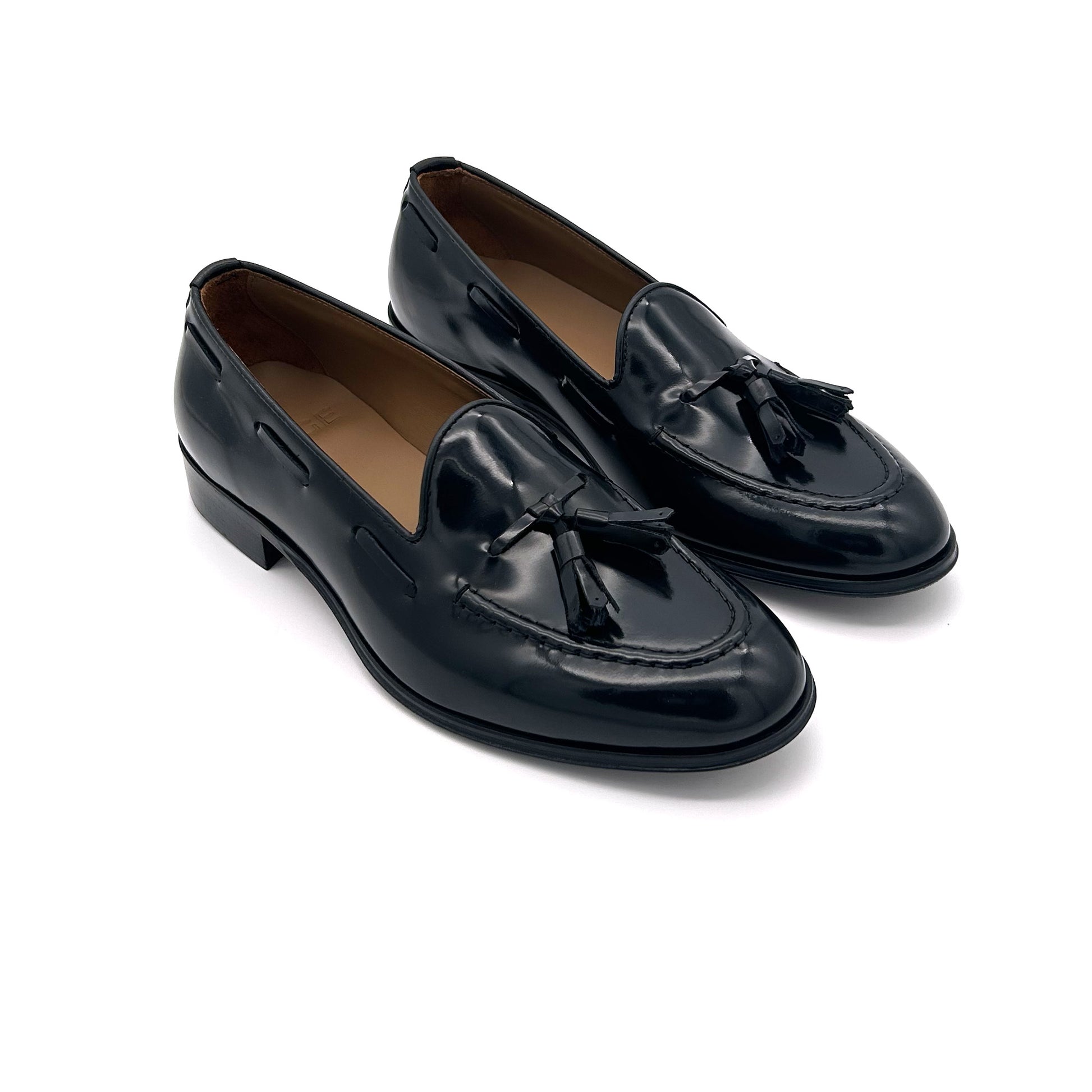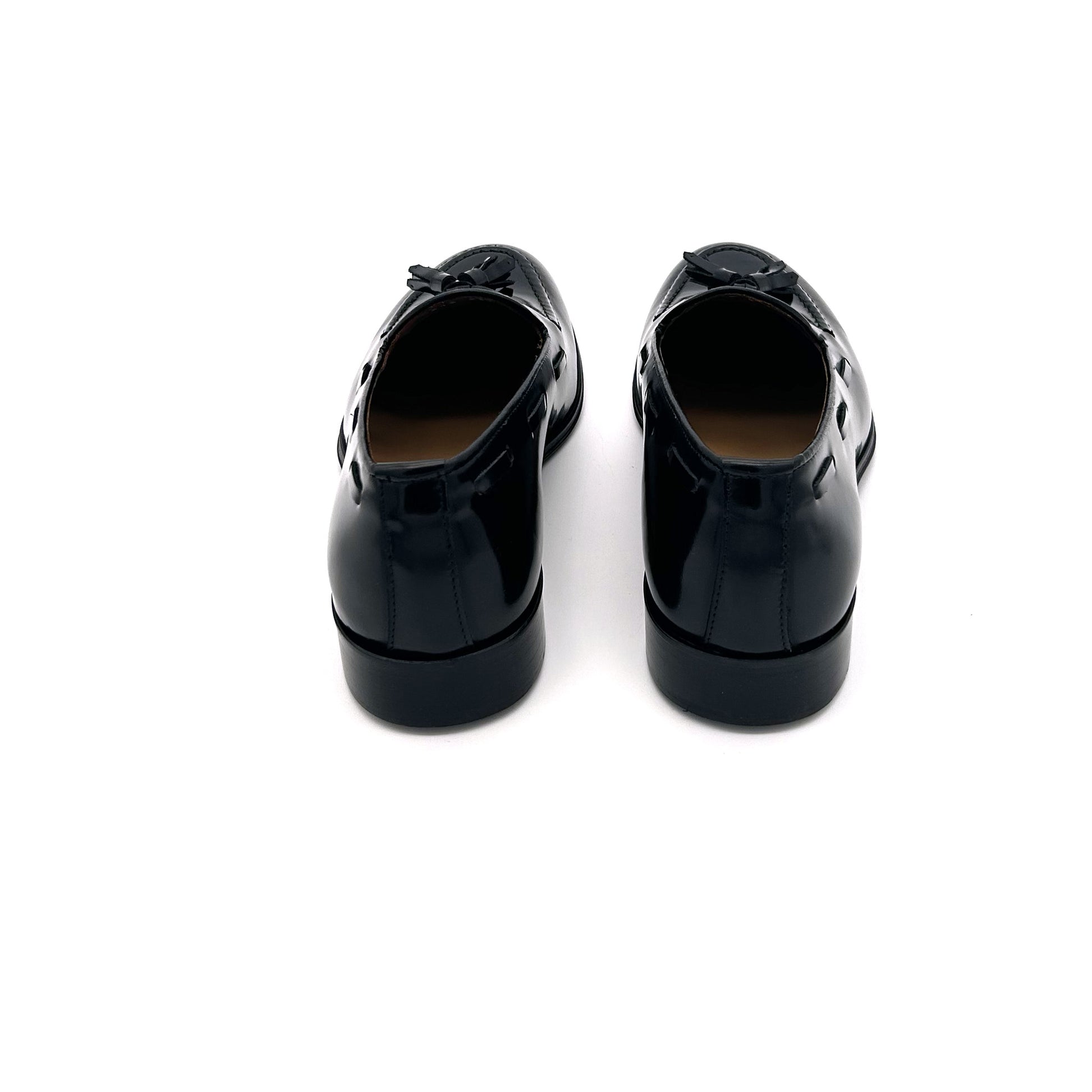 Mocassino con nappine in pelle di vitello spazzolata colore nero. La pelle spazzolata o abrasivata è liscia e lucente - non è vernice! - venendo prima levigata, poi spennellata con cera abrasiva, infine passata sotto le spazzole per rimuovere la cera in eccesso. Curata in modo maniacale in ogni dettaglio, come la profondità della scollatura: leggermente più profonda di un mocassino classico ma non esageratamente. Scarpa adatta e perfetta per ogni tipo di look: abito elegante, abito formale, abito da lavoro, spezzato, jeans, chinos... sta bene con tutto!!! Suola in cuoio cucita a mano.
