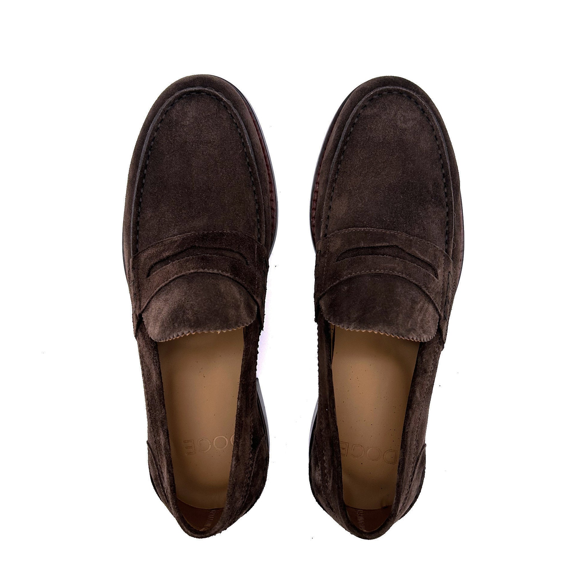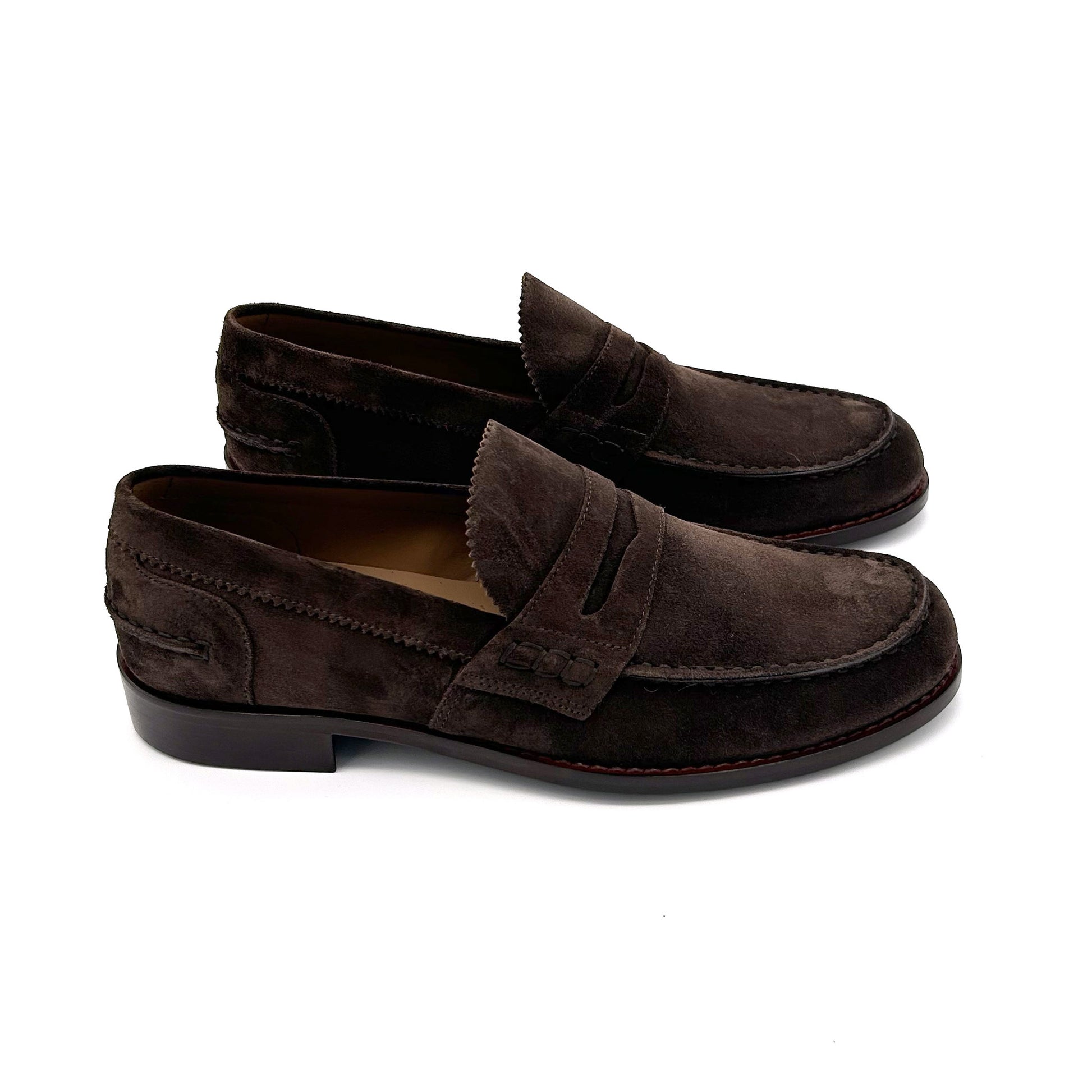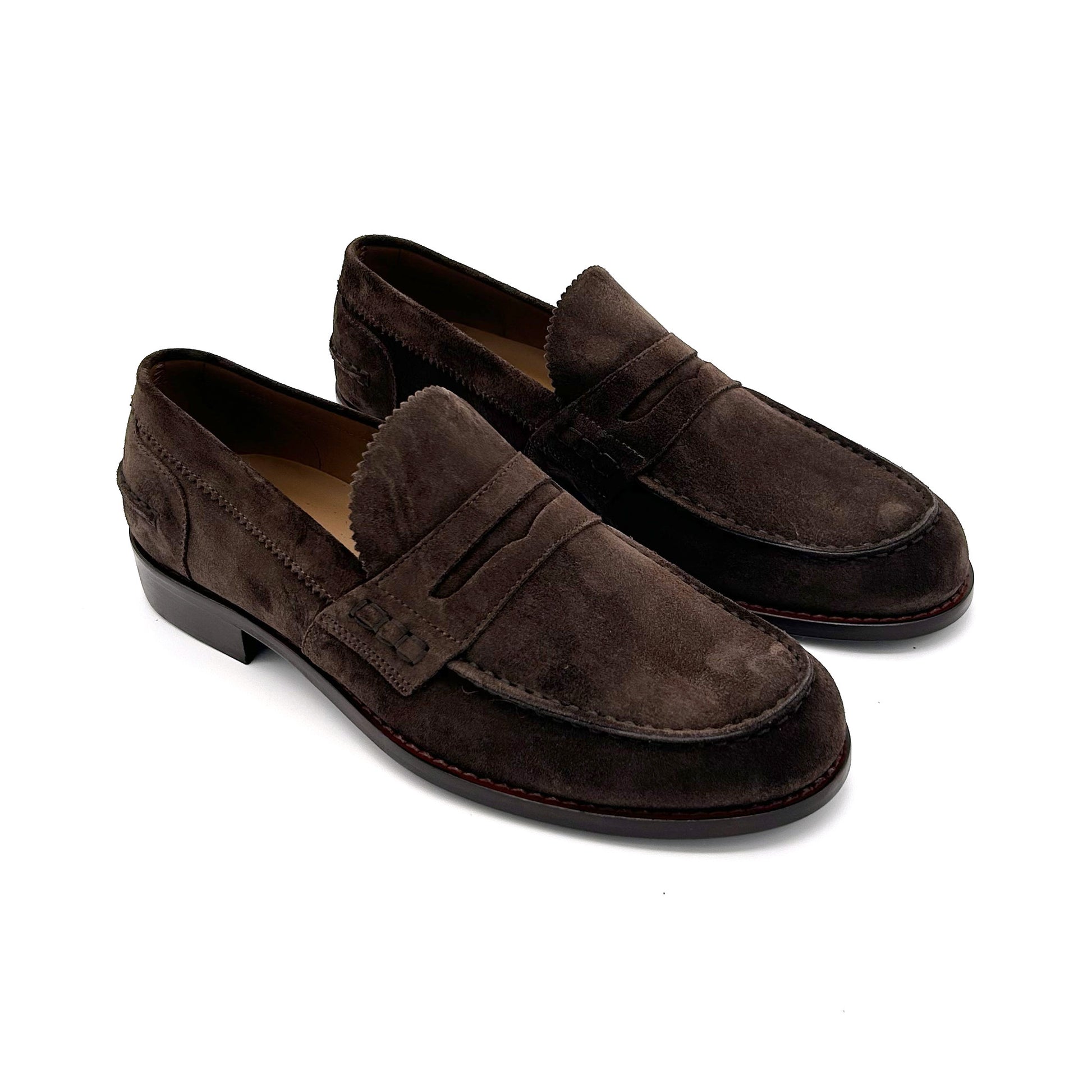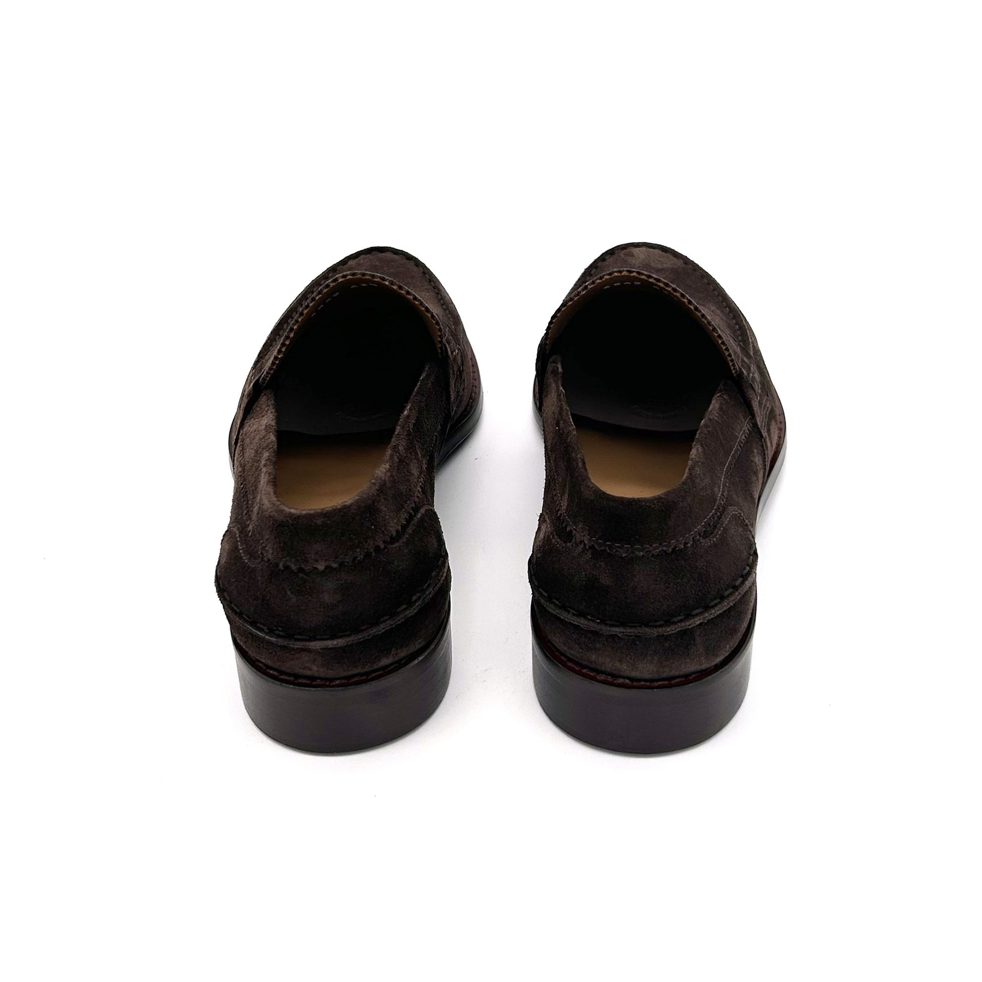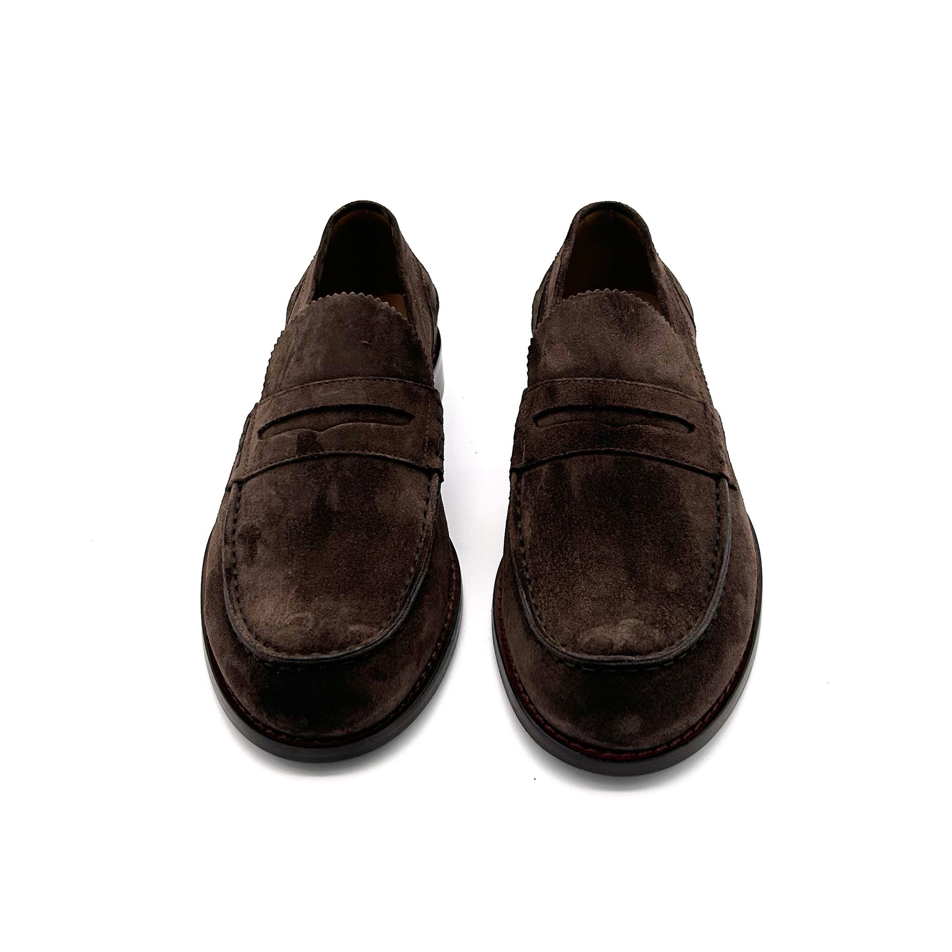 Mocassino college realizzato in pelle scamosciata di colore testa di moro. È il college nella sua vera forma, la più classica ed autentica, che contraddistingue un'eleganza disinvolta tipica dello stile made in Italy. Presenta una punta leggermente arrotondata, la mascherina, e la linguetta che termina con un taglio smerlato, a zig-zag: dettaglio che deriva dalla mano degli artigiani, che chiamano sbizzatura. Suola in cuoio cucita a mano.