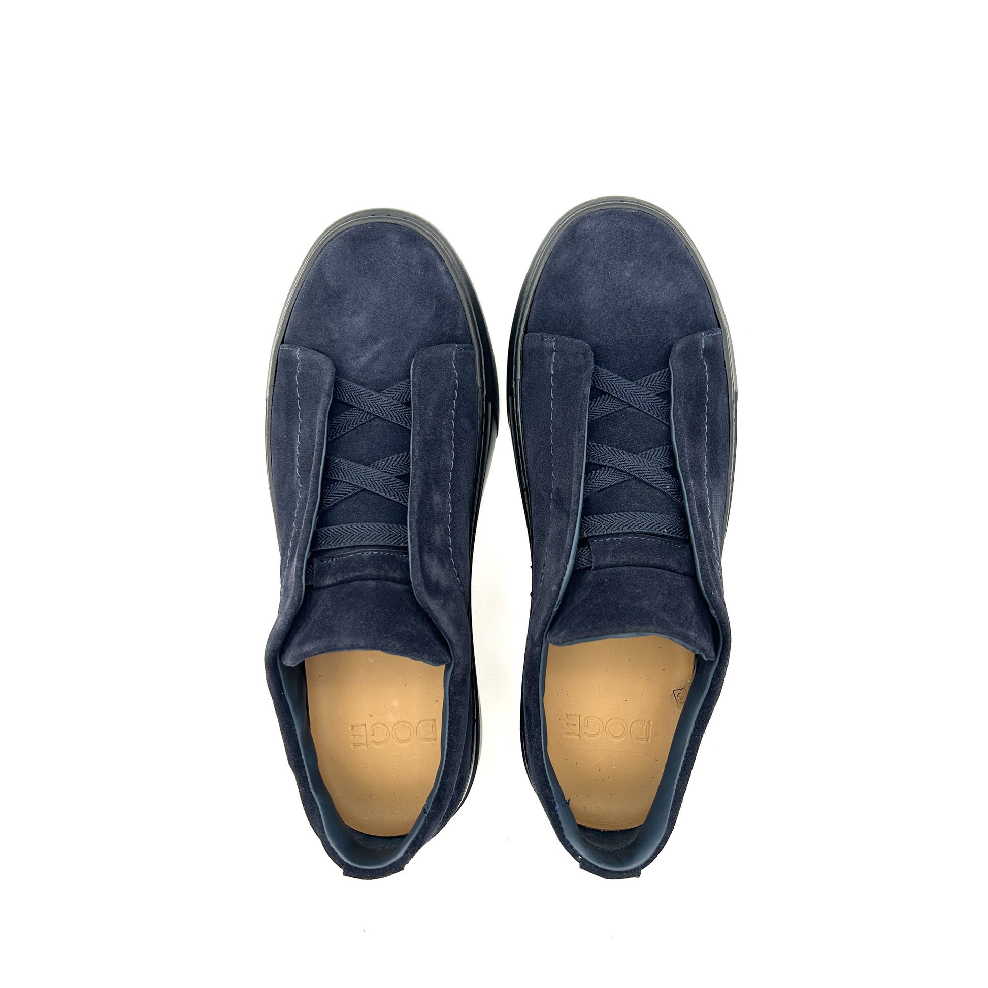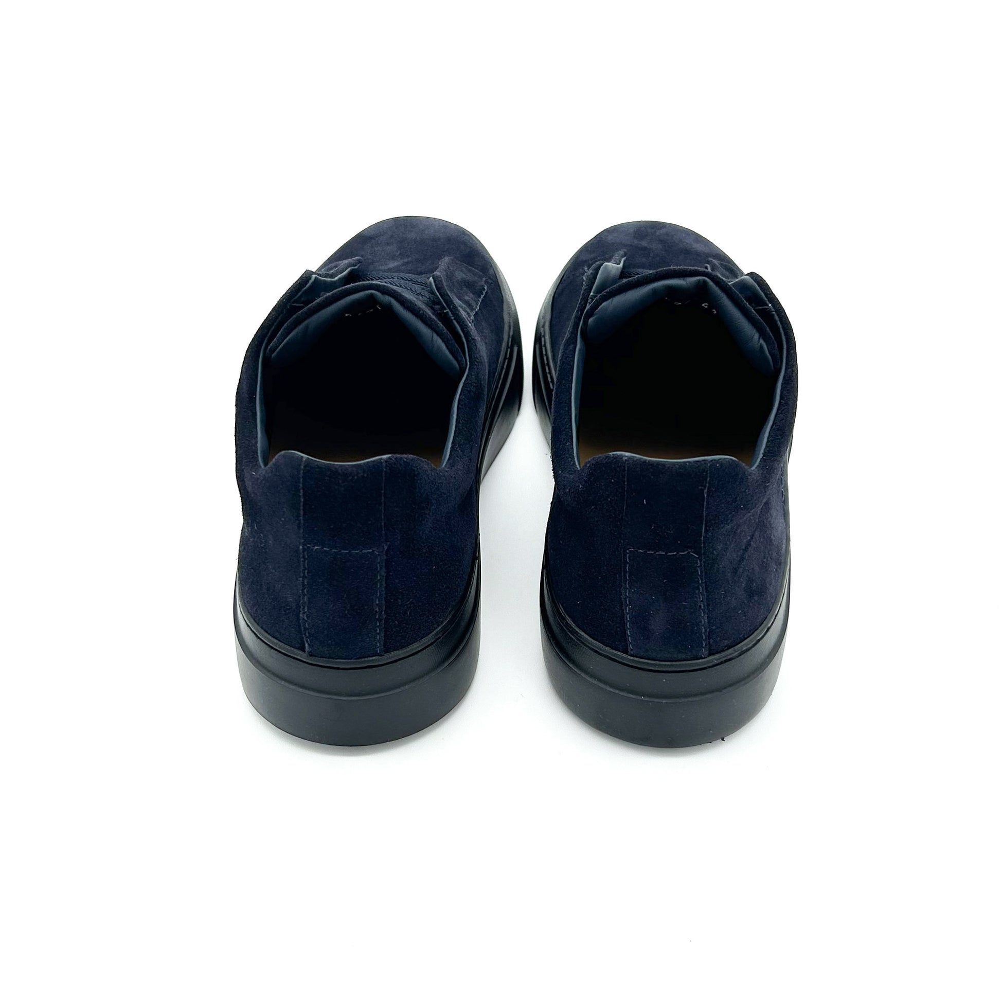 Sneaker realizzata in pelle di vitello scamosciata colore blu navy. Caratterizzata da un'allacciatura fissa con elastici e senza lacci, avvolge il piede alla perfezione garantendo il massimo della comodità e della flessibilità. Morbido plantare interno estraibile. Fondo a cassetta con suola in gomma.