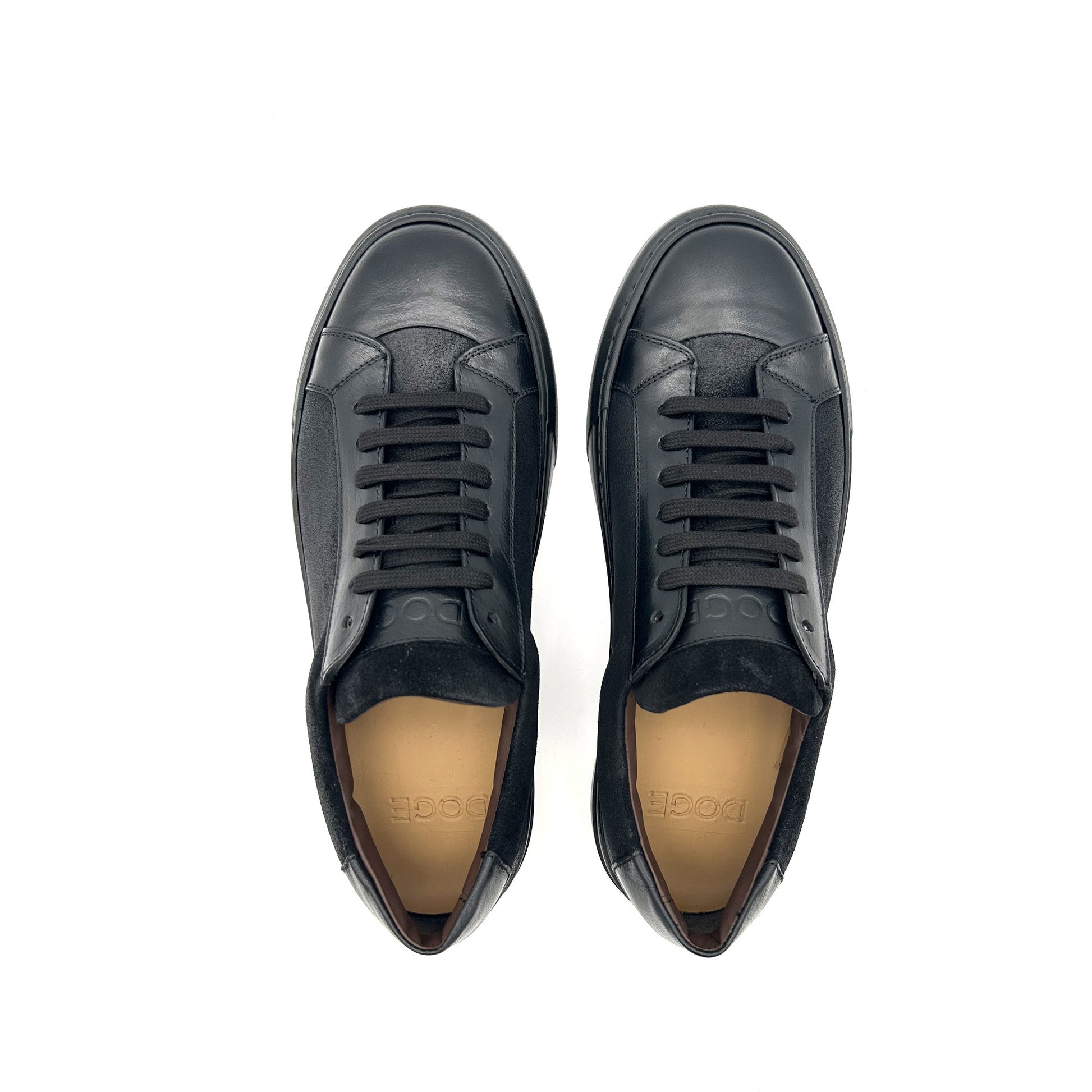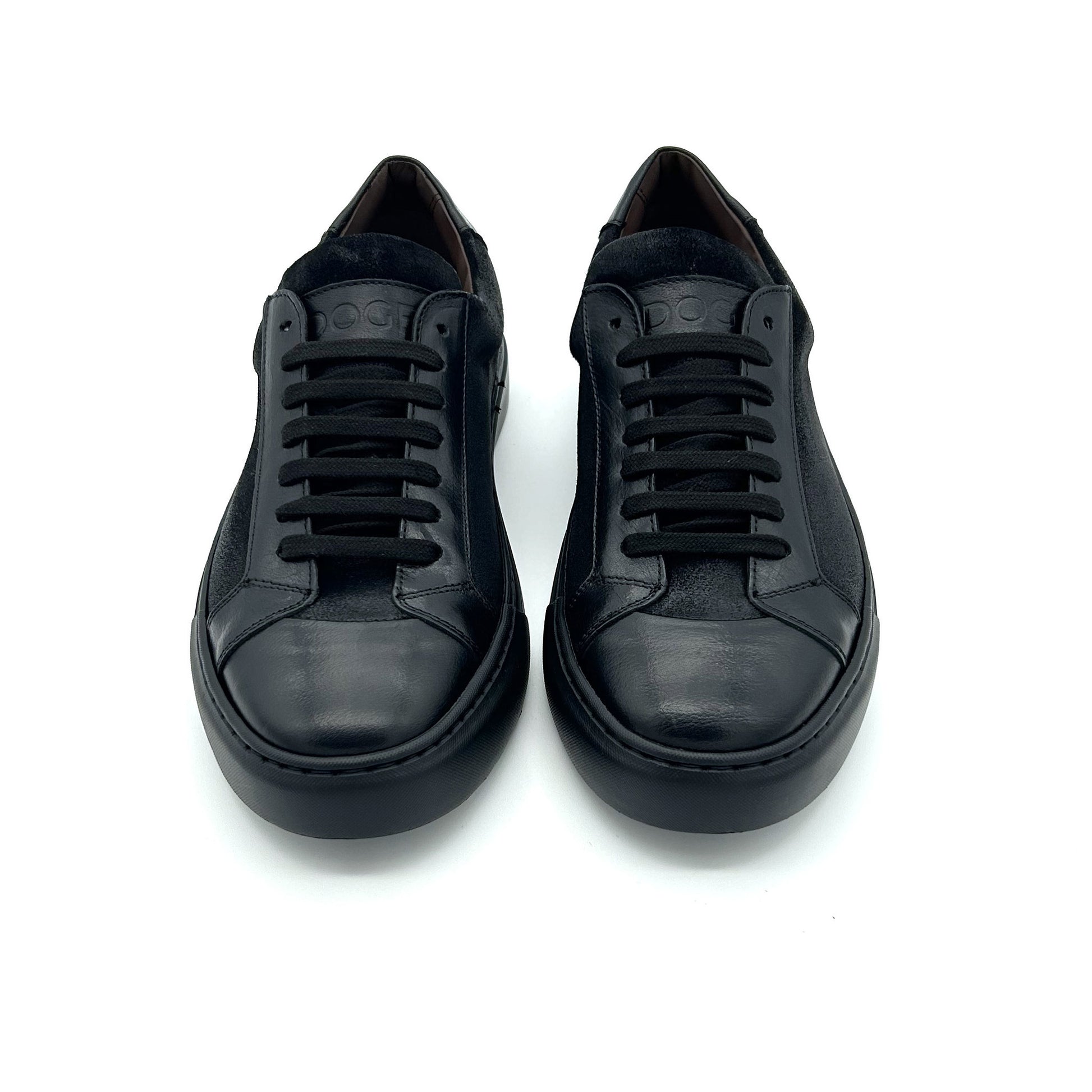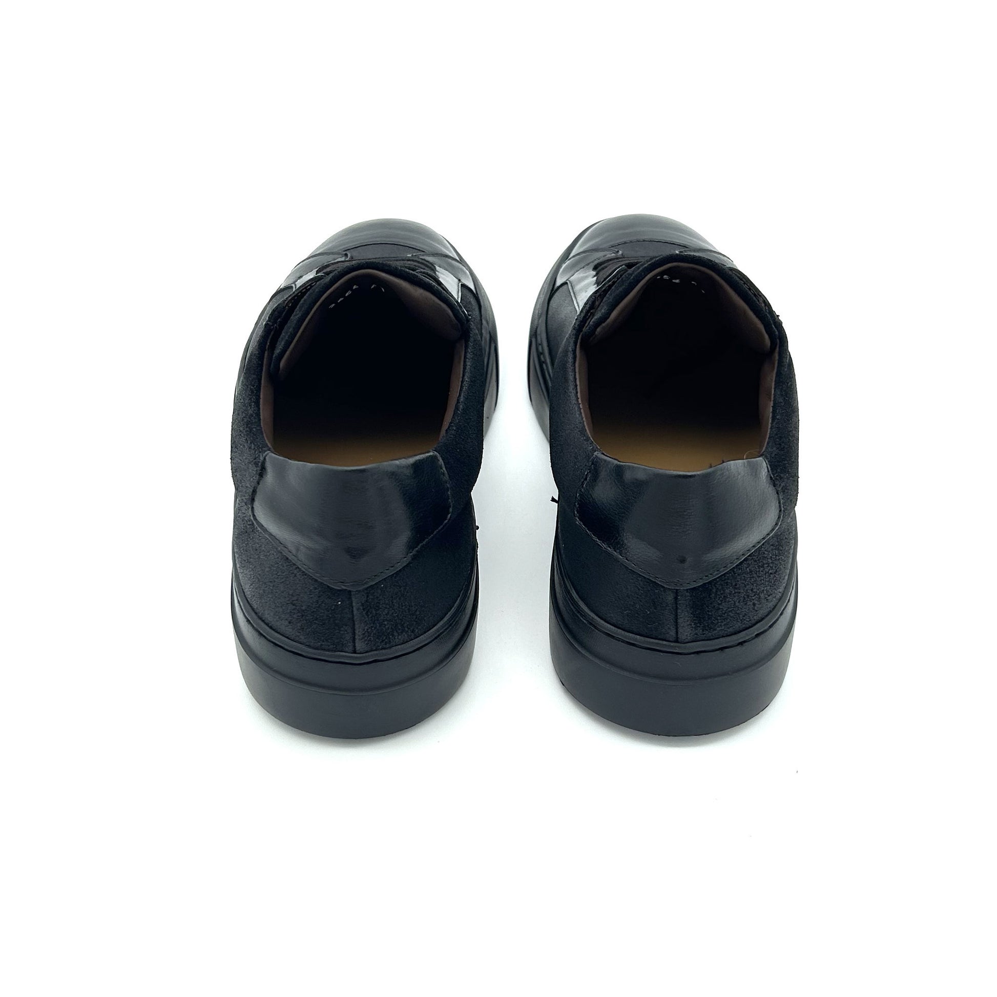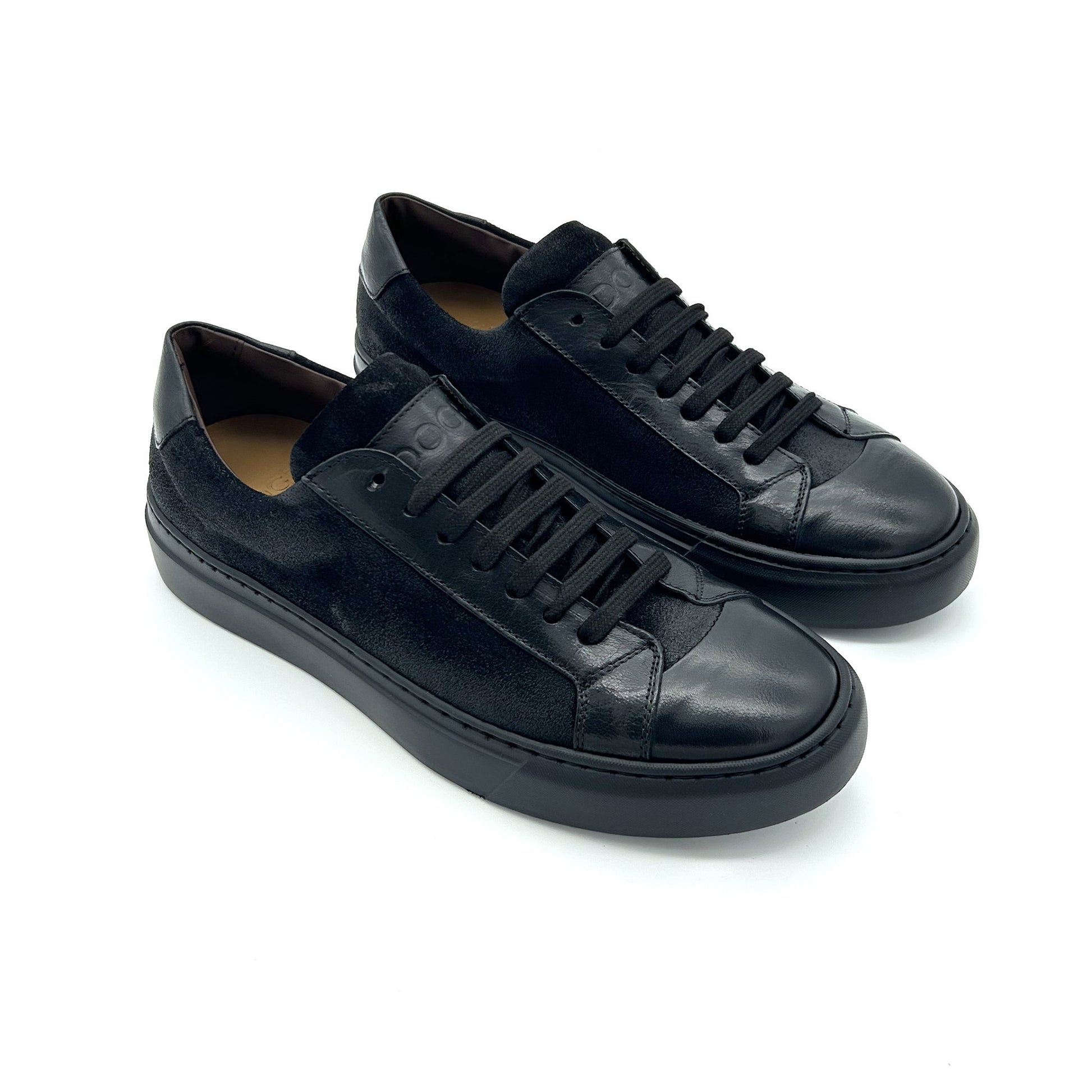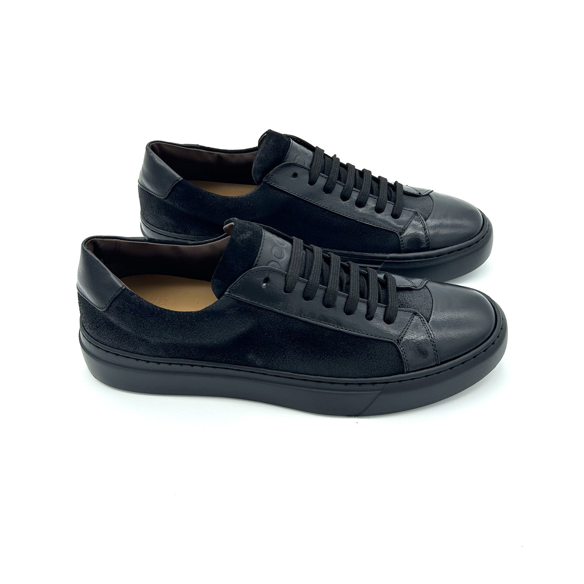 Sneaker realizzata in pelle di bufalo spazzolata e pelle di vitello scamosciata effetto vintage, di colore nero. Scarpa dalle linee semplici, classiche e pulite, per uno stile casual ma raffinato. Morbido plantare interno estraibile. Fondo a cassetta con suola in gomma tono su tono.