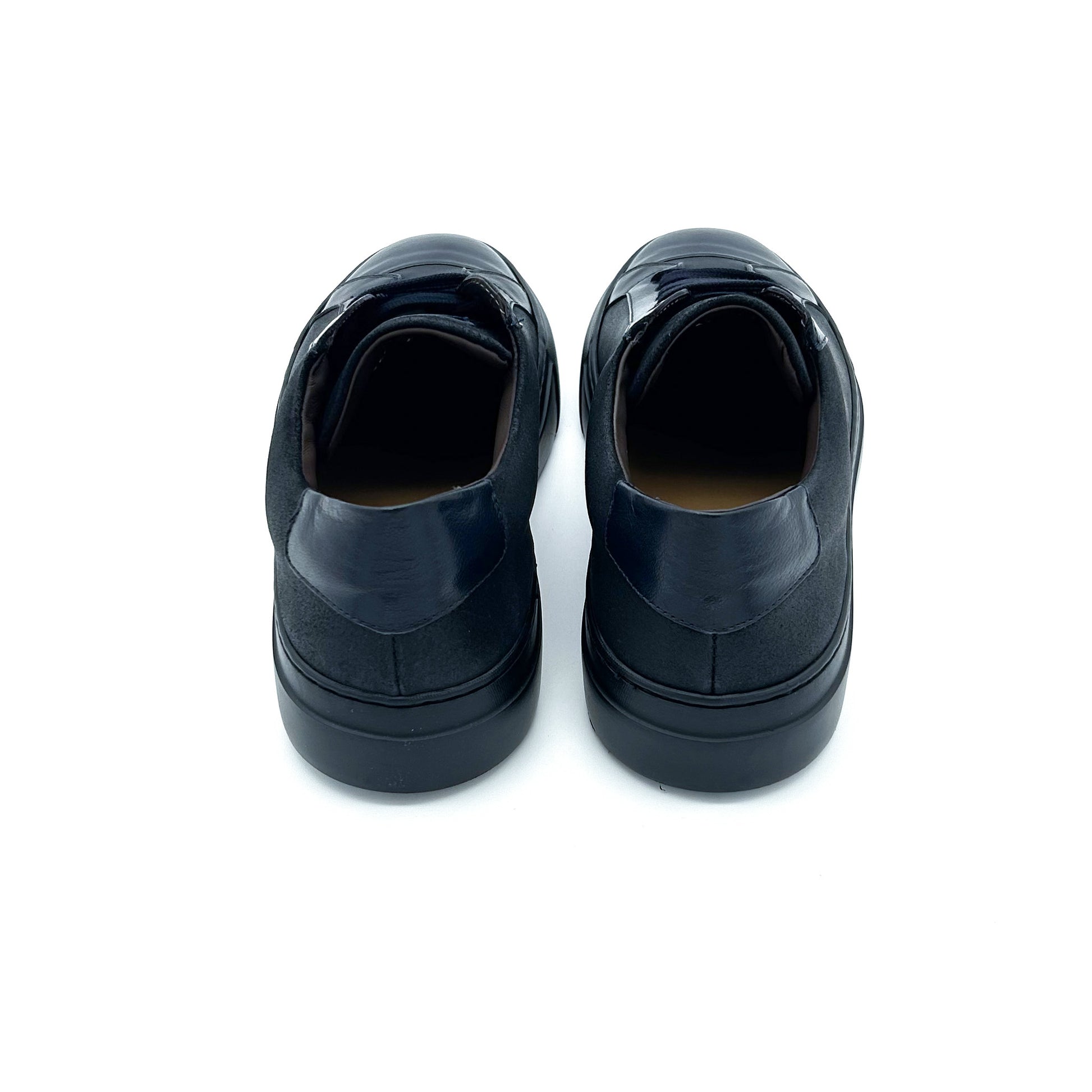 Sneaker realizzata in pelle di bufalo spazzolata e pelle di vitello scamosciata effetto vintage, di colore blu. Scarpa dalle linee semplici, classiche e pulite, per uno stile casual ma raffinato. Morbido plantare interno estraibile. Fondo a cassetta con suola in gomma tono su tono.