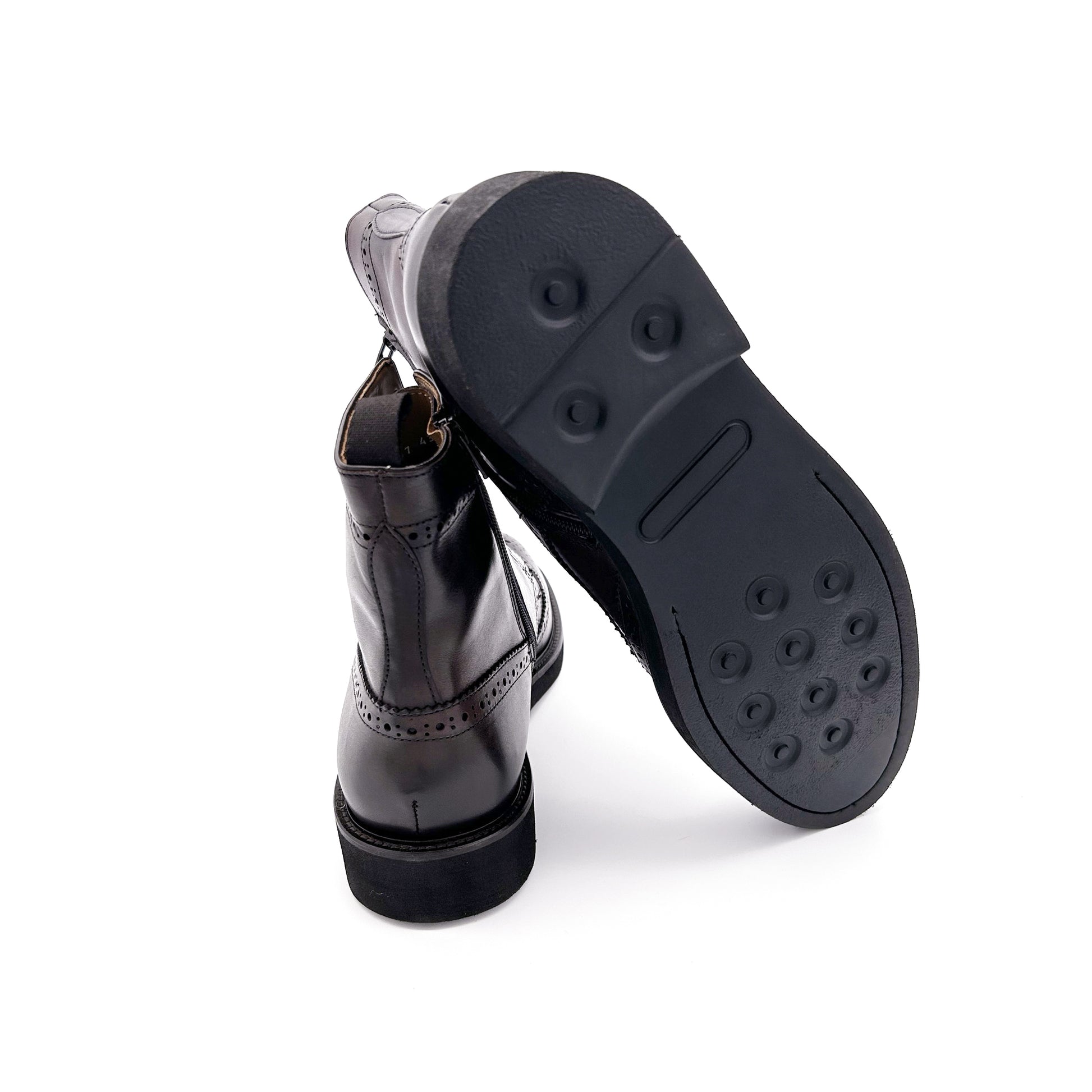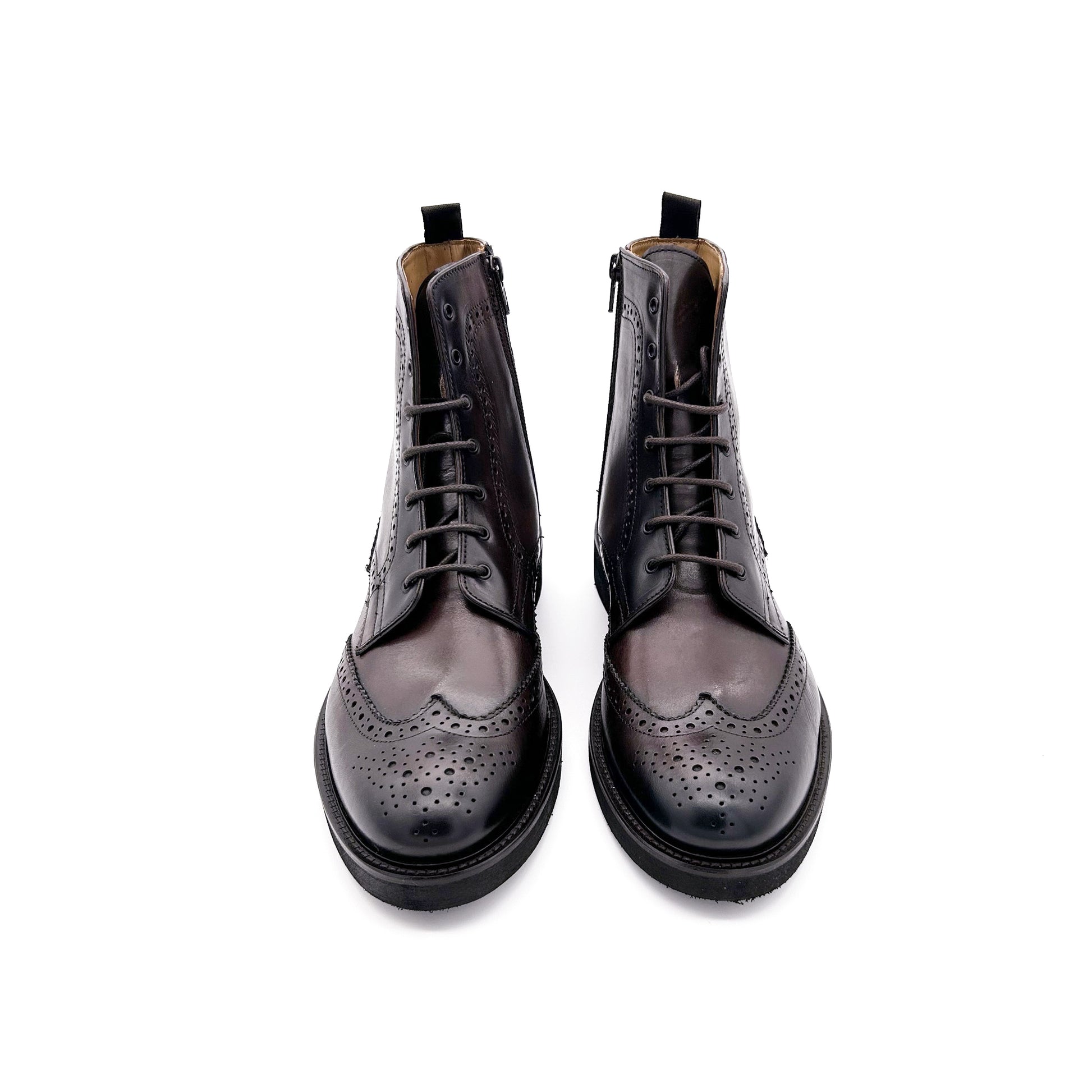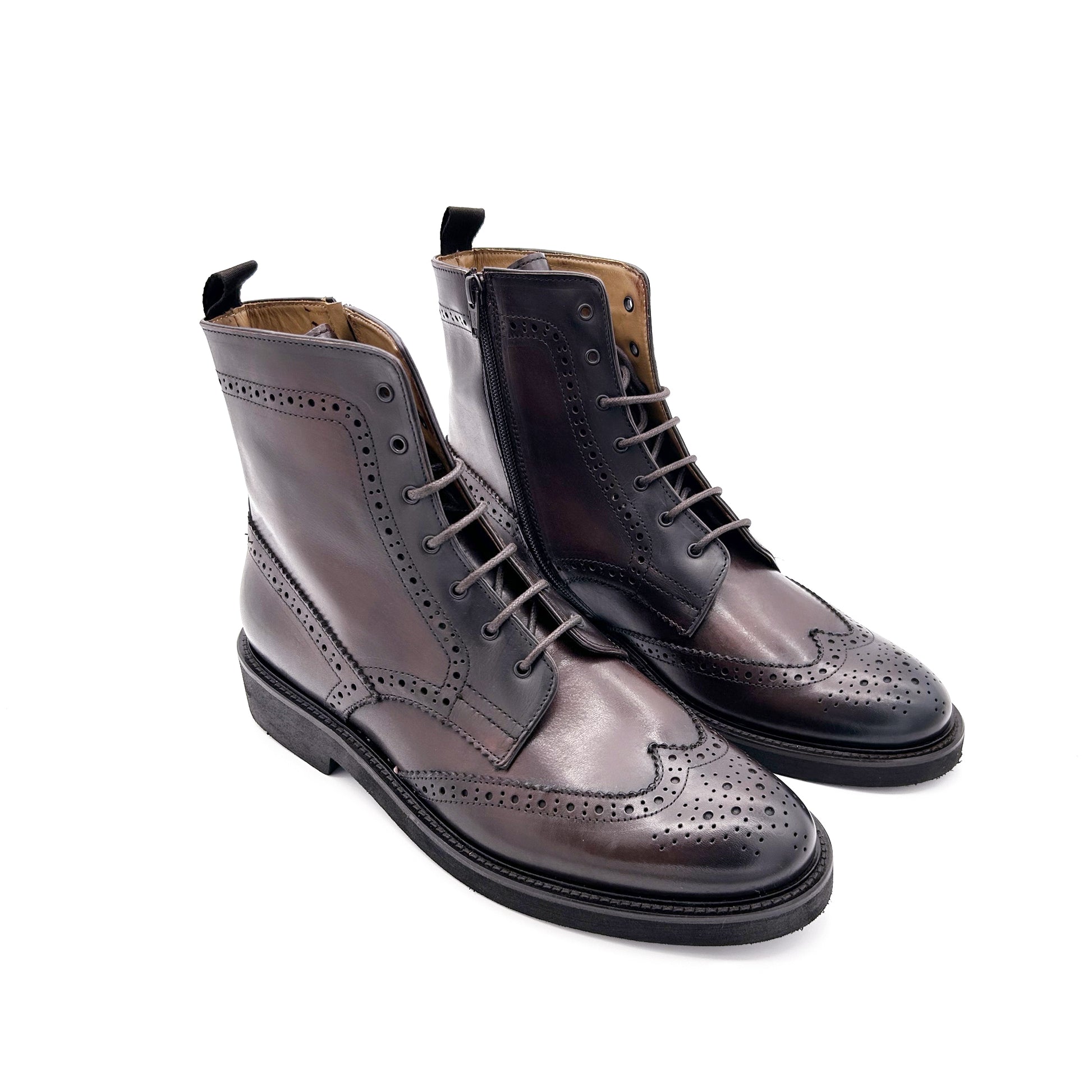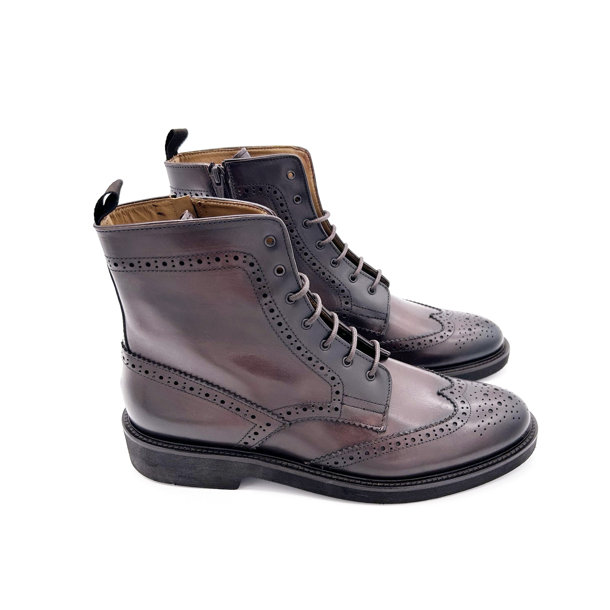 Stivaletto realizzato in pelle di vitello pieno fiore, la parte più esterna e pregiata, di color testa di moro. Classica fantasia coda di rondine. Pratica zip sulla parte interna della tomaia per facilitare l'indosso. Versatile e attuale, perfetto sotto un abito autunno-invernale col pantalone che sormonta il gambale o con un look più casual. Fodera interna in pelle e suola in gomma ultrilight.