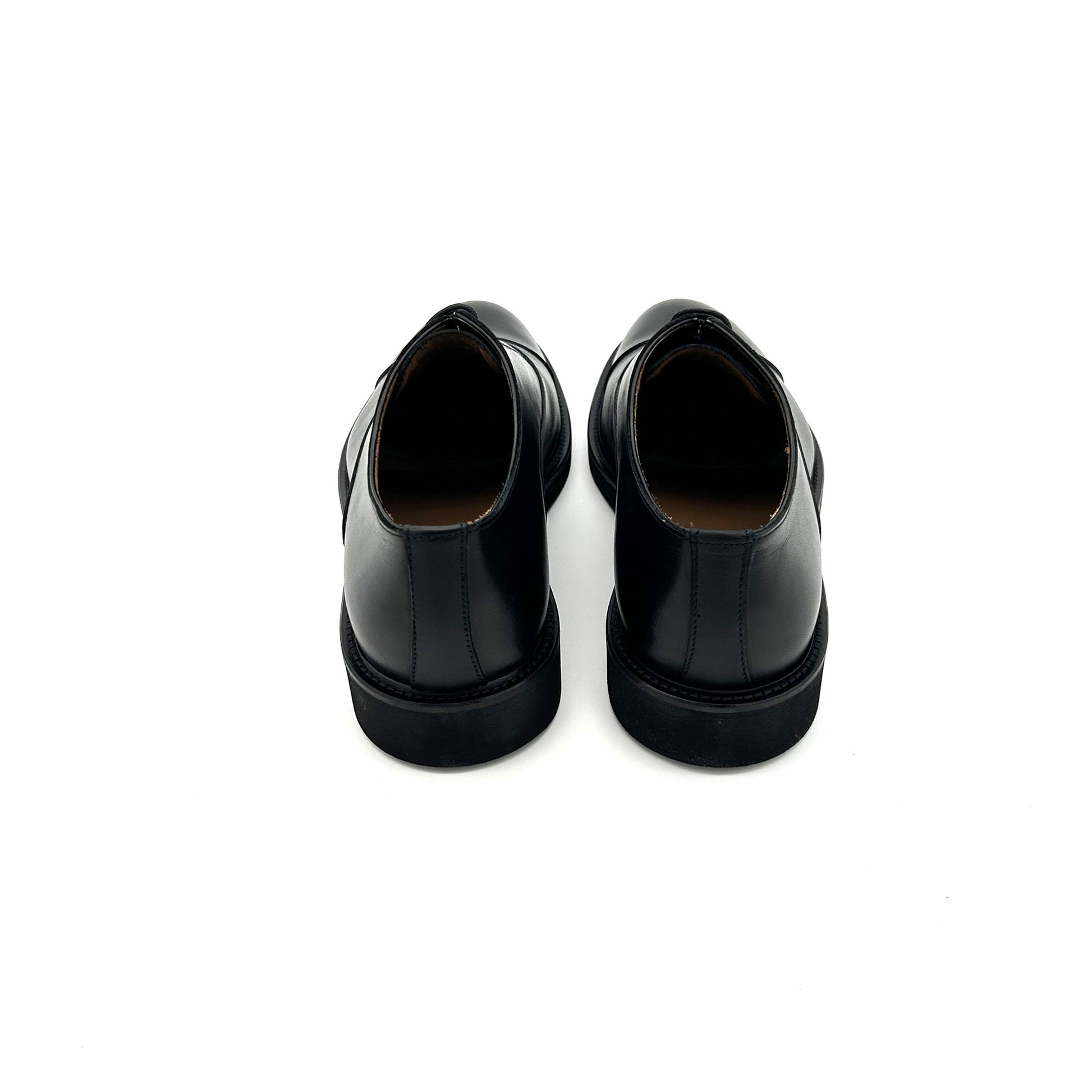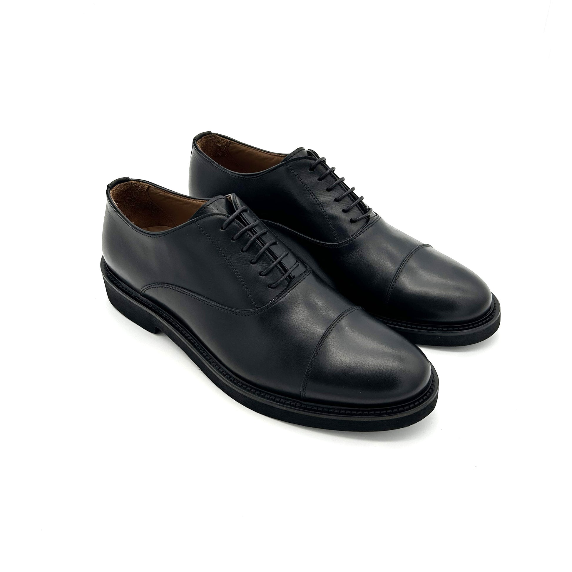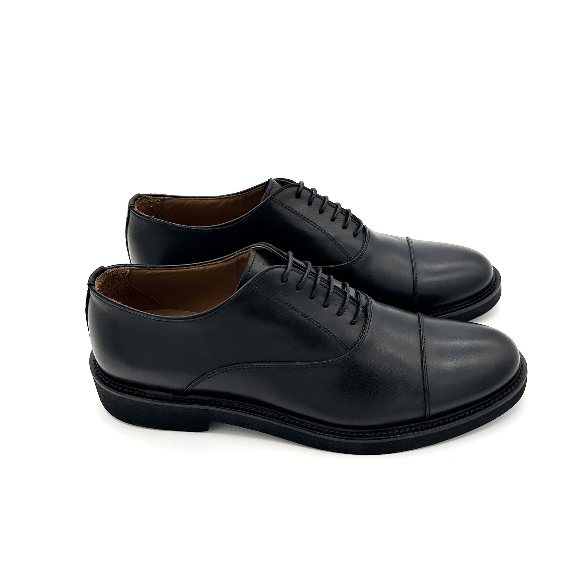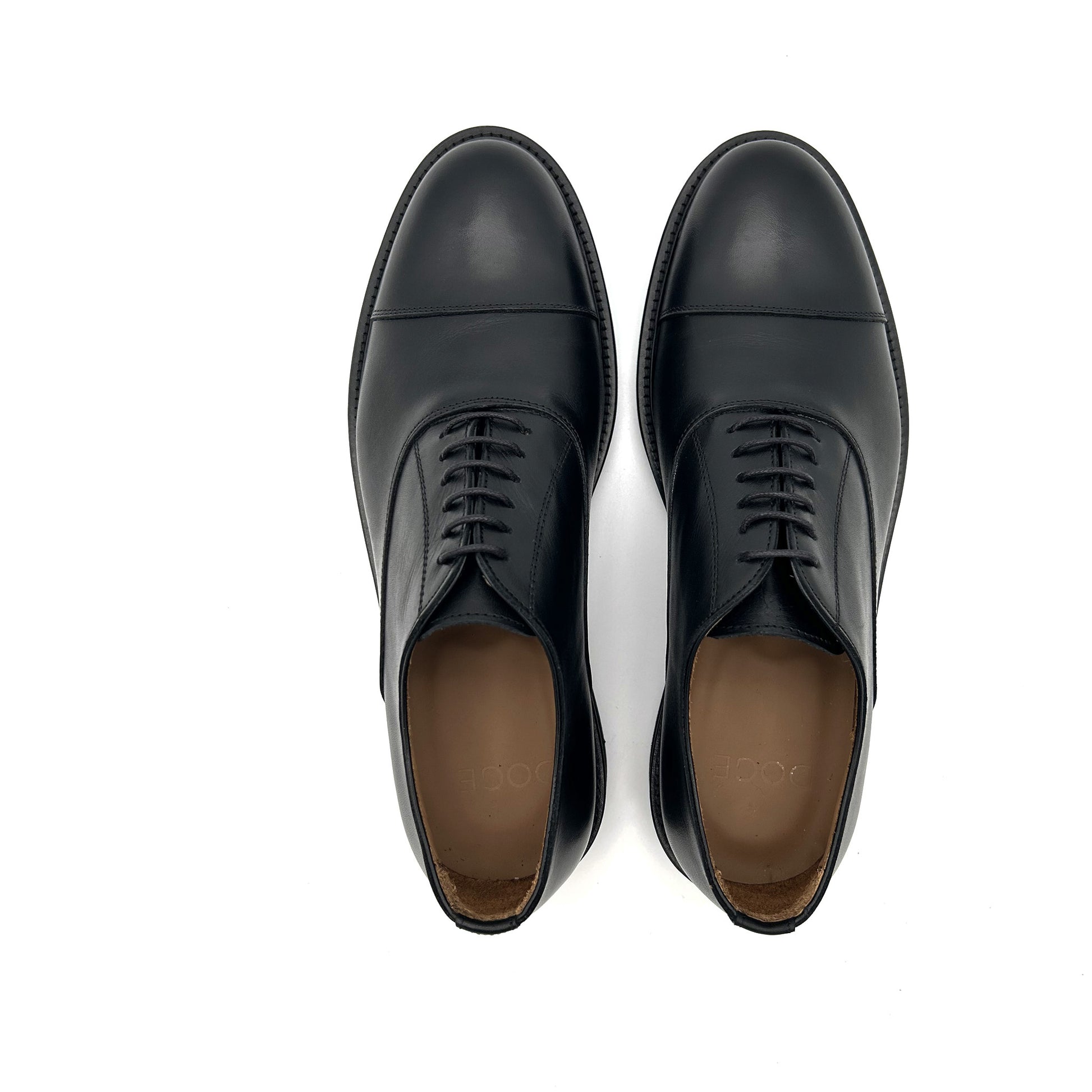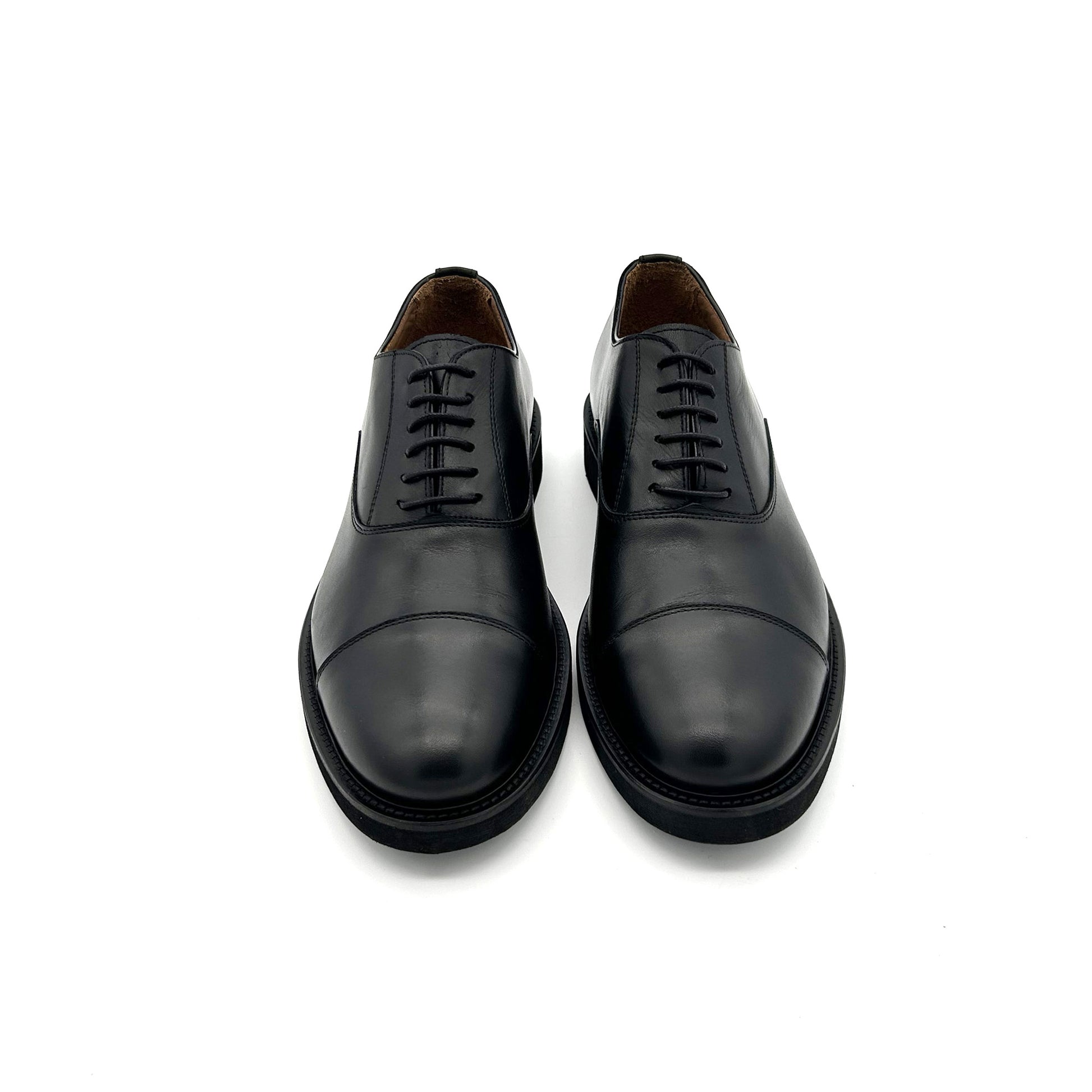 Francesina con puntale realizzata in pelle di vitello pieno fiore, la parte più esterna e pregiata, di colore nero. Ideale per look formali, business. Suola in cuoio gomma a mano.