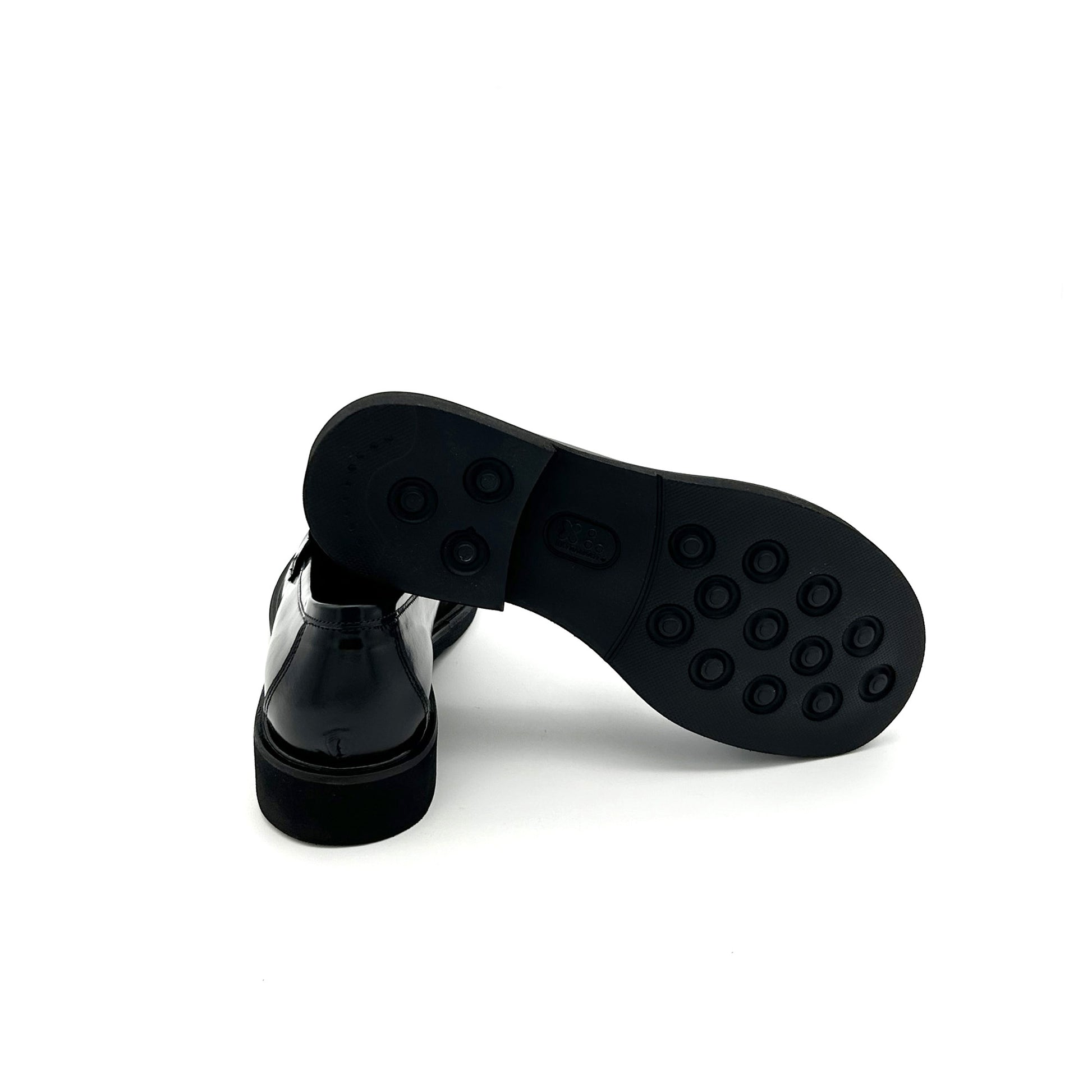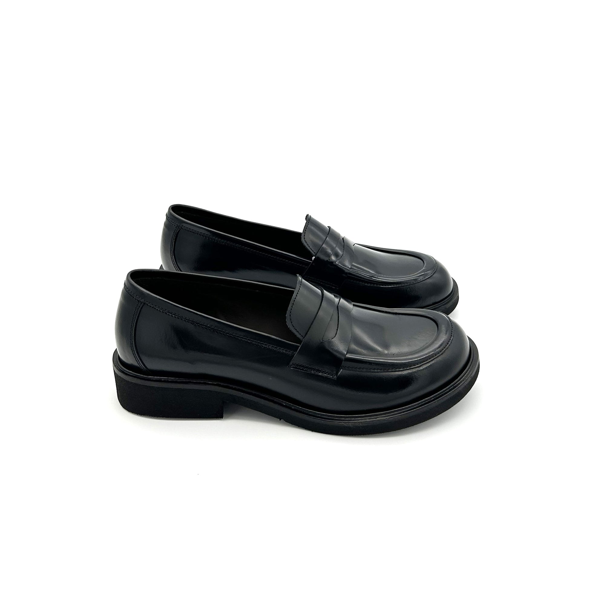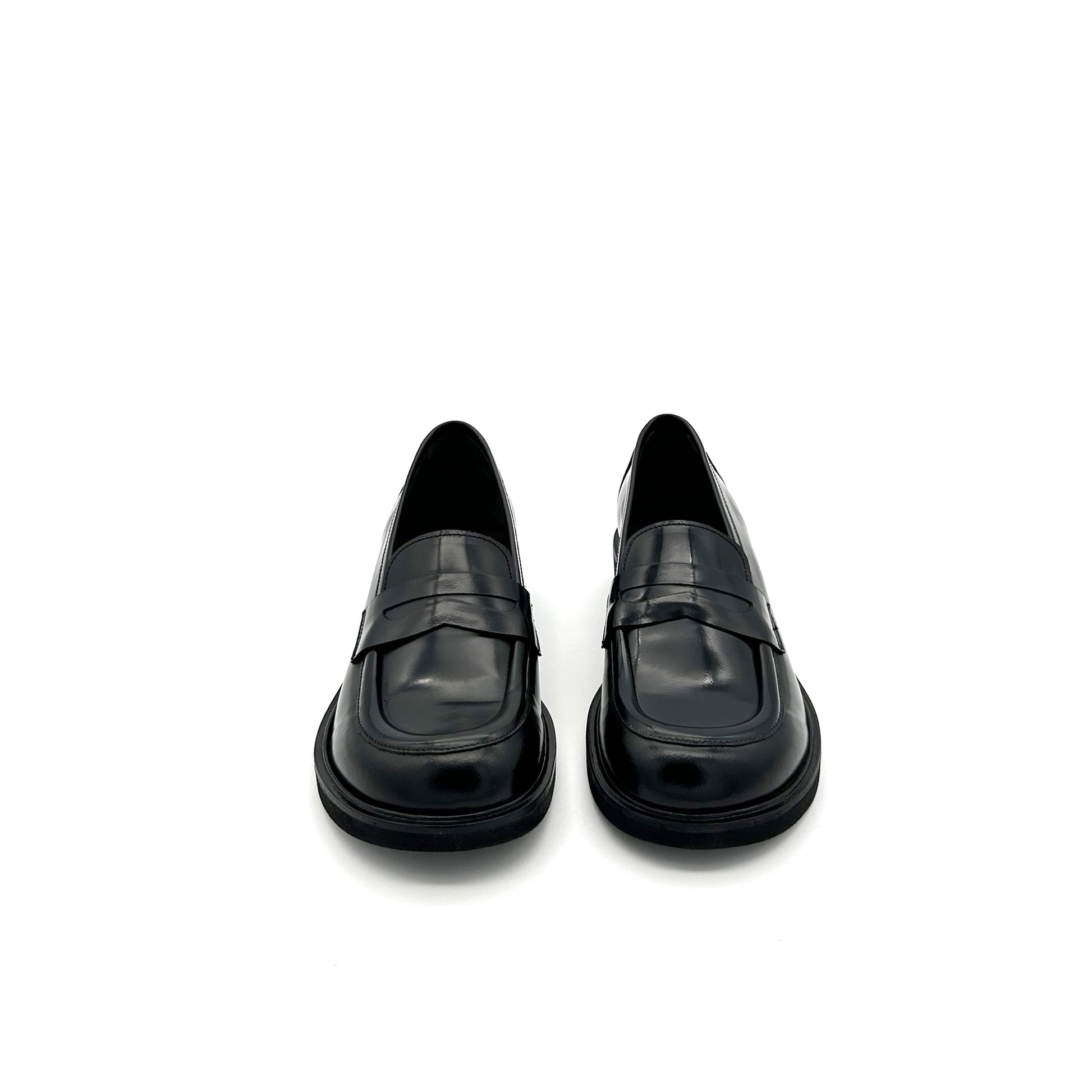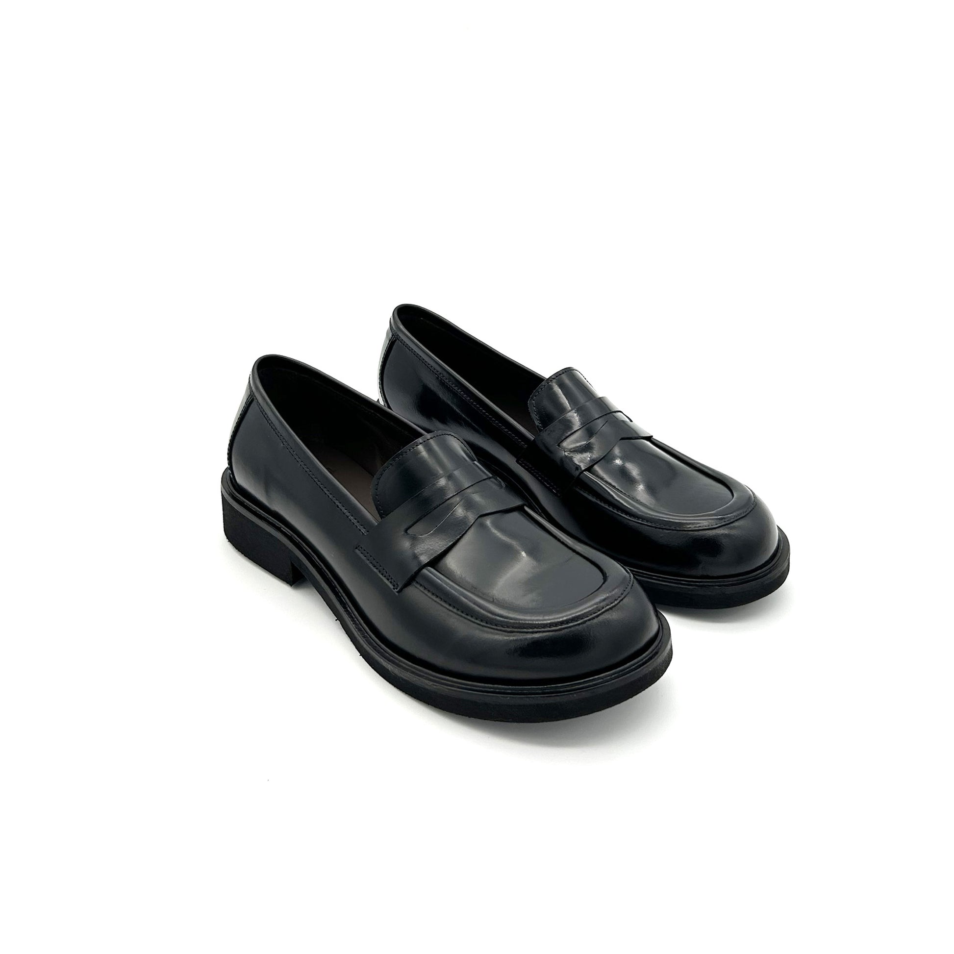 Mocassino college realizzato in pelle di vitello pieno fiore, la parte più esterna e pregiata, di colore nero. La sua particolarità è la sua forma: una delle ultime tendenze nel mondo delle calzature, presentata da tutti i brand più importanti del settore, è questa punta a piede, che richiama ossia la forma dello stesso. Suola in gomma.