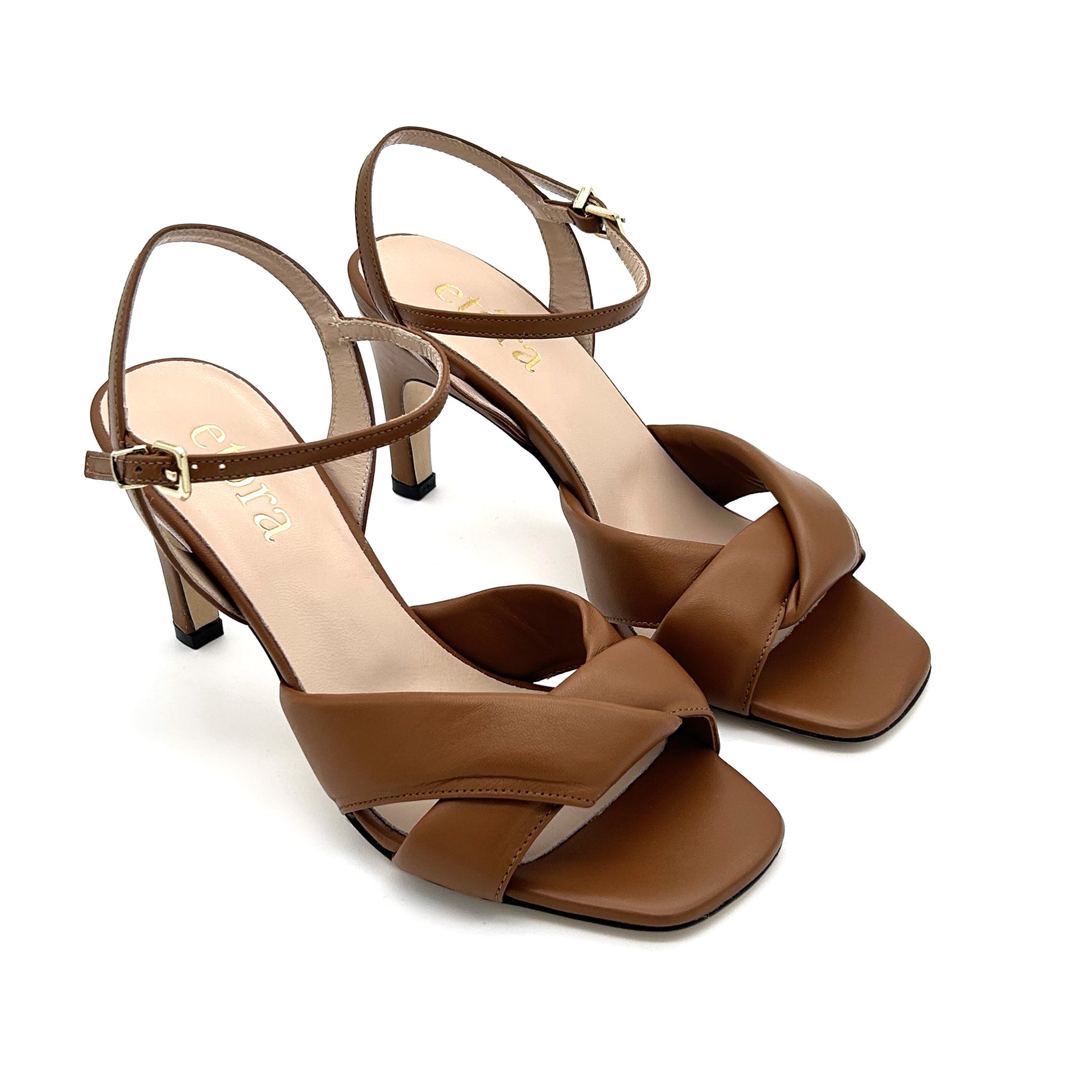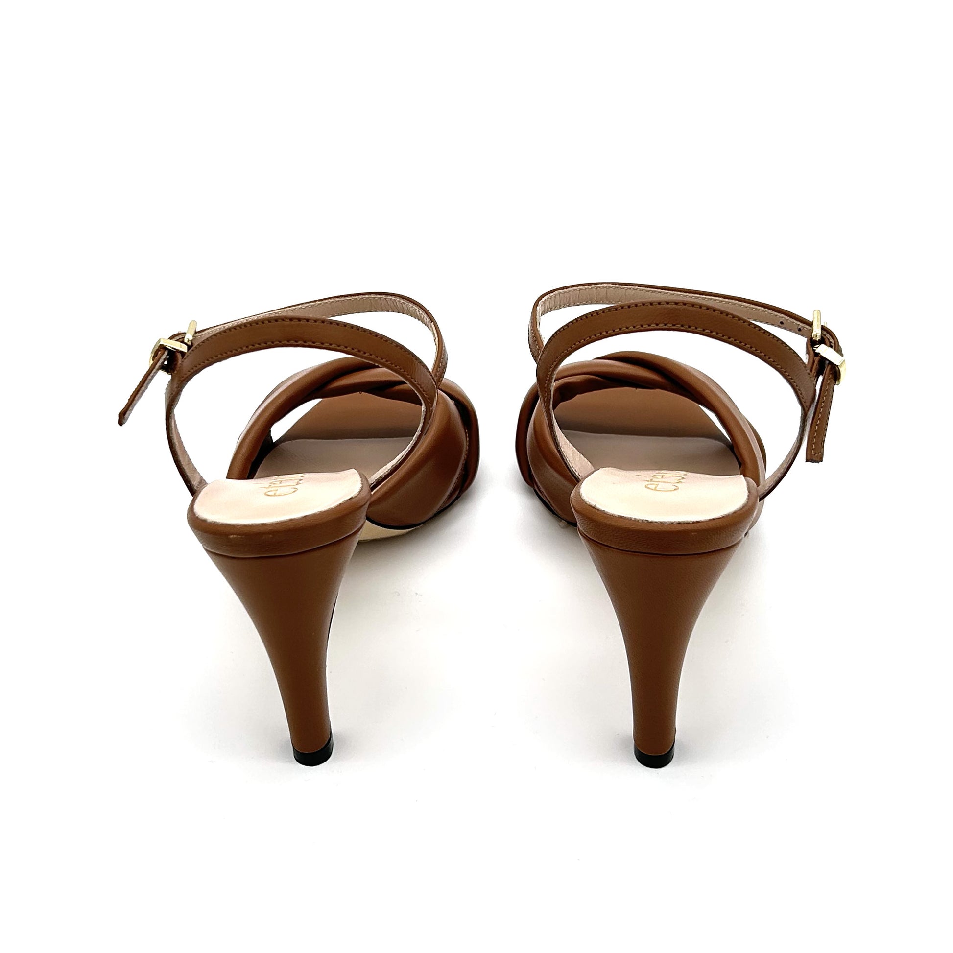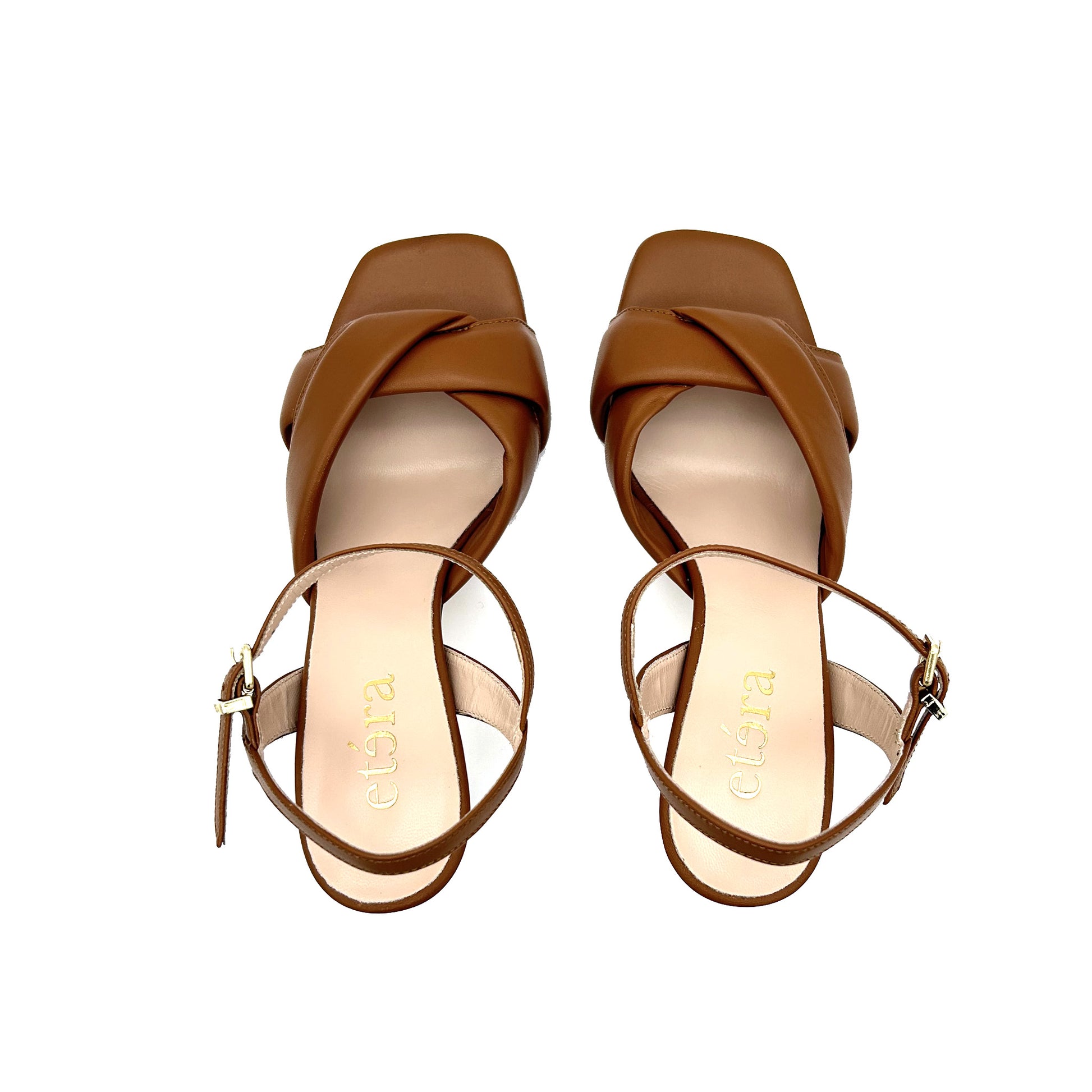 Sandalo con tacco di 7,5cm, realizzato in pelle di vitello pieno fiore, la parte più esterna e pregiata, di color cuoio. Soffice intreccio imbottito sulla parte anteriore. Cinturino alla caviglia con fibbia dorata. Morbido sottopiede in pelle leggermente imbottito. Suola in cuoio.