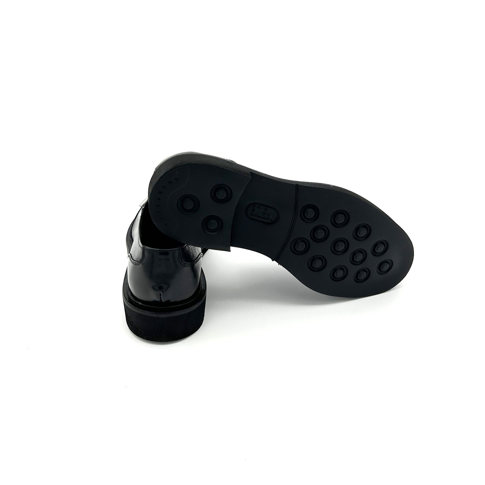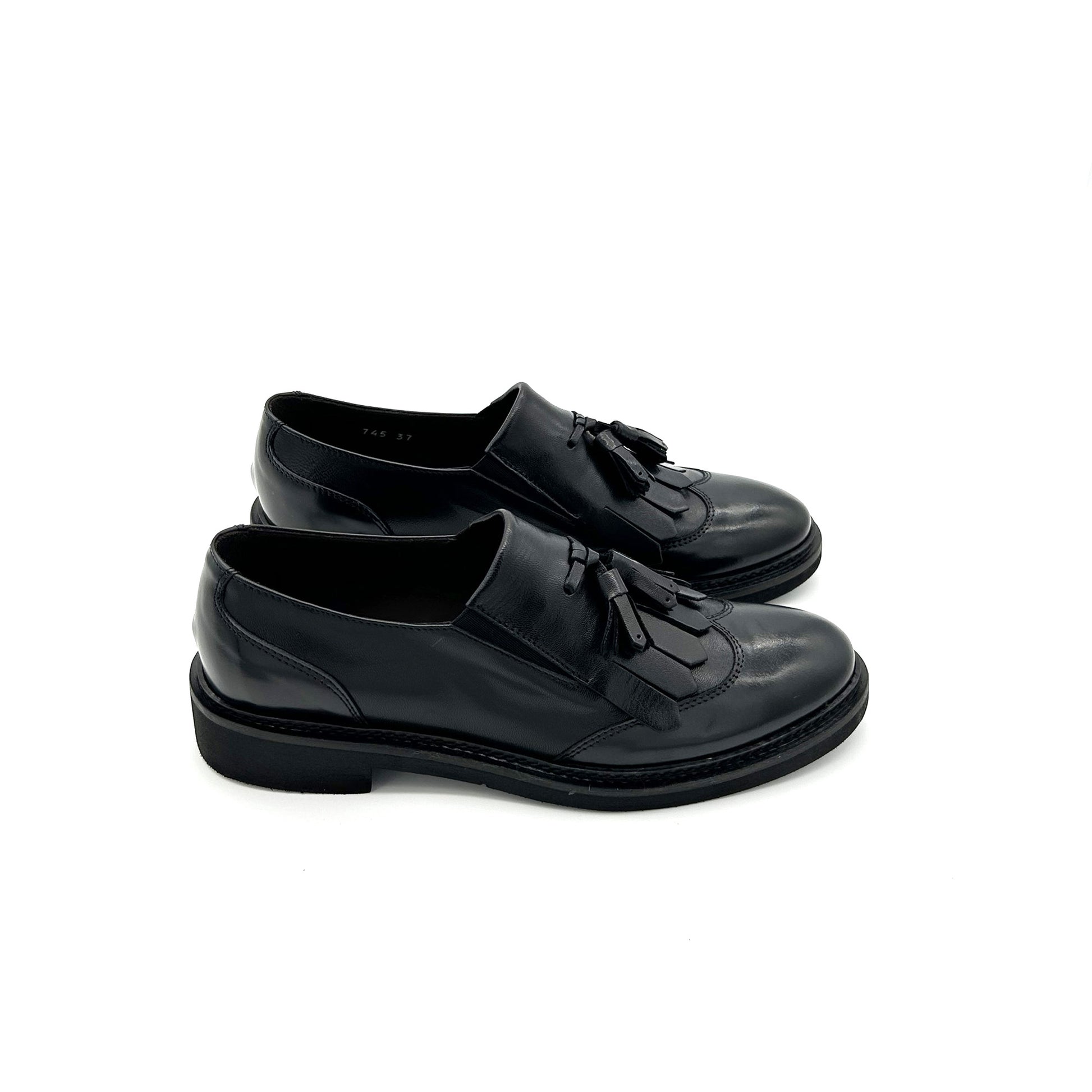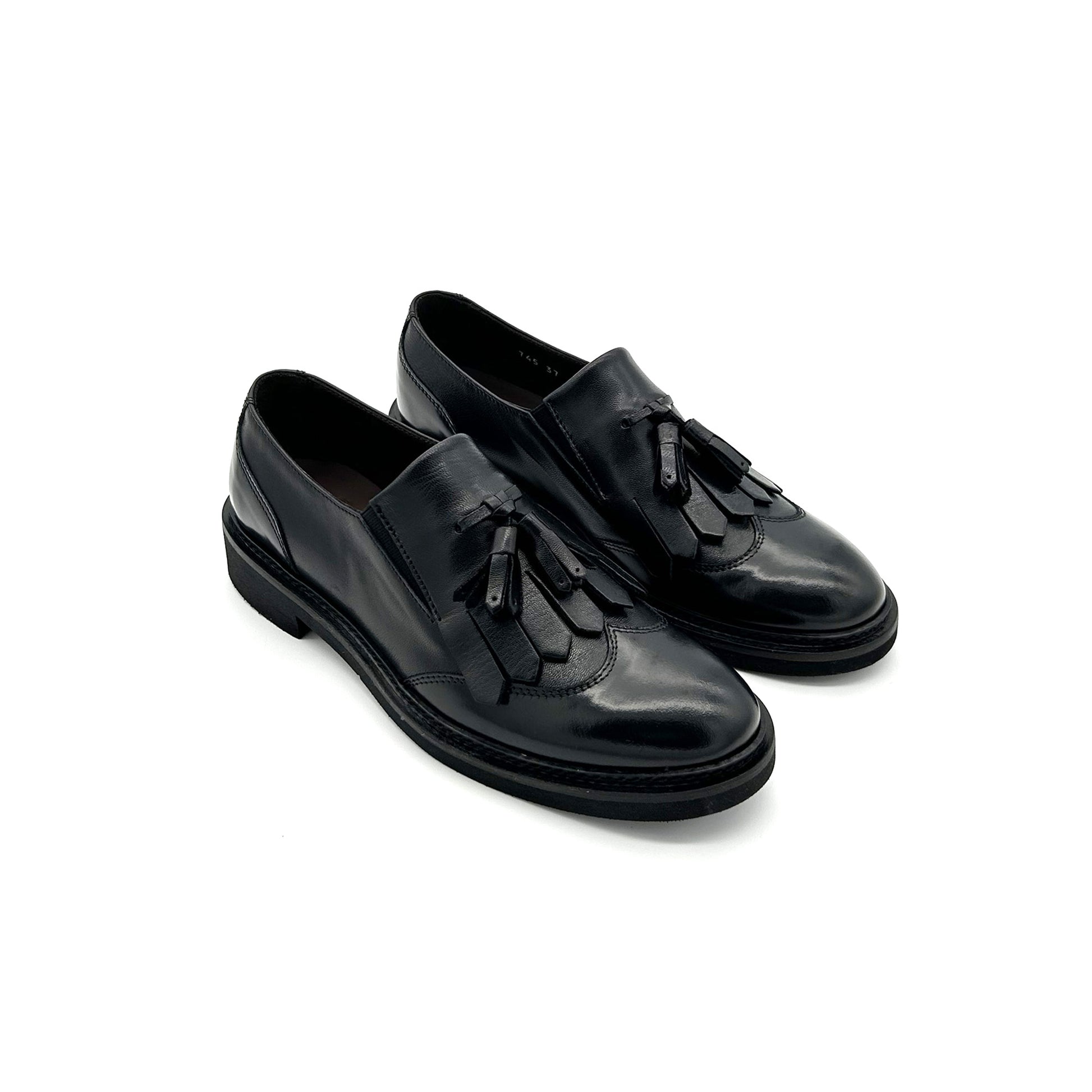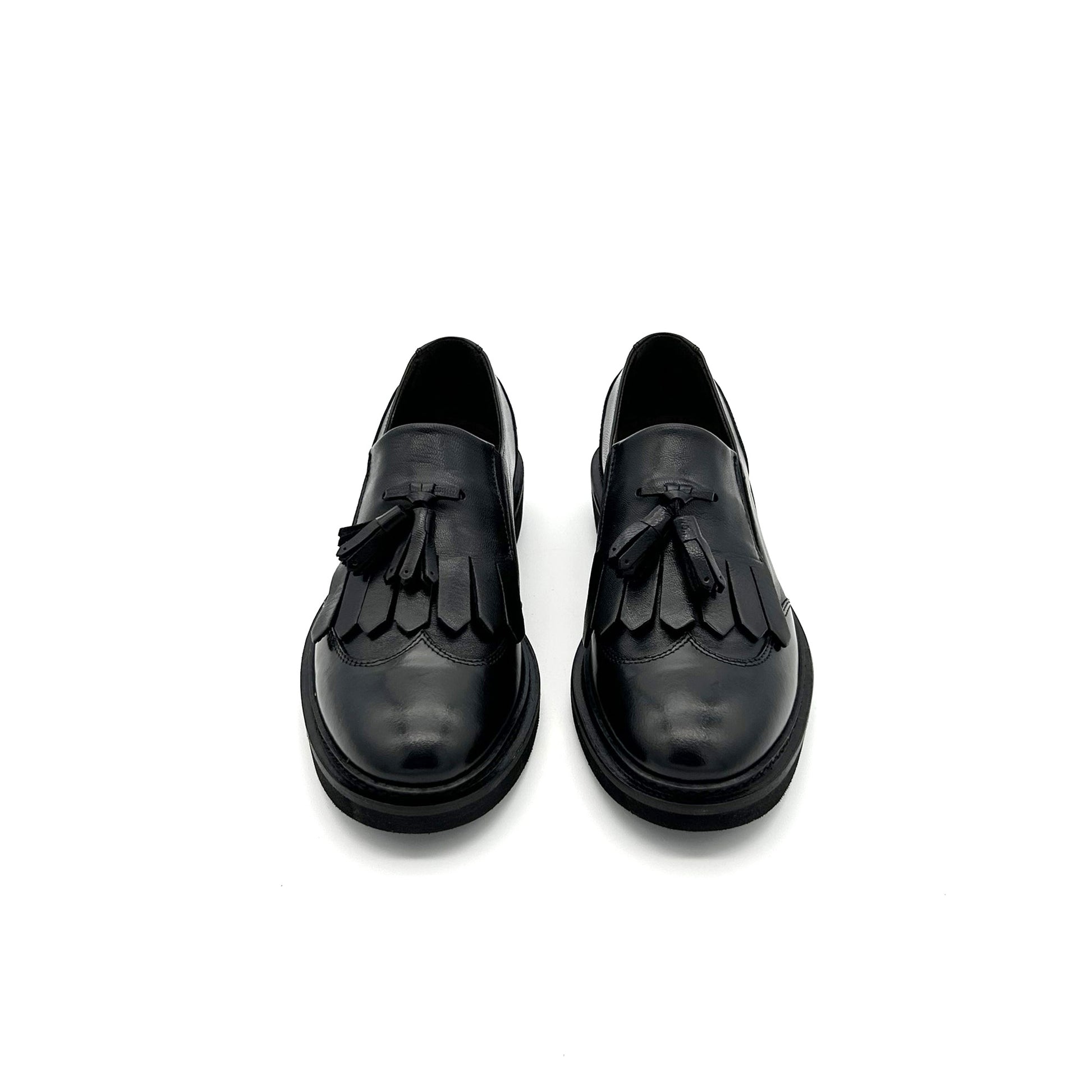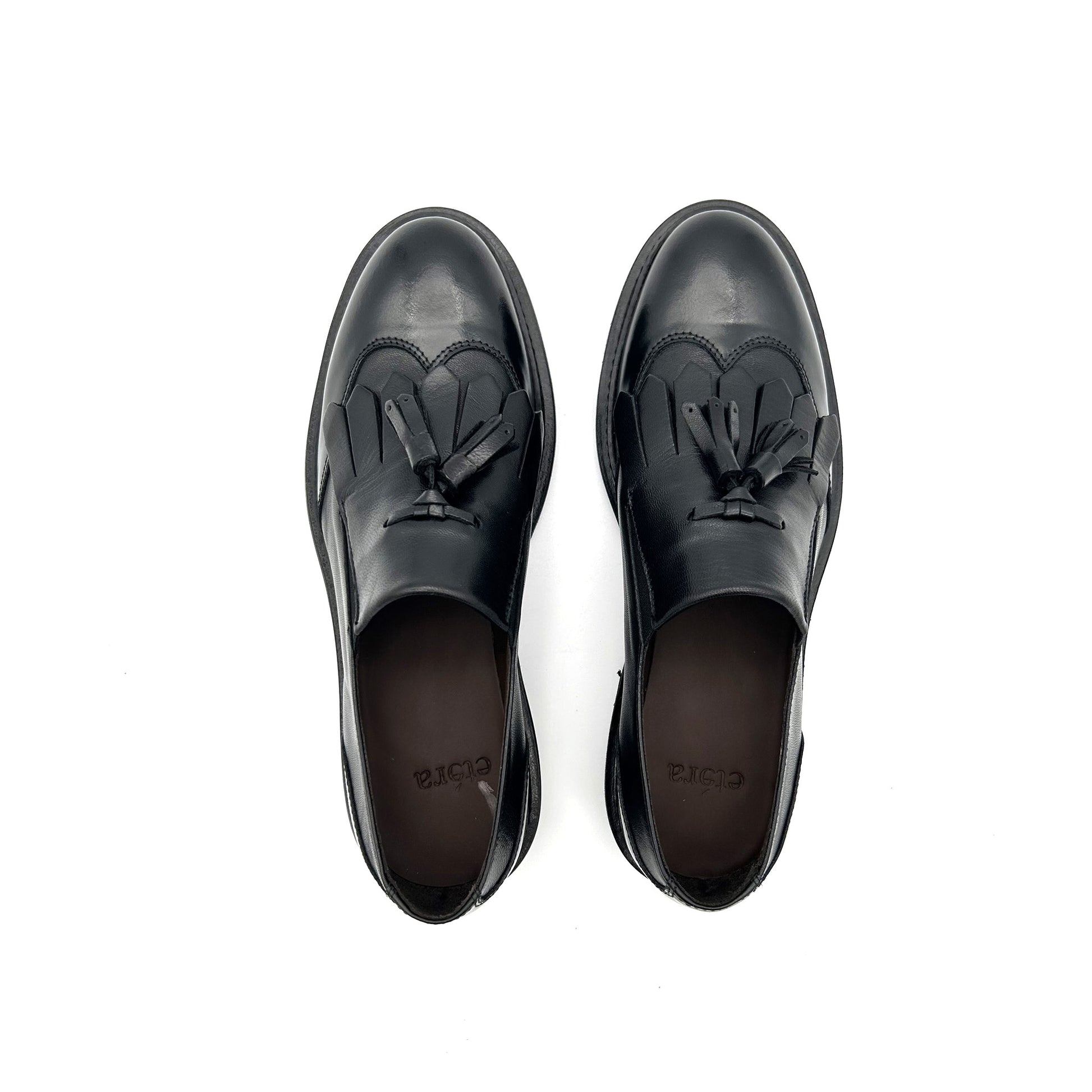 Scarpa dal richiamo maschile realizzata in pelle di vitello nero, con effetto anticato. La spazzolatura in punta e sul tallone conferiscono una particolare lucentezza a queste due parti. Molto attuali come stile le frange unite alle nappine. Due elastici ai lati del collo del piede rendono agevole e fasciante la calzata. Suola in gomma.