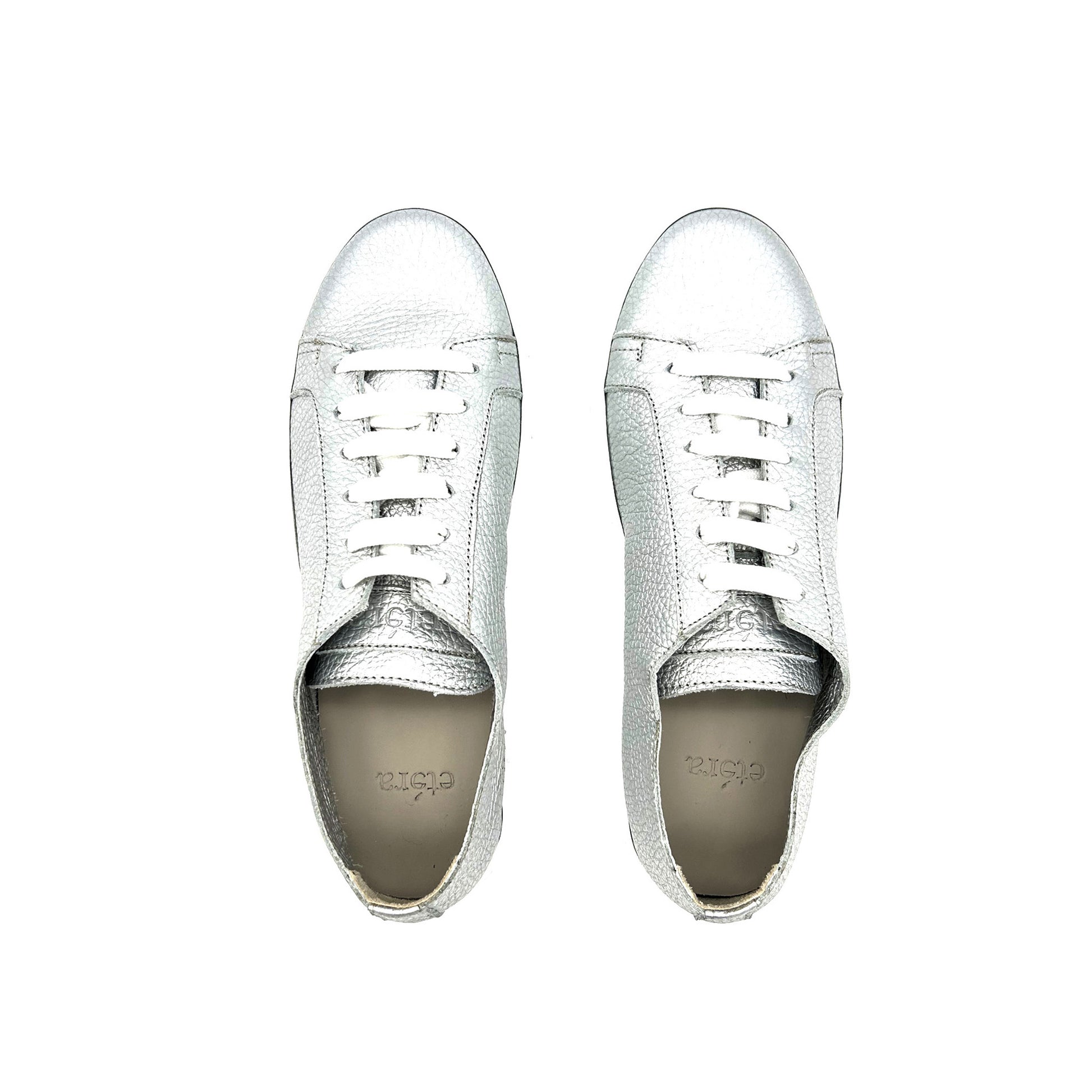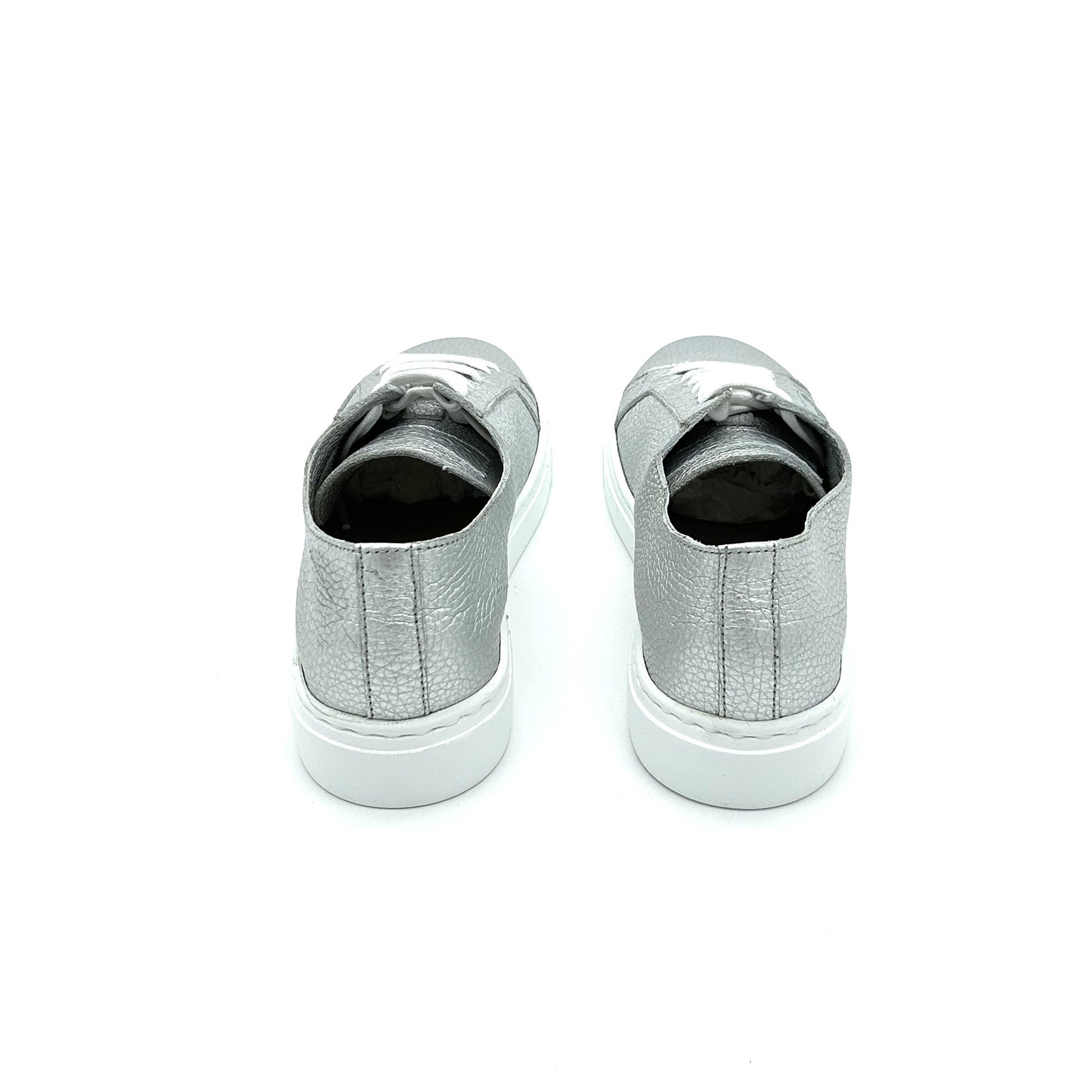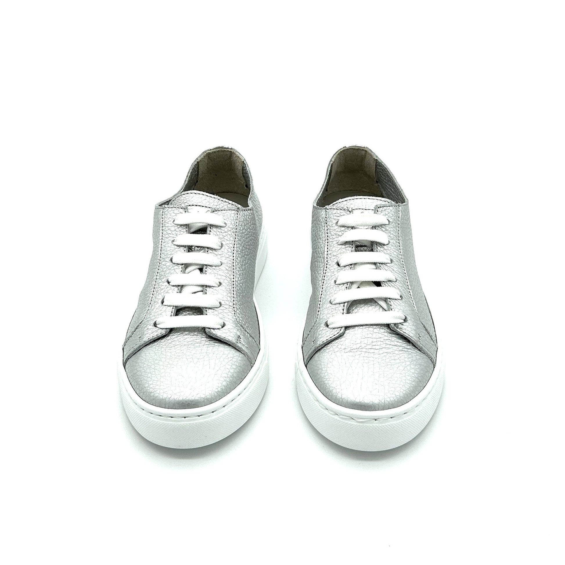 Sneaker realizzata in pelle di vitello martellata pieno fiore, la parte più esterna e pregiata, di colore argento. La scarpa è sfoderata internamente: è dunque visibile direttamente l'interno della pelle, mancando di fodera; ne consegue un modello estremamente fresco, avvolgente e leggero, ideale per la primavera-estate. Morbido plantare interno estraibile. Fondo a cassetta con suola in gomma ultralight per una scarpa dalla leggerezza unica.