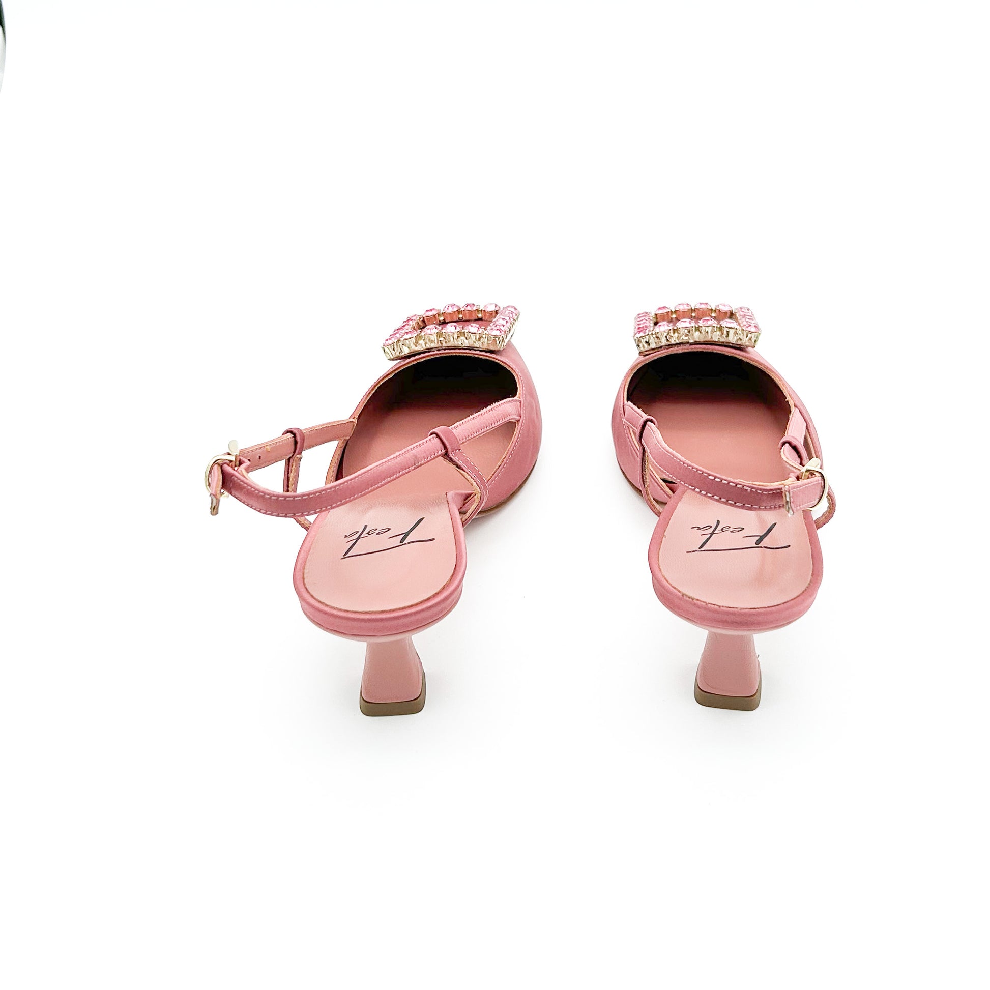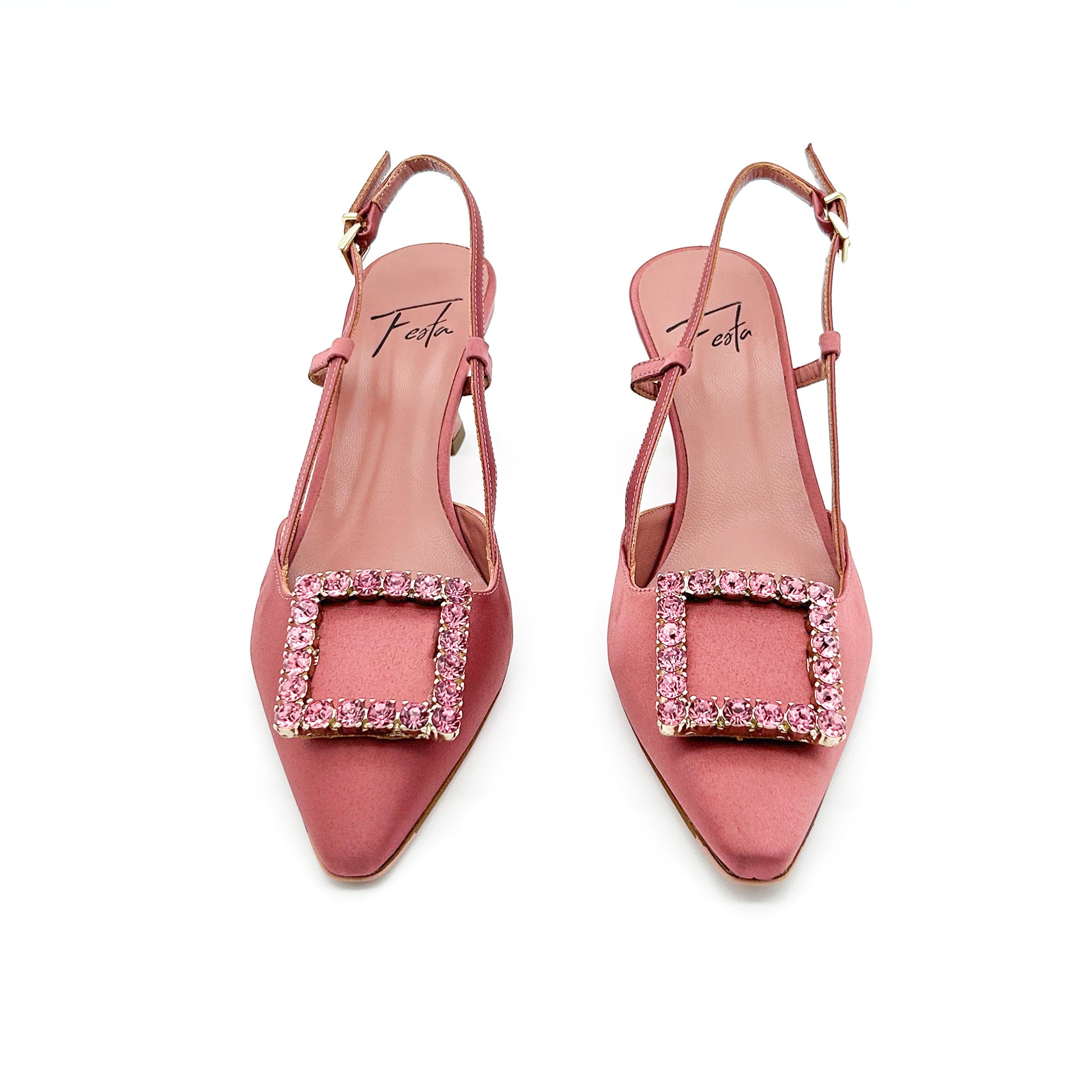 Slingback con tacco di 5,5cm realizzata in raso di colore rosa scuro. Cinturino al tallone con fibbia dorata. Sottopiede morbido in pelle leggermente imbottito. Suola in cuoio e gomma.