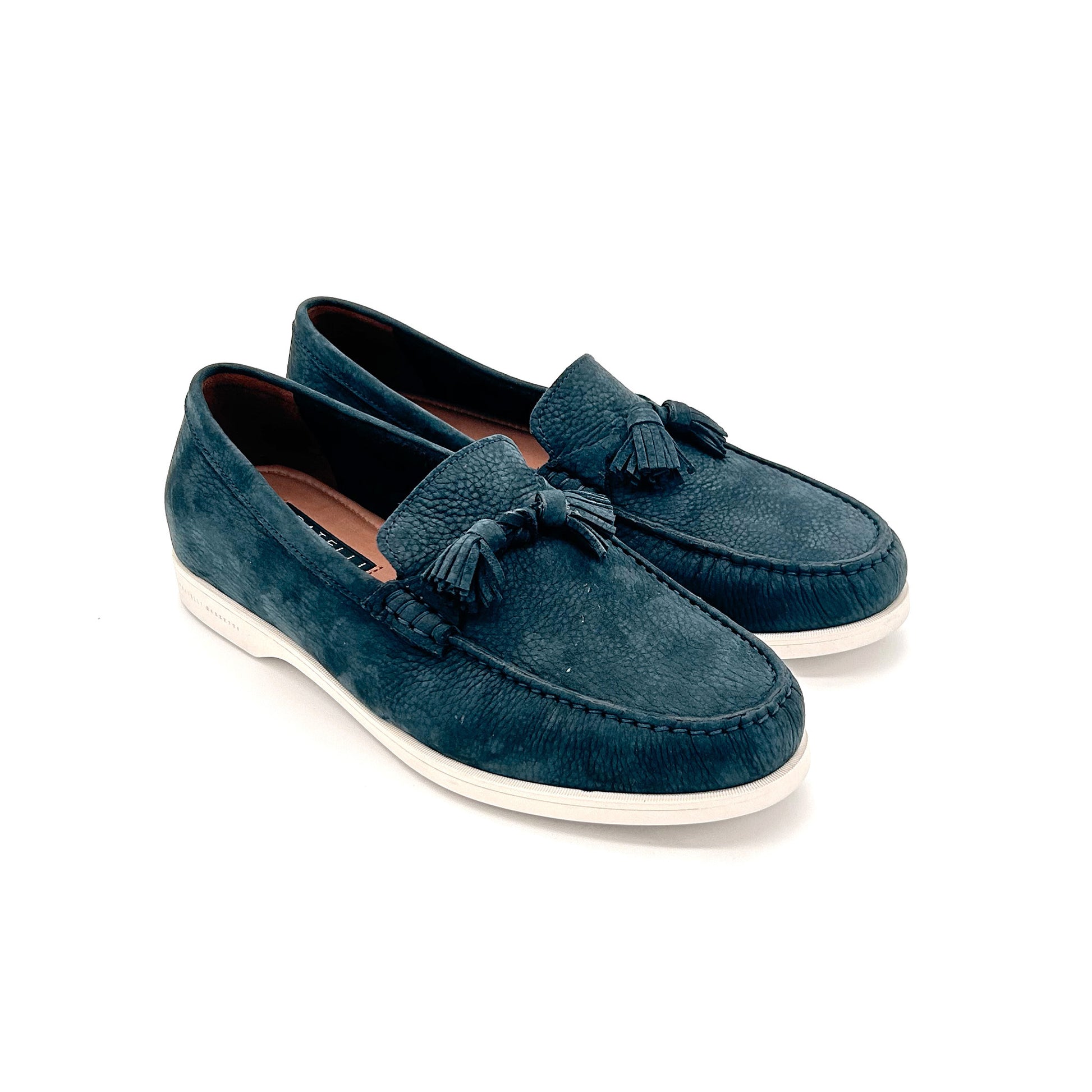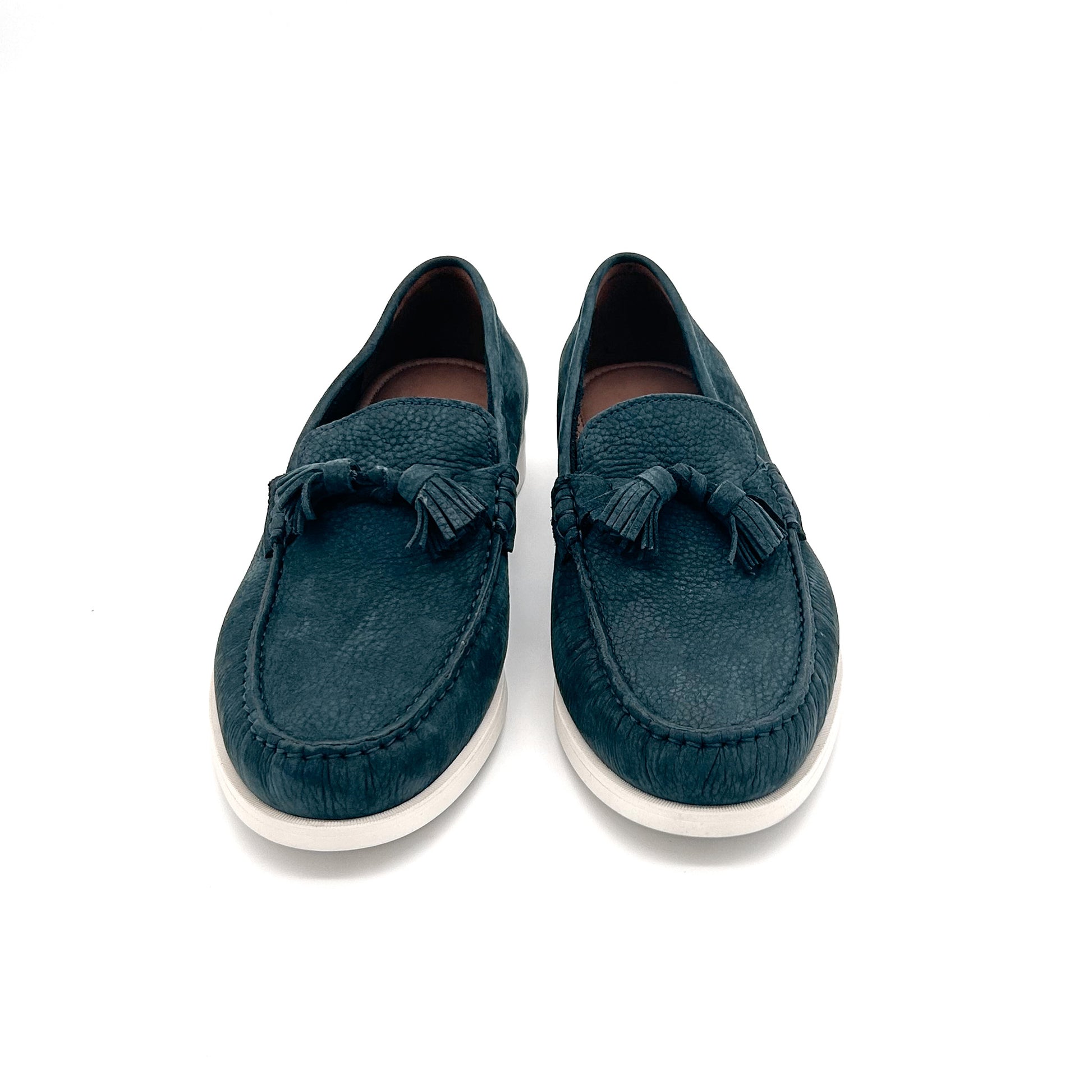 Mocassino con costruzione tubolare realizzato in morbida pelle di colore blu con grana visibile effetto nabuck. Calzatura estremamente versatile e ricercata. Fondo in gomma in colore a contrasto.