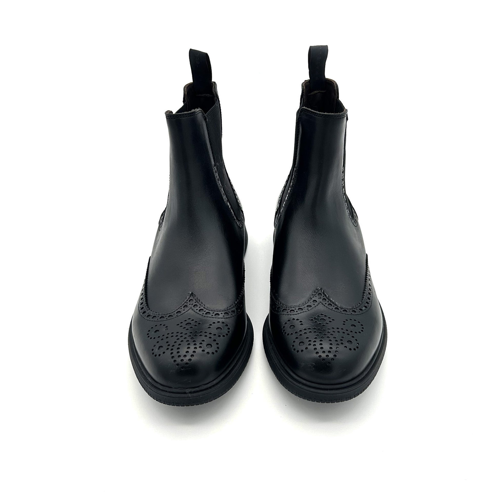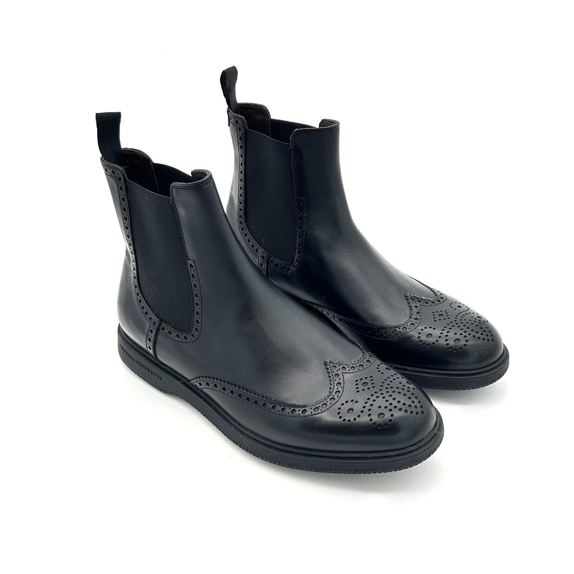 Chelsea boot, con lavorazione brogue, che combina un design contemporaneo alle linee tradizionali ispirate alle calzature anglosassoni. La tomaia, arricchita da bucature e frastagli, è realizzata in pelle color nero. Nuova suola in gomma più sottile e leggera rispetto al modello classico, personalizzata con grip antiscivolo, che rende questo stivaletto leggermente più casual.