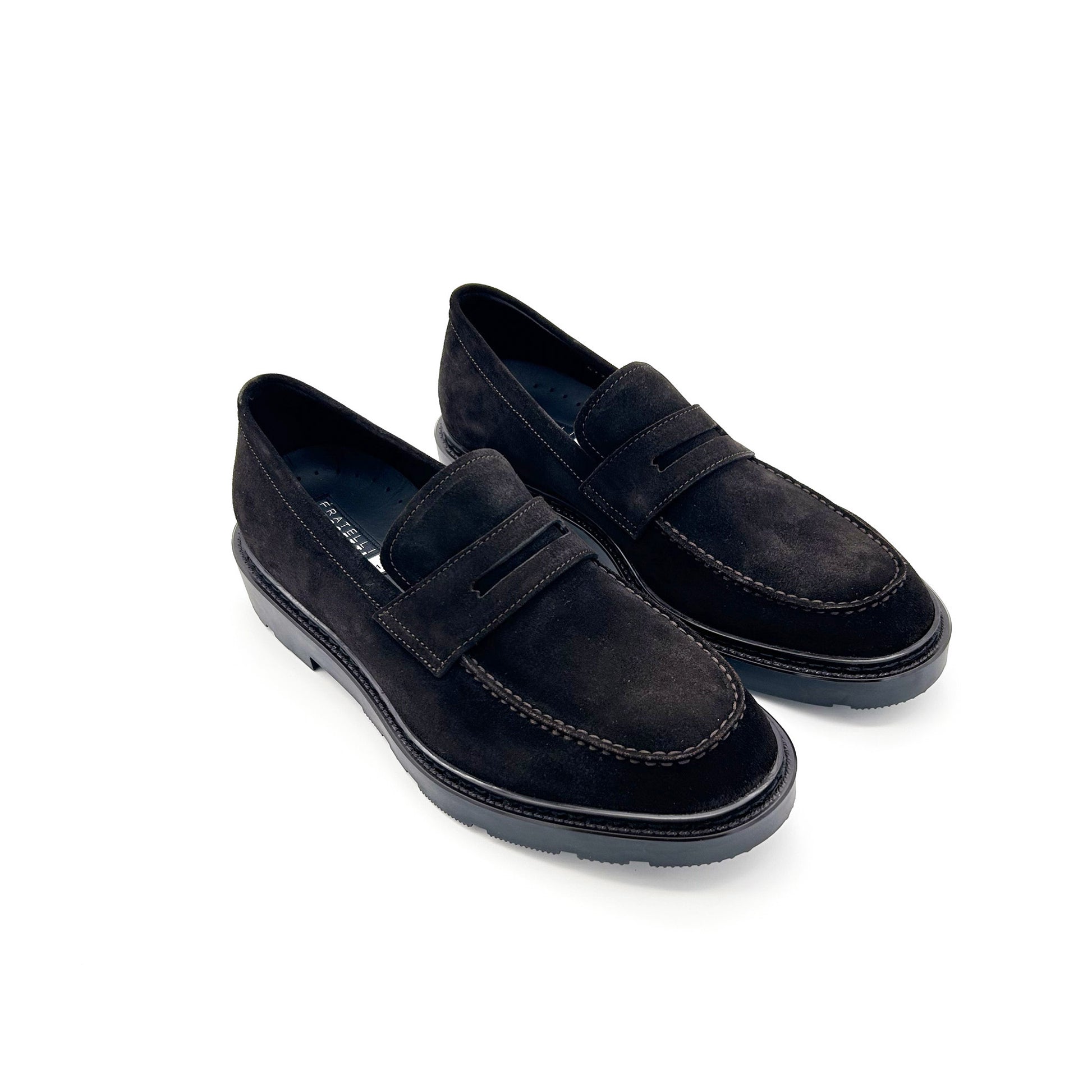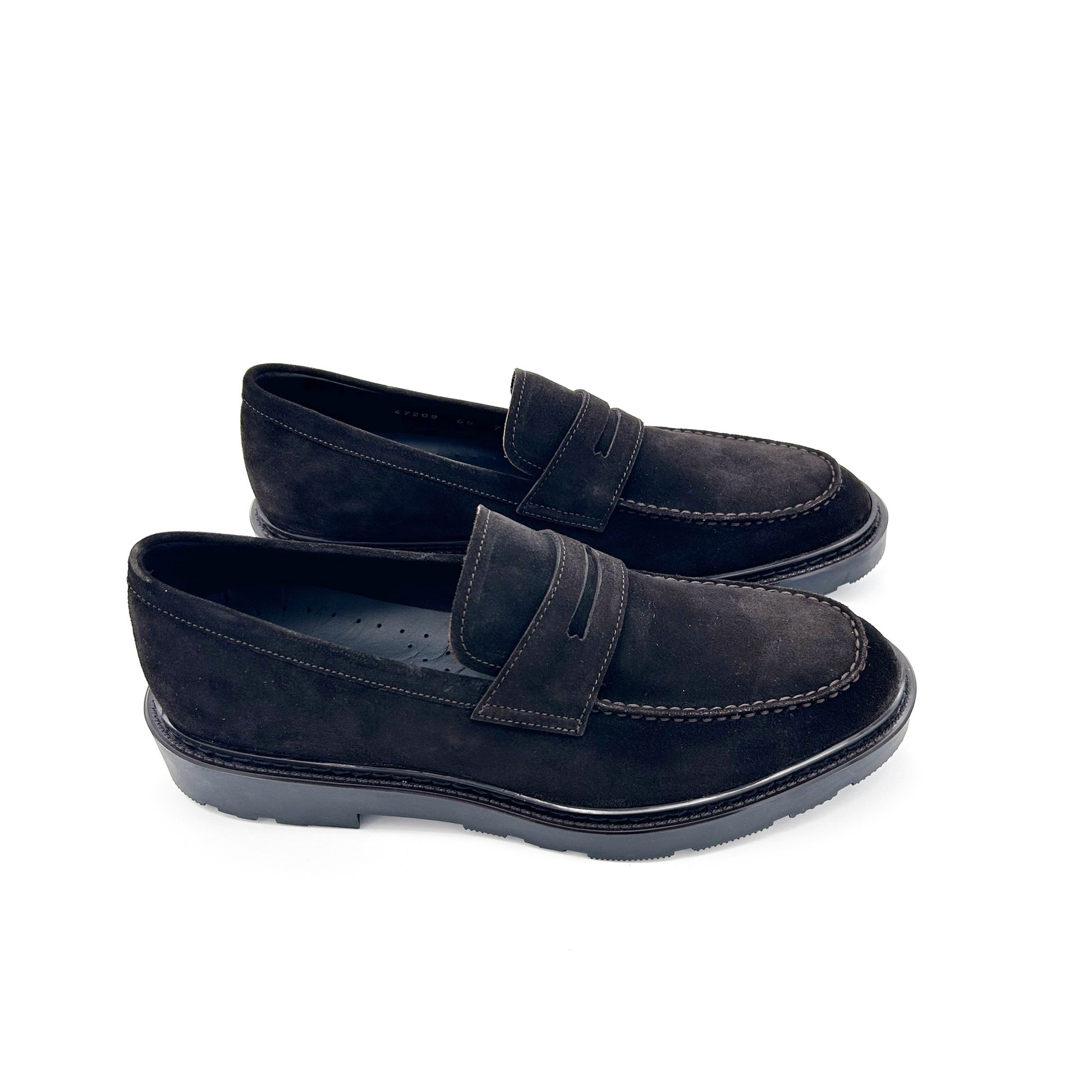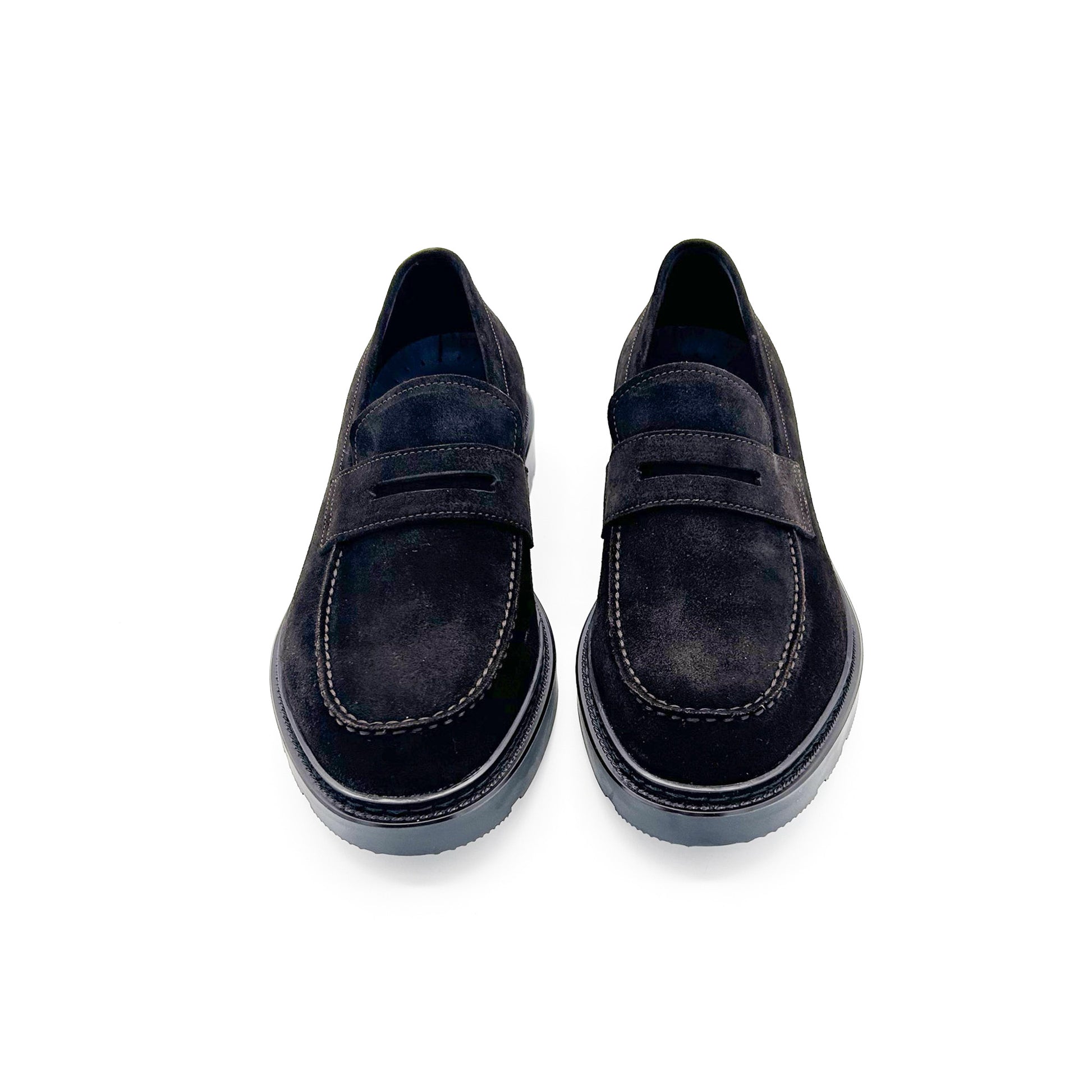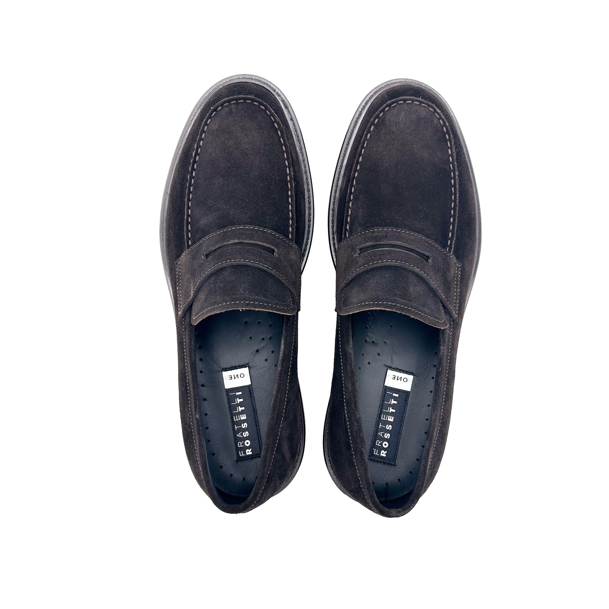 Mocassino con fascetta realizzato in pelle scamosciata testa di moro con leggero effetto anticato. Calzatura classica nello stile, formale ed esclusiva nelle lavorazioni. Soletta interna estraibile e traspirante. Suola realizzata in gomma leggera e resistente con guardolo cucito a mano.