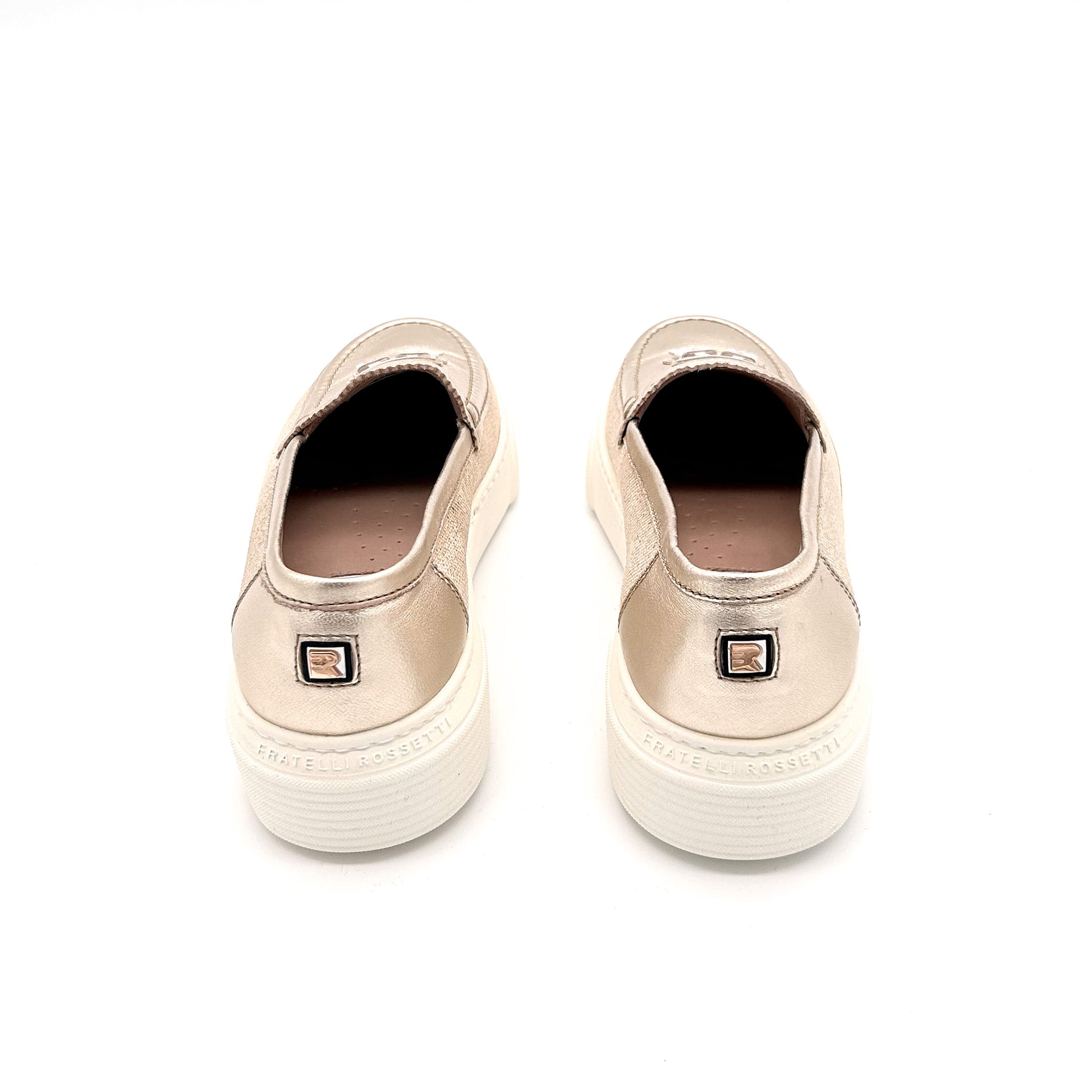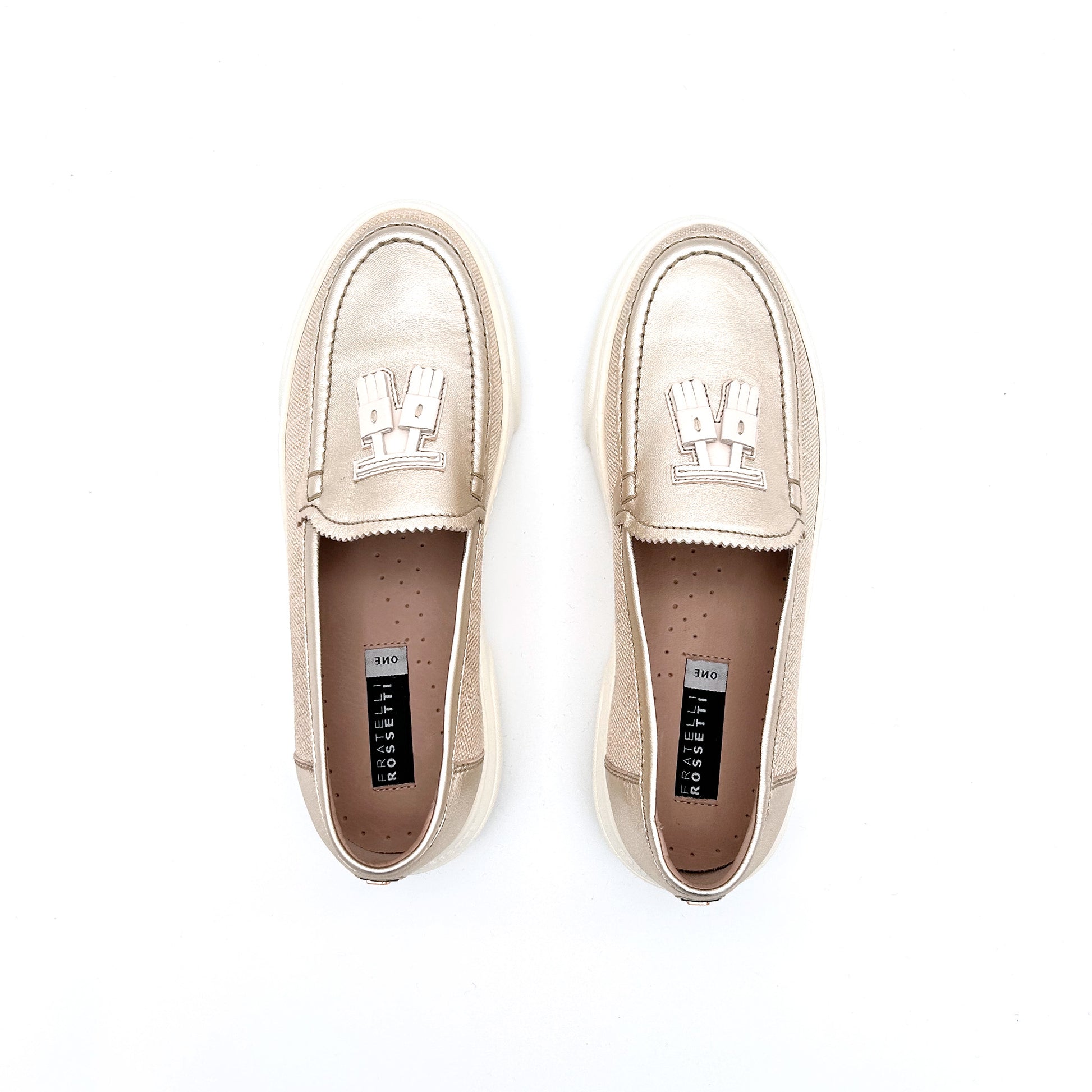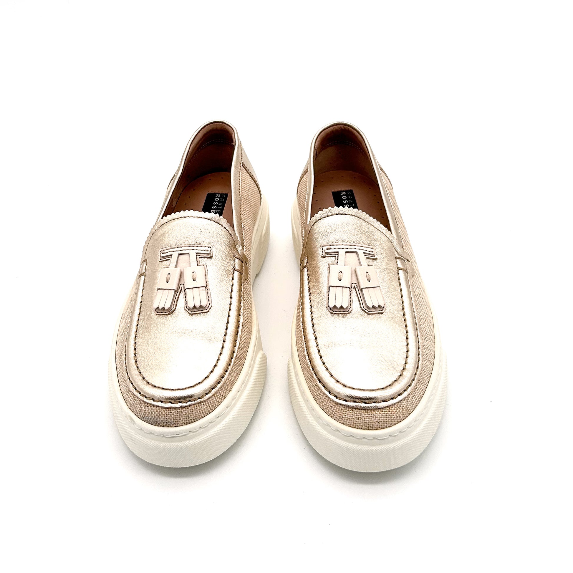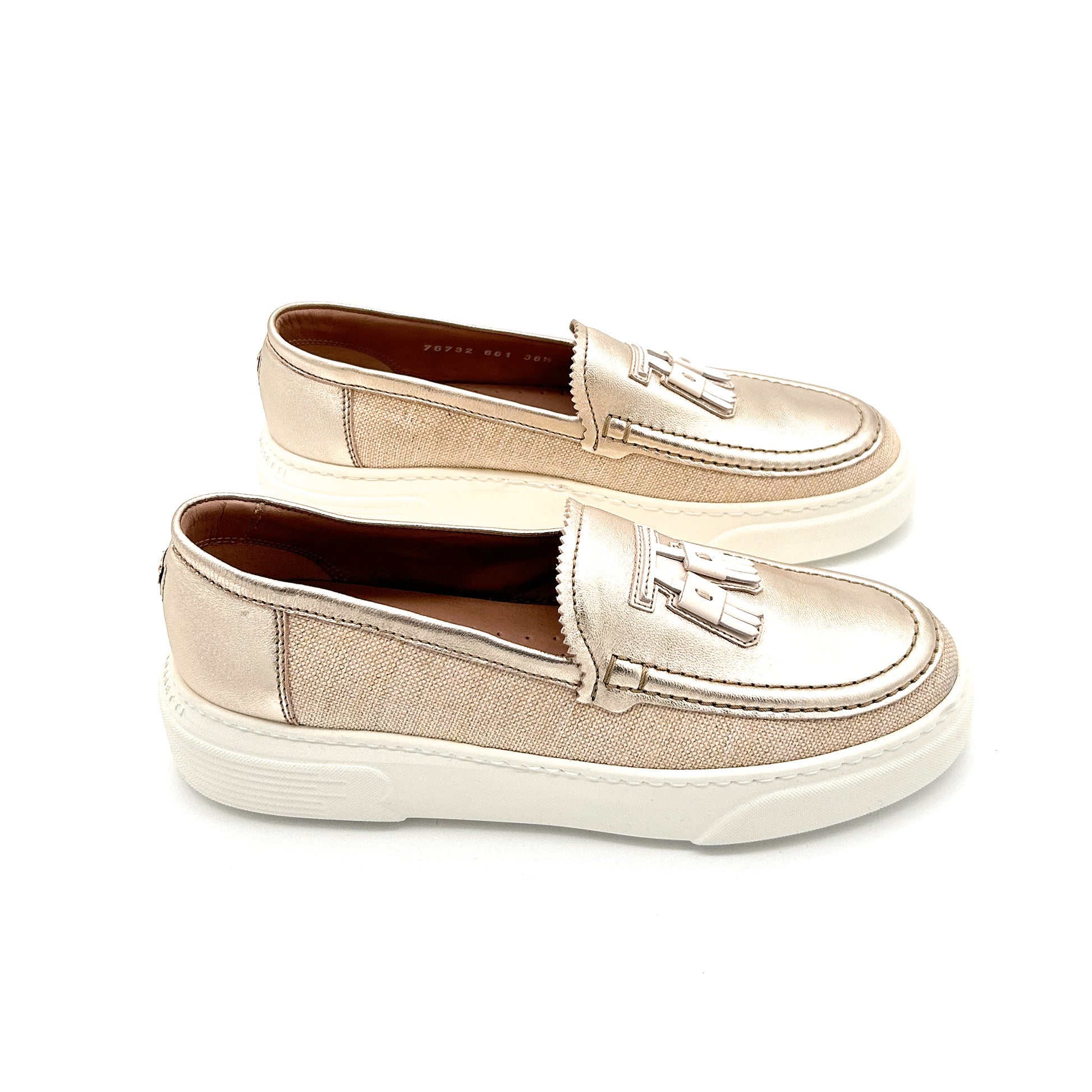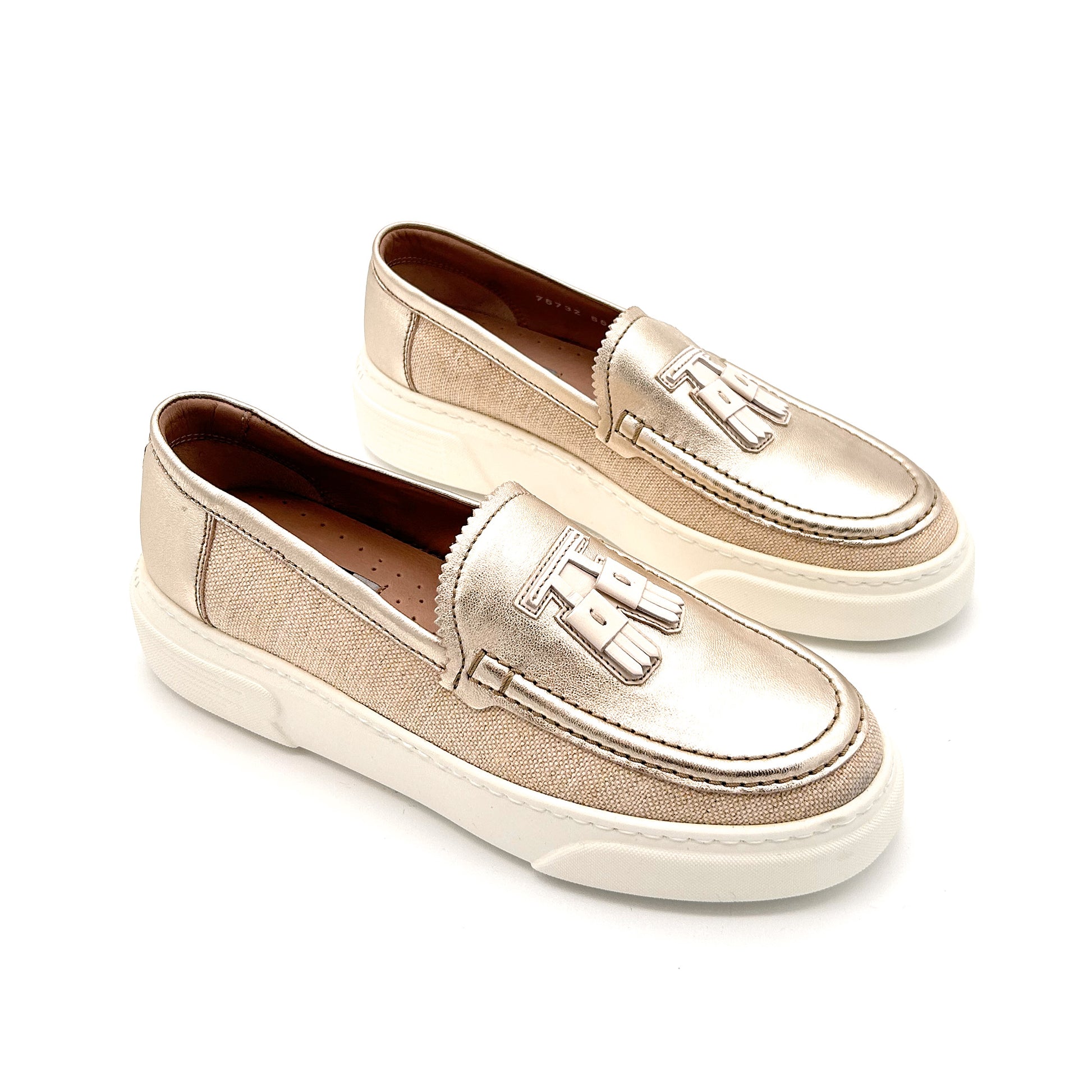 Mocassino in versione sneaker realizzato in pelle metallizzata di colore oro. La tomaia in lino beige dorato sui bordi e in punta la rende fresca ed estiva. Le iconiche nappine cucite in rilievo caratterizzano questa calzatura dal look metropolitano. Suola a cassetta con dettaglio laterale logato, realizzata in gomma leggera. Soletta interna estraibile e traspirante.