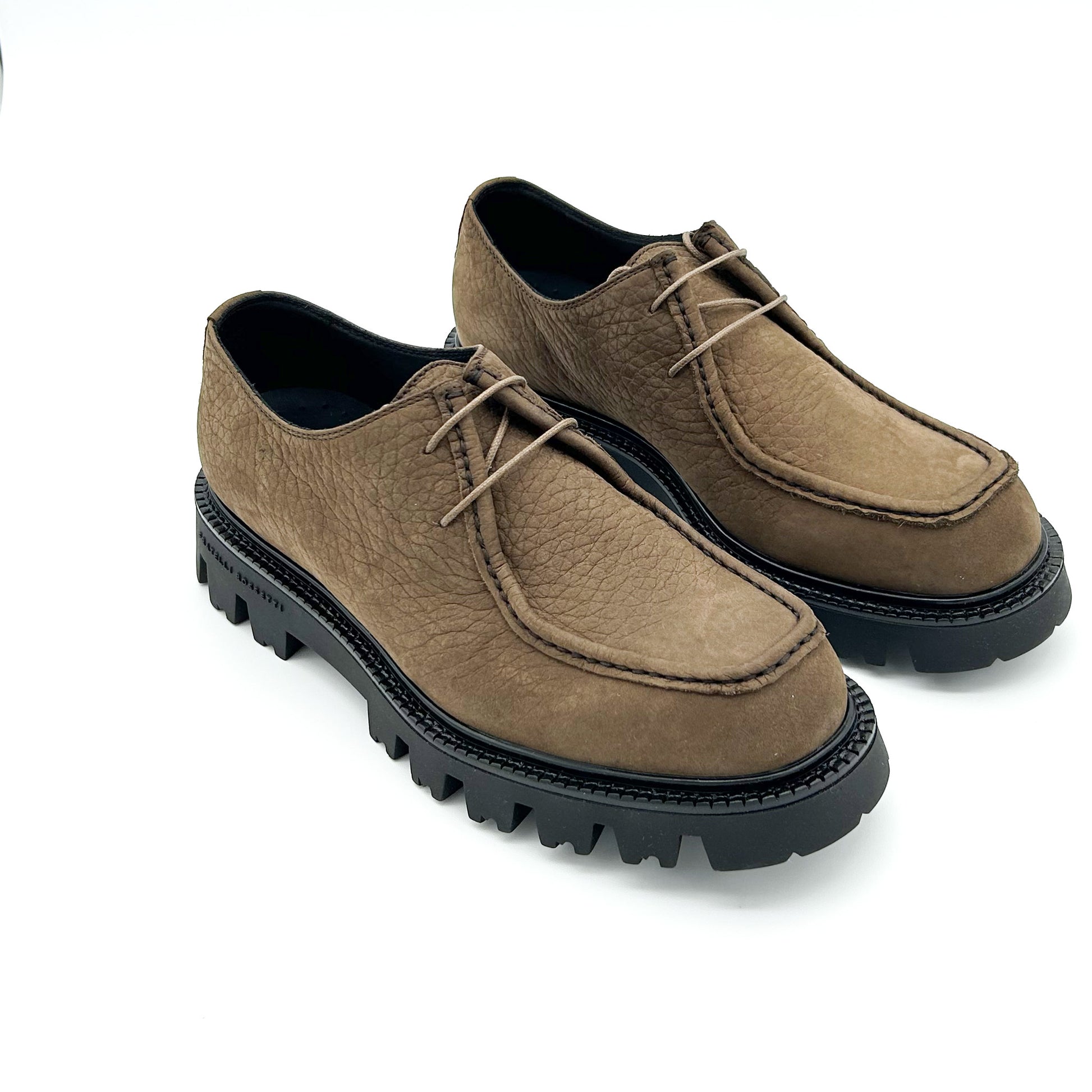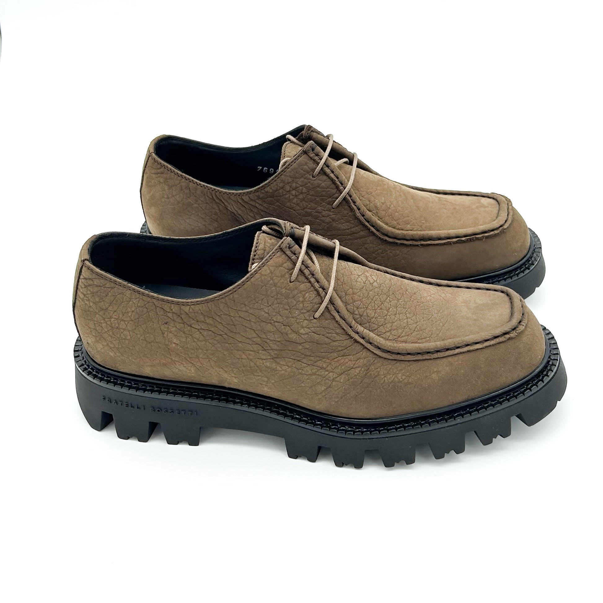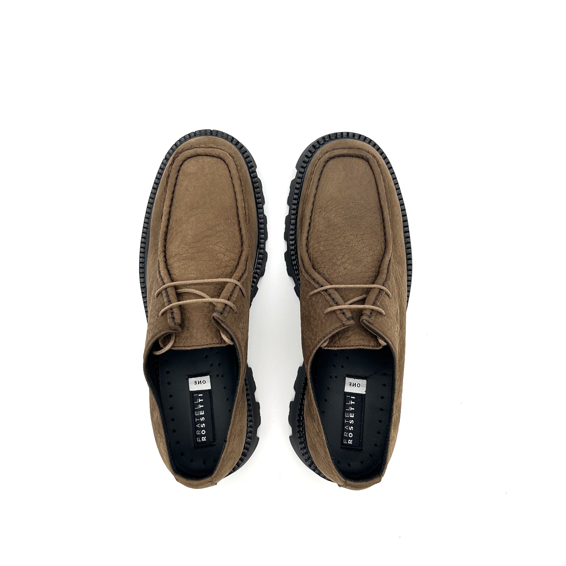 Derby dalla forma quadrata realizzato in morbida pelle nabuck color tapue con trattamento idrorepellente. Calzatura mannish caratterizzata dal dettaglio di cuciture sul puntale. Soletta interna estraibile. Suola carro in gomma extra light per un look grintoso.