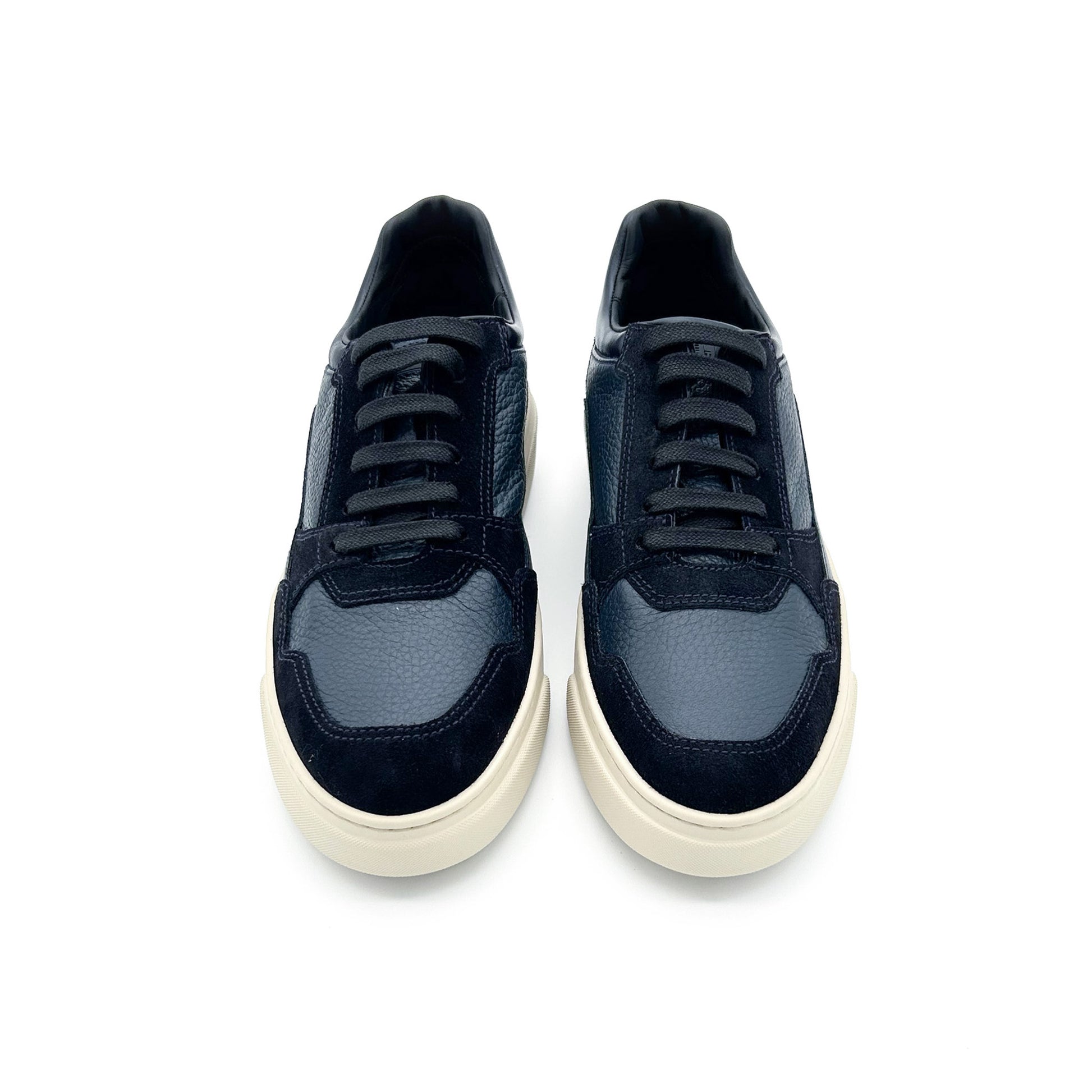Look dinamico e metropolitano per la sneaker realizzata in morbido suede blu abbinato a raffinata pelle di cervo in tono. La suola a cassetta in gomma leggera e flessibile, con battistrada personalizzato, riporta sul laterale il monogramma del Brand.