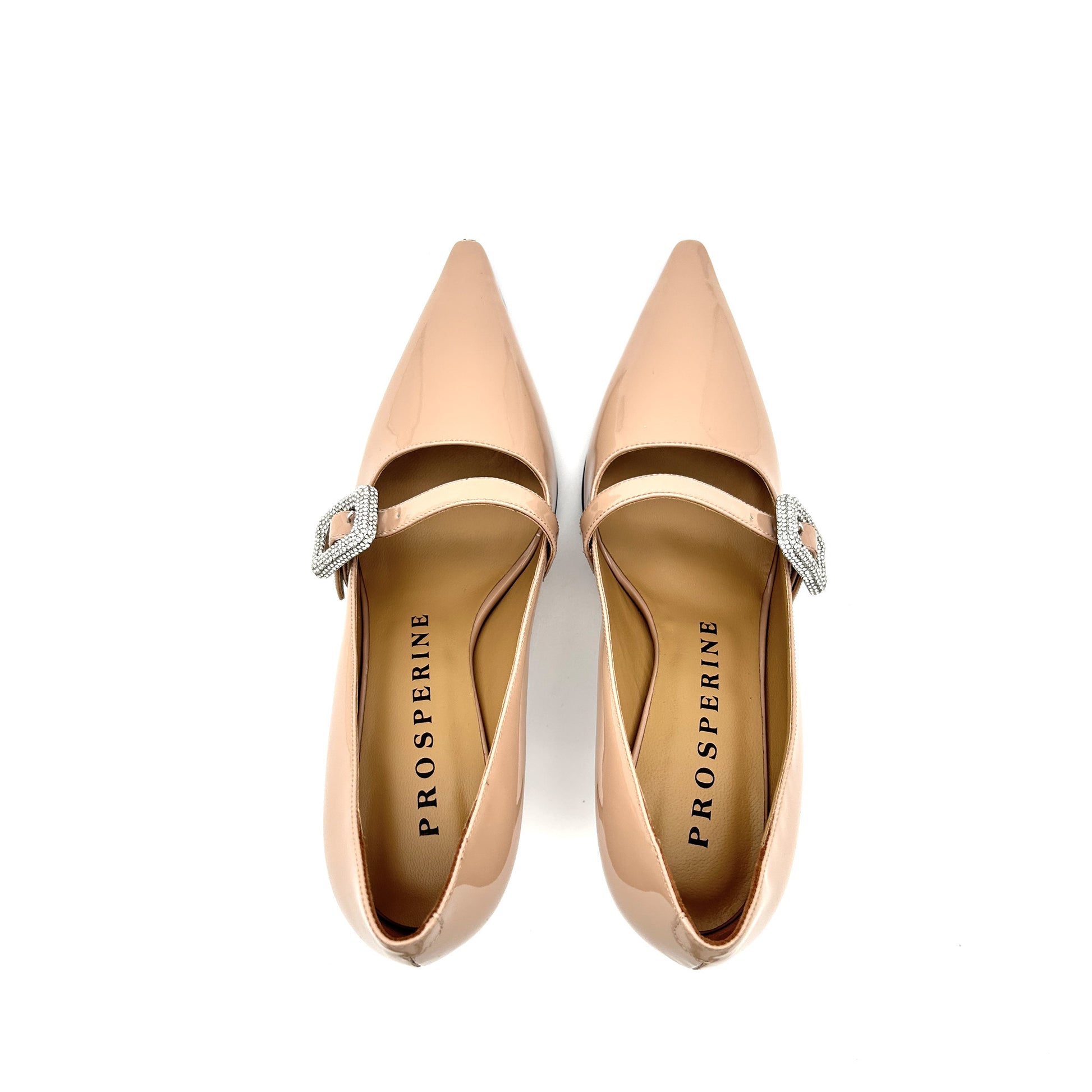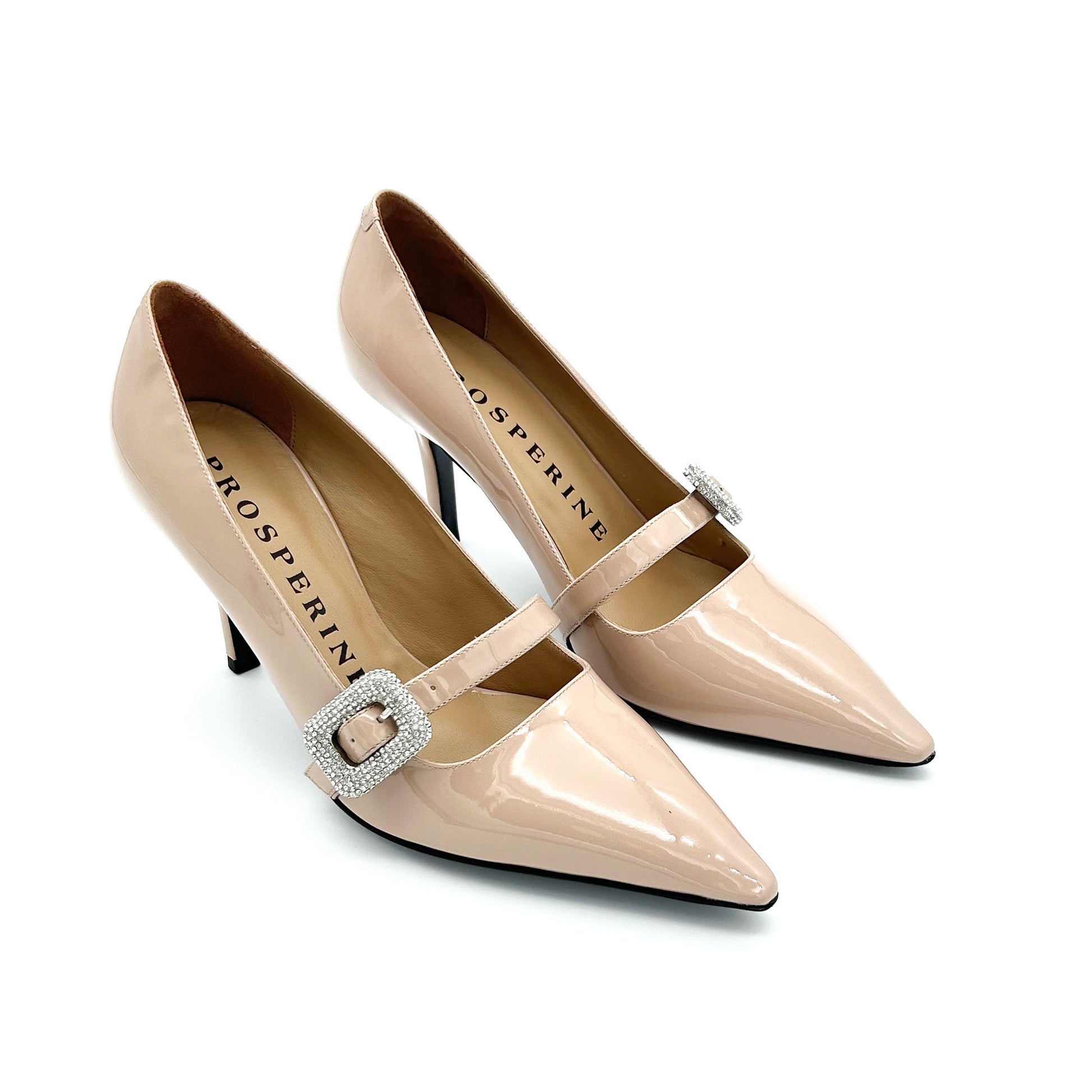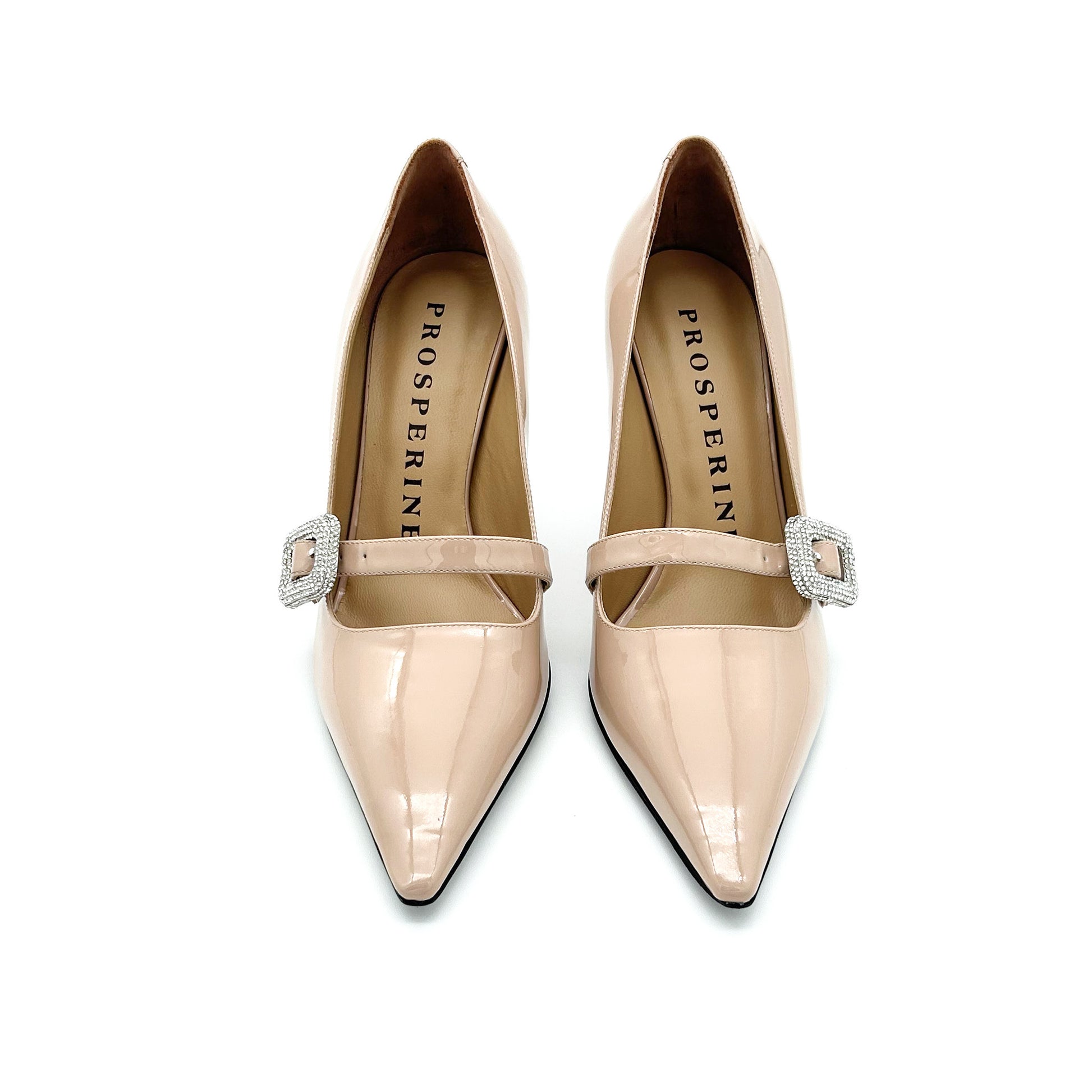 Décolleté realizzata in pelle verniciata di colore rosa cipria con tacco di 7,5cm. Cinturino in vernice tono su tono con blasone Swarovski. Morbido sottopiede in pelle. Suola in cuoio con parte davanti in gomma antiscivolo.