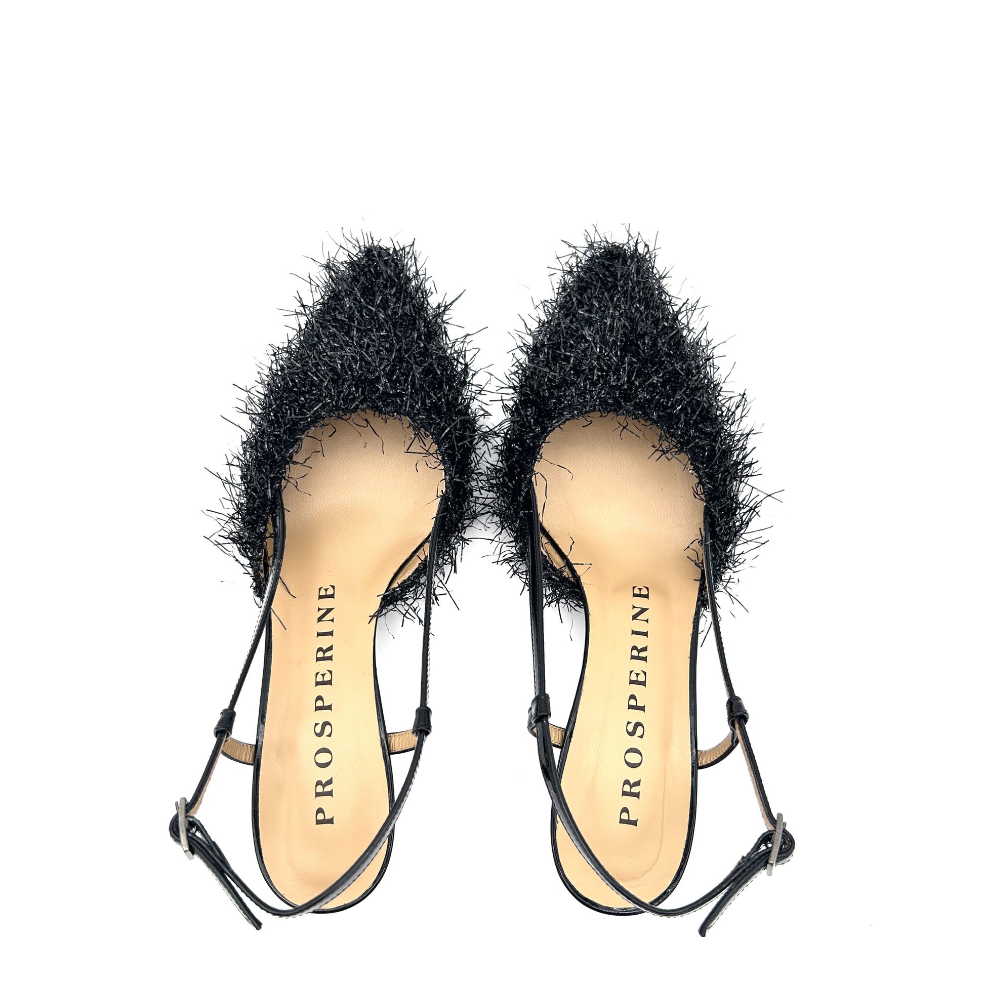 Slingback realizzata in tessuto charleston nero con tacco di 5,5cm. Cinturino in vernice nera al tallone. Morbido sottopiede in pelle. Suola in cuoio con parte davanti in gomma antiscivolo.