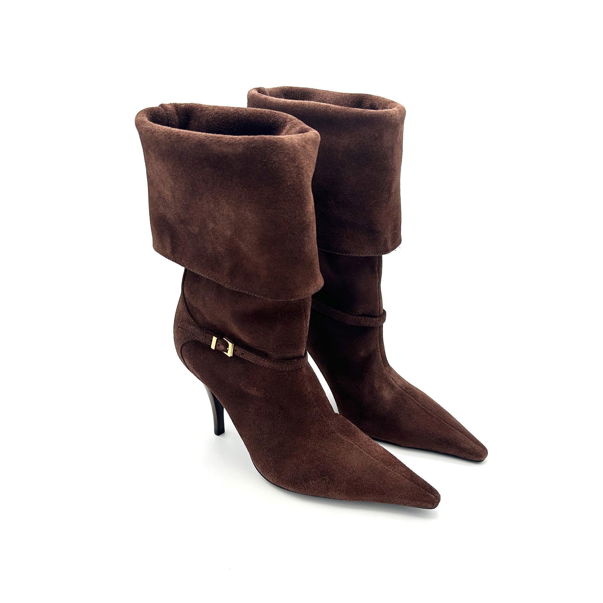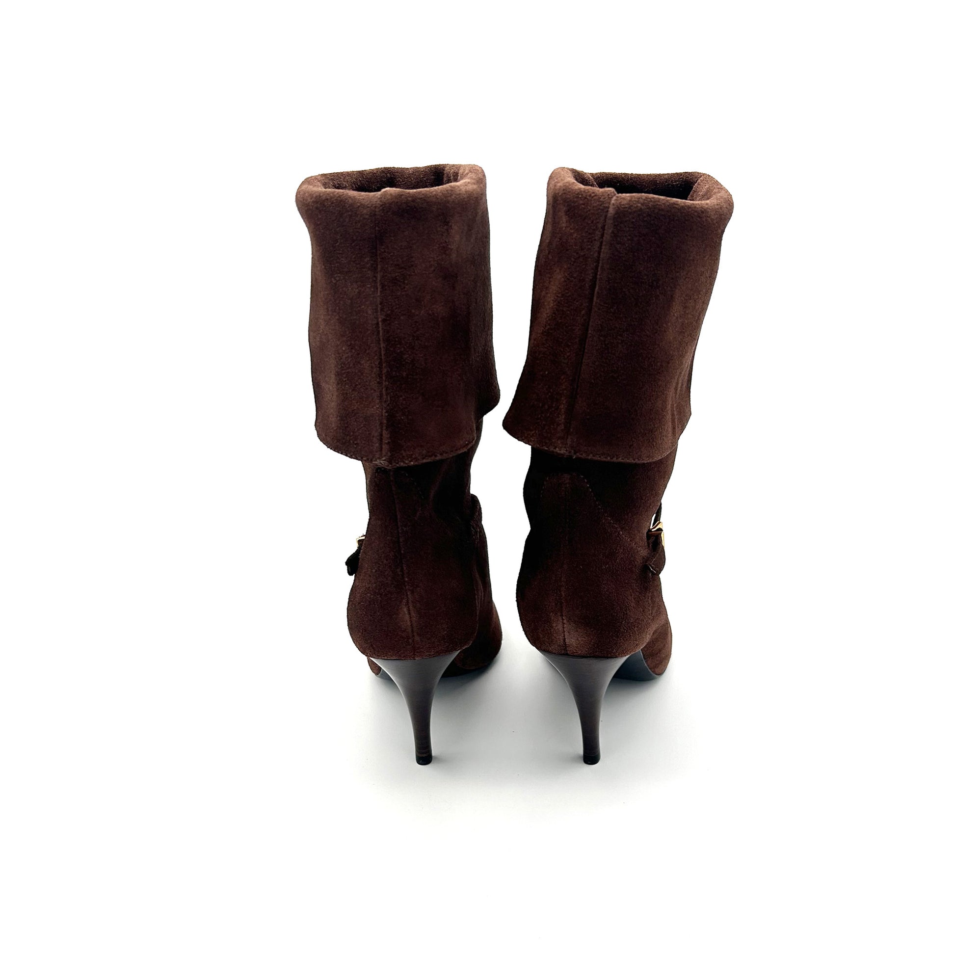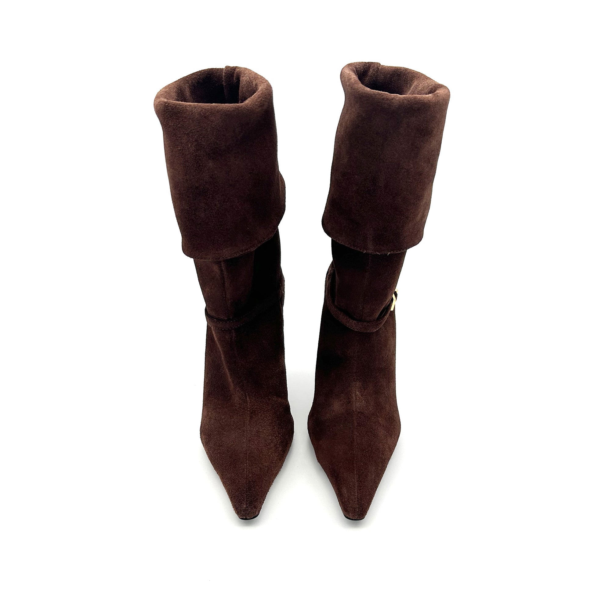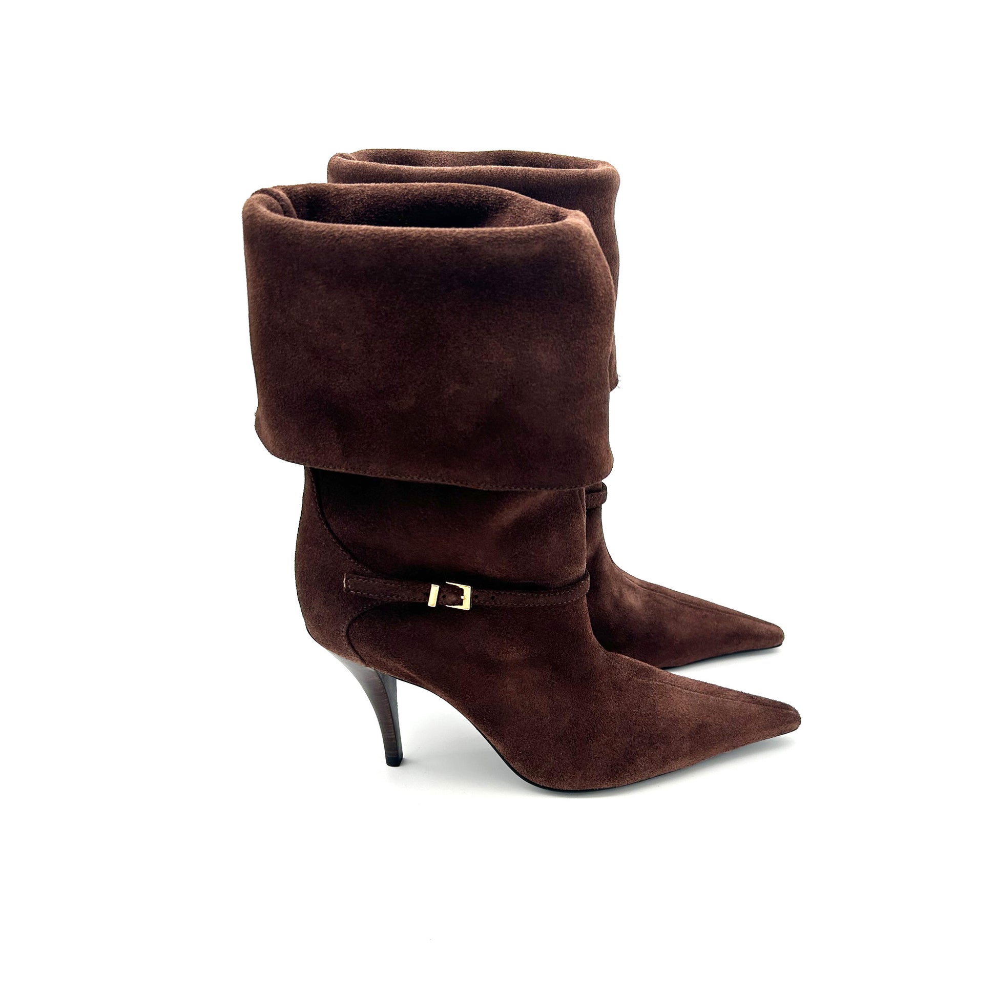 Questo stivale color cioccolato non nasce per mimetizzarsi: con il suo risvolto audace, il tacco a spillo e la fibbia alla moda ha la grinta giusta per uno stile metropolitano. Perfetto con un denim o con un orlo che sfiora la coscia per far risaltare la sua silhouette.
